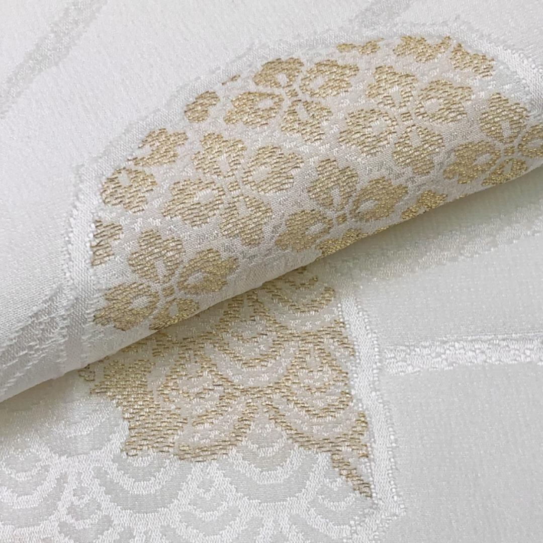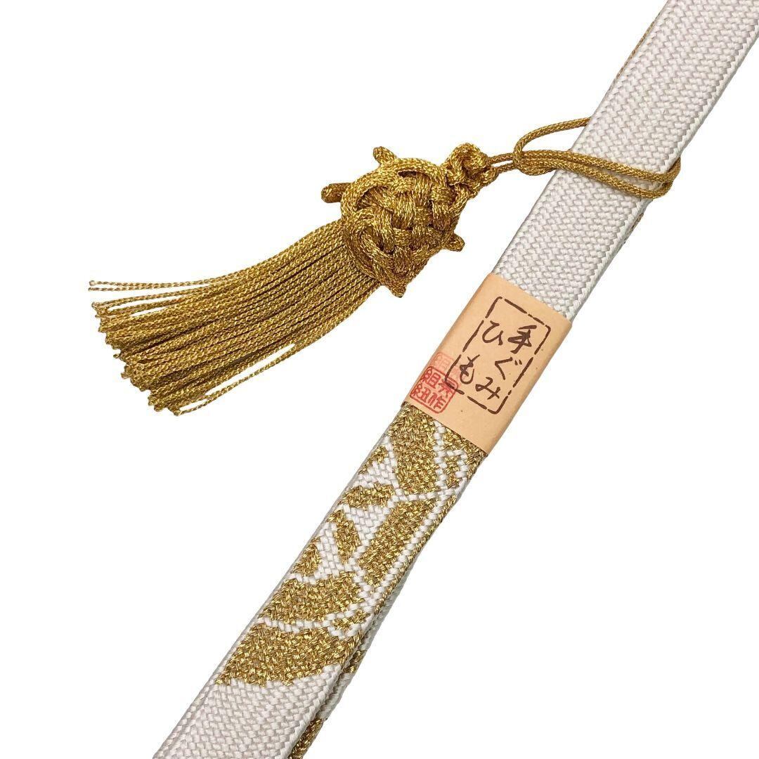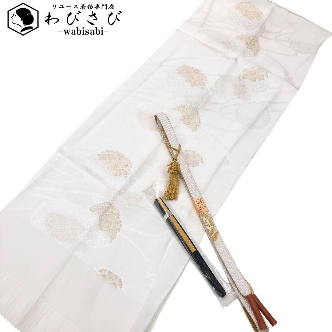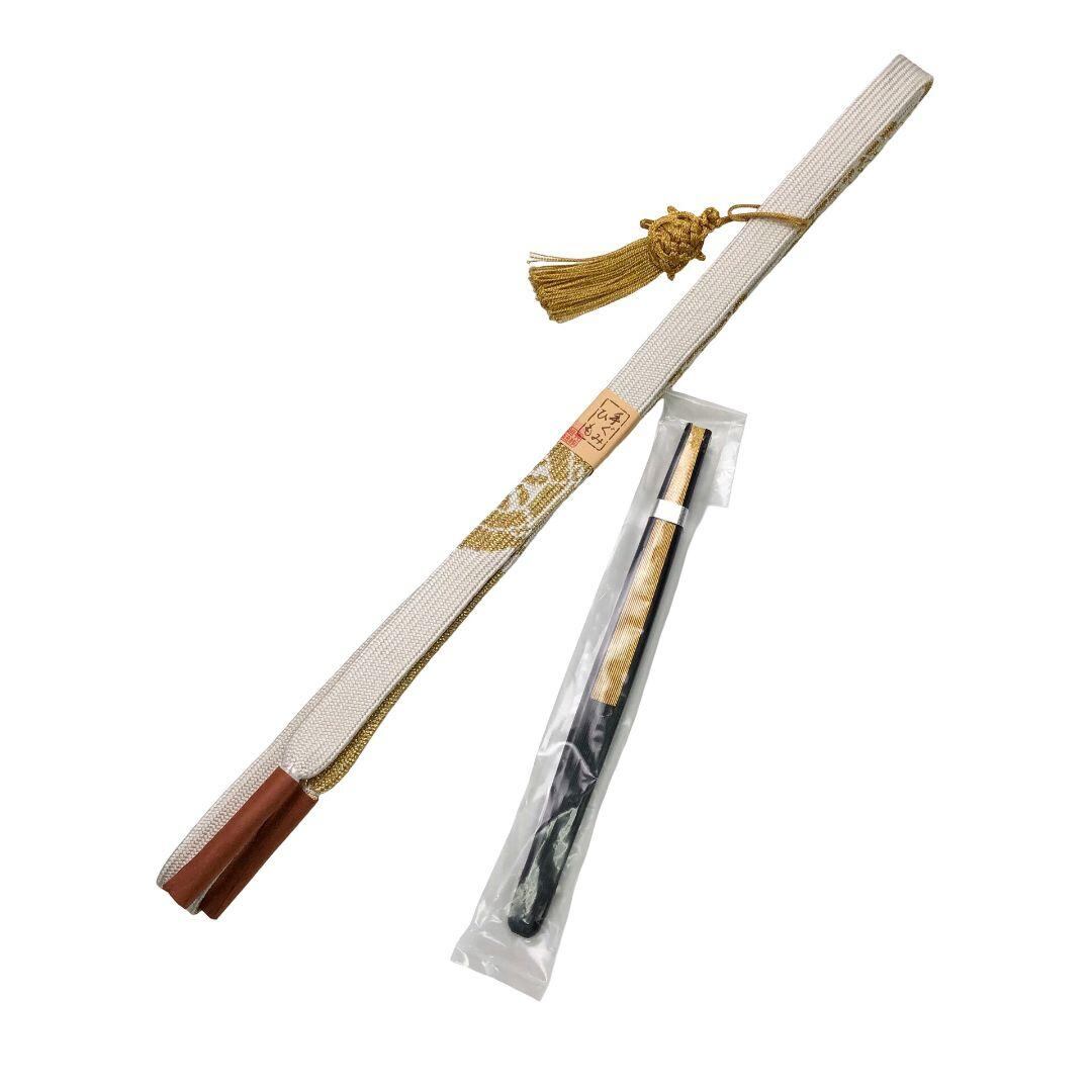 乳白色のお色味の綸子の帯揚げ、高麗組の帯締めに扇子の素敵なお品でございます。