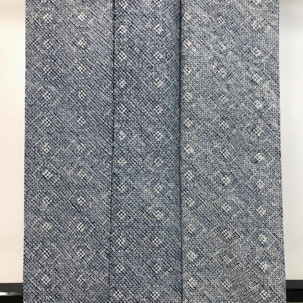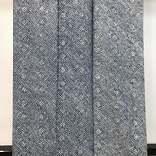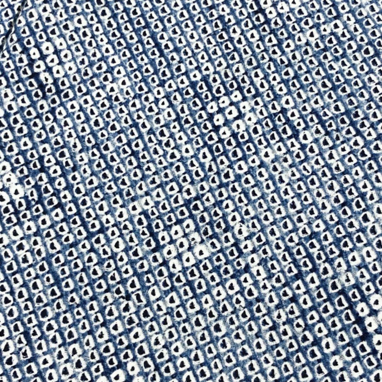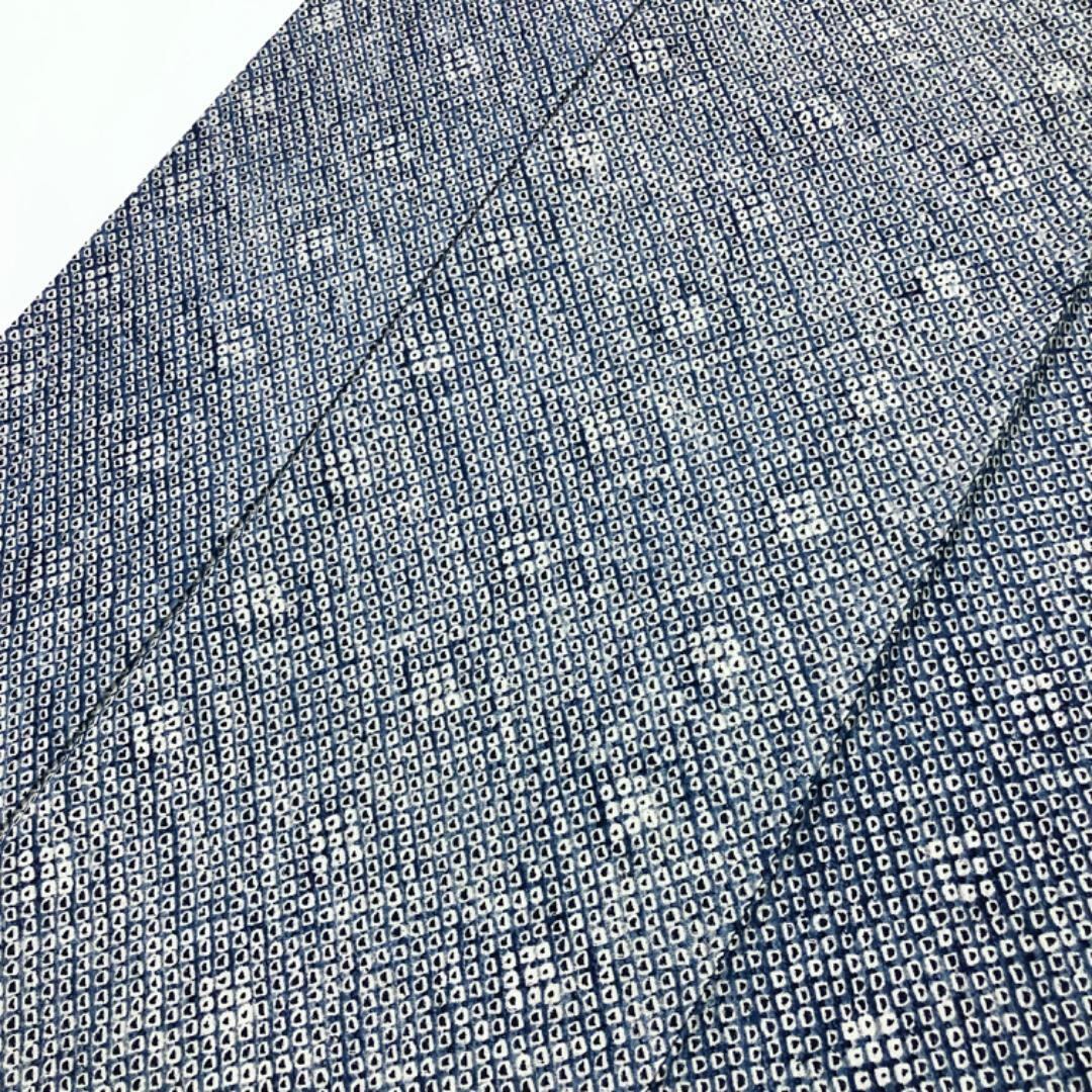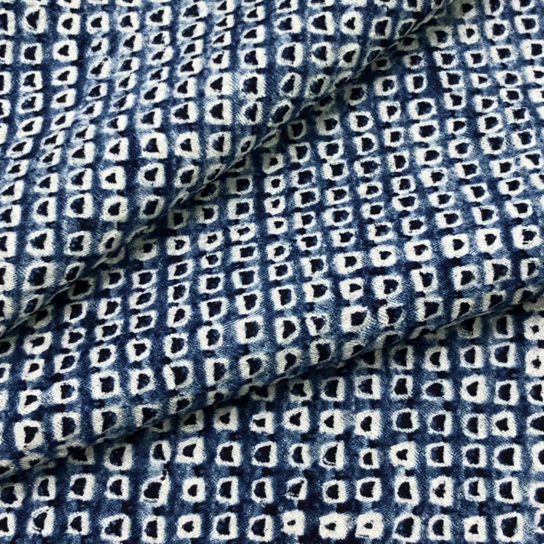 紺桔梗色の雰囲気の良い藍染のお色味に遠目で浮かび上がる染色の濃淡で抽象模様がデザインされた大変手のかかった素敵なお品でございます。