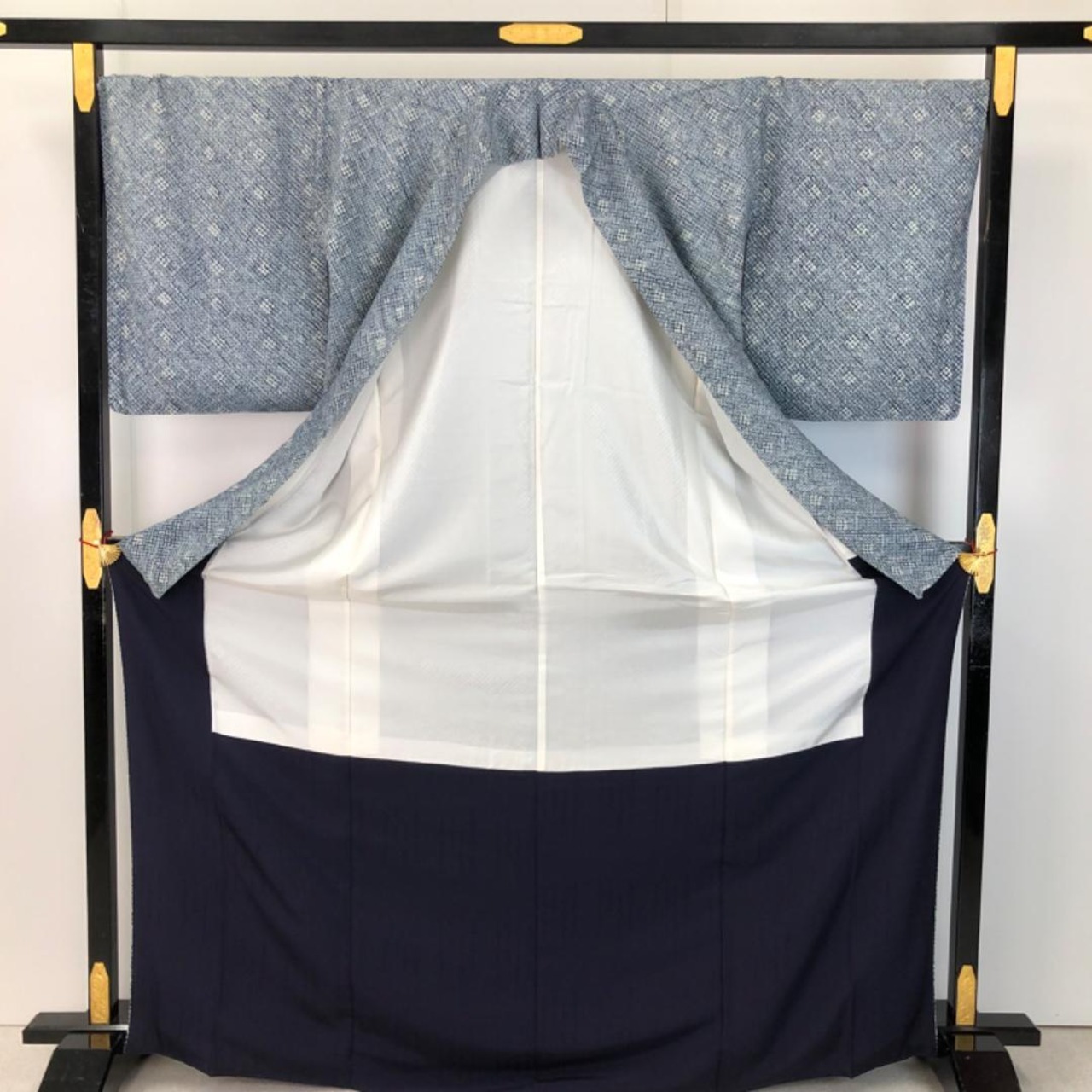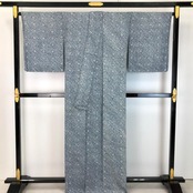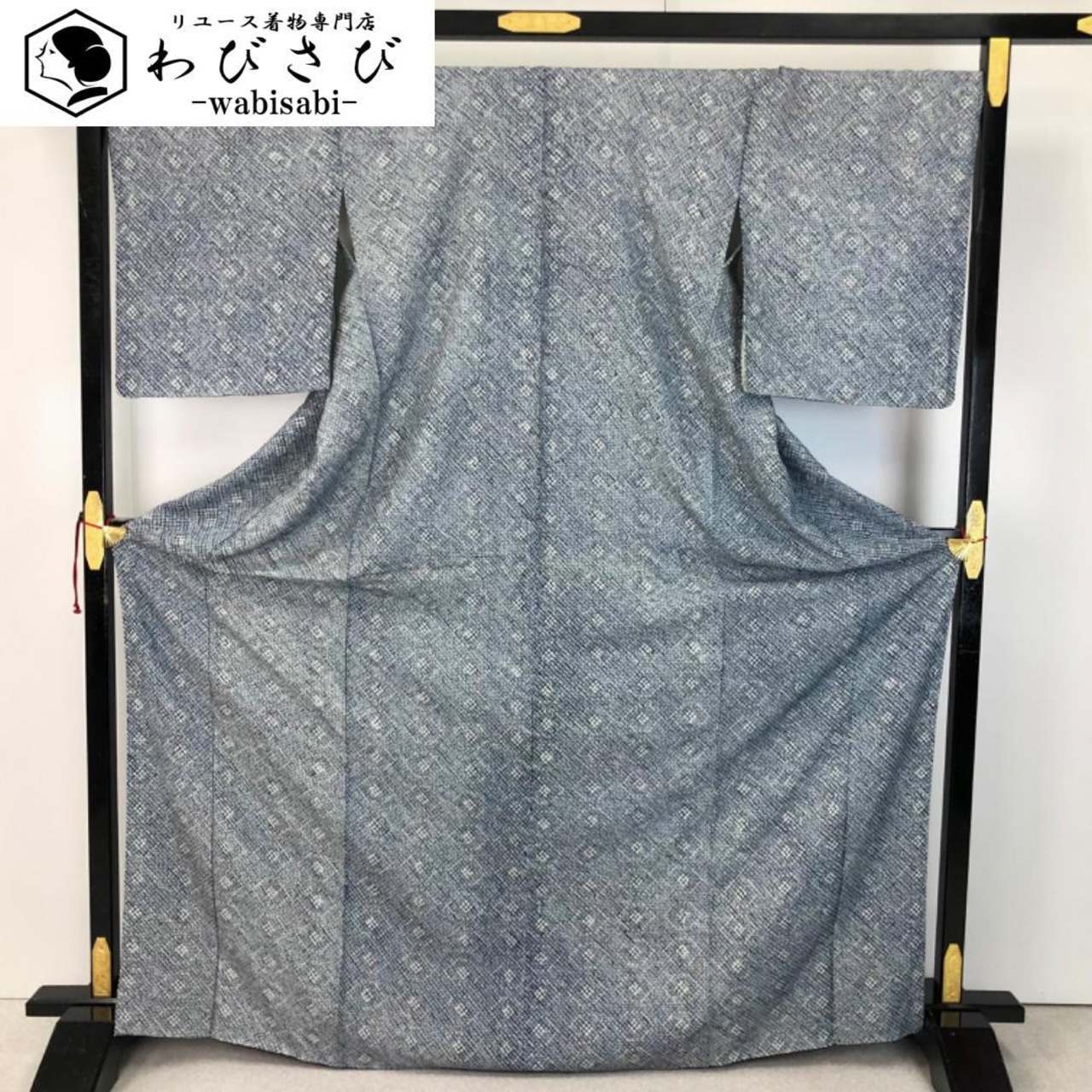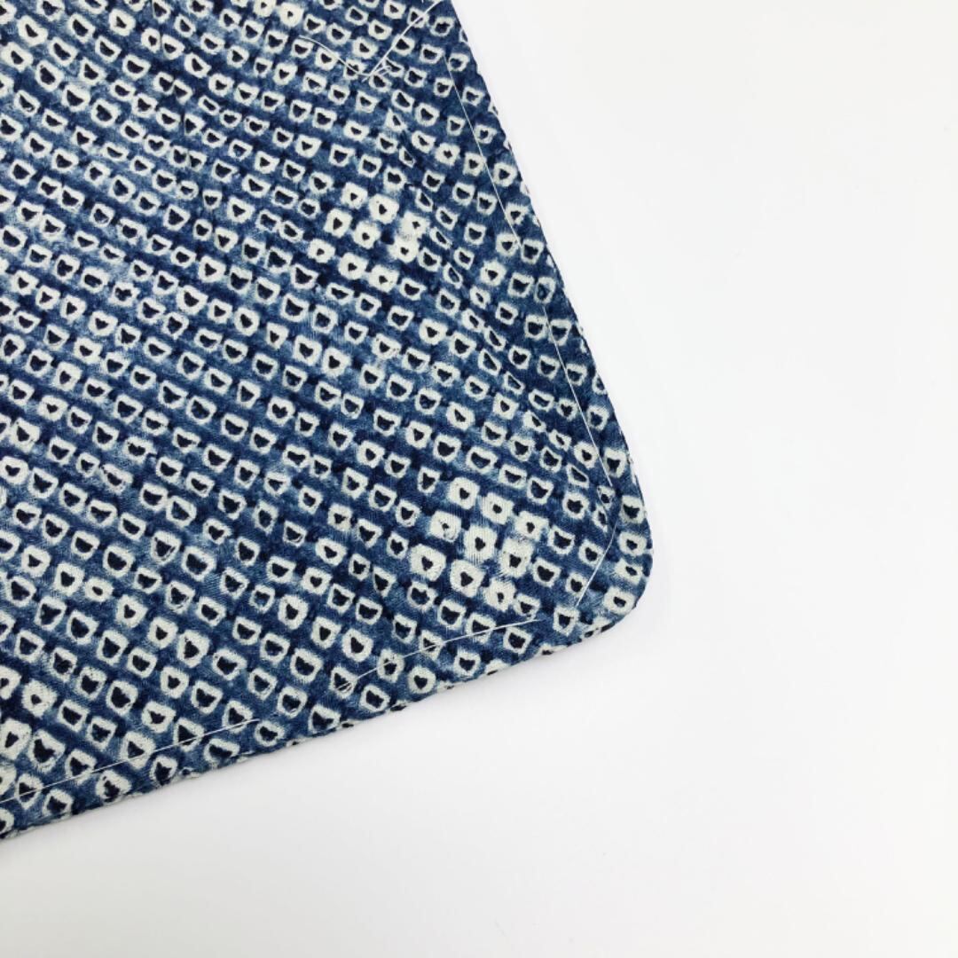 紺桔梗色の雰囲気の良い藍染のお色味に遠目で浮かび上がる染色の濃淡で抽象模様がデザインされた大変手のかかった素敵なお品でございます。