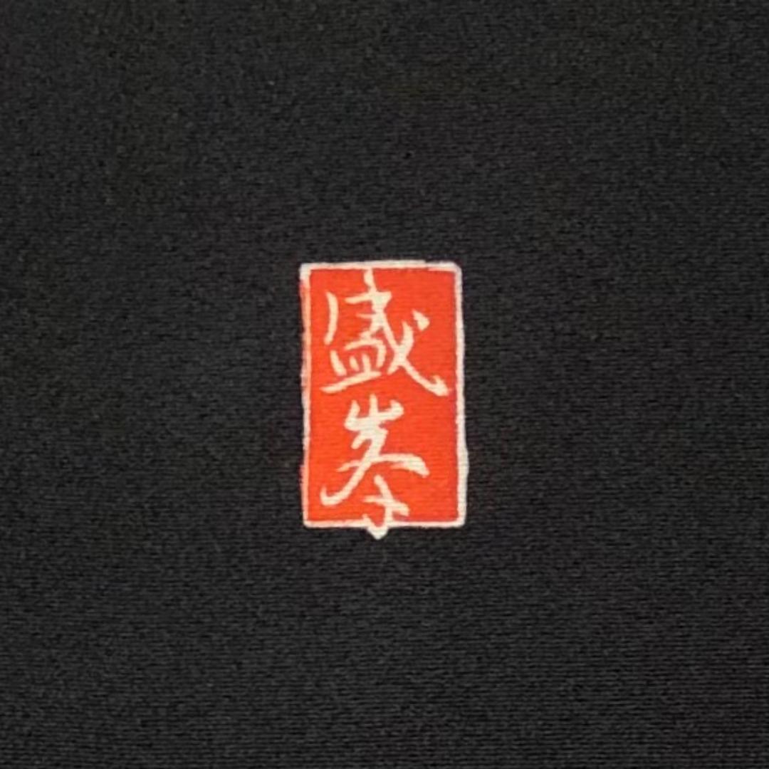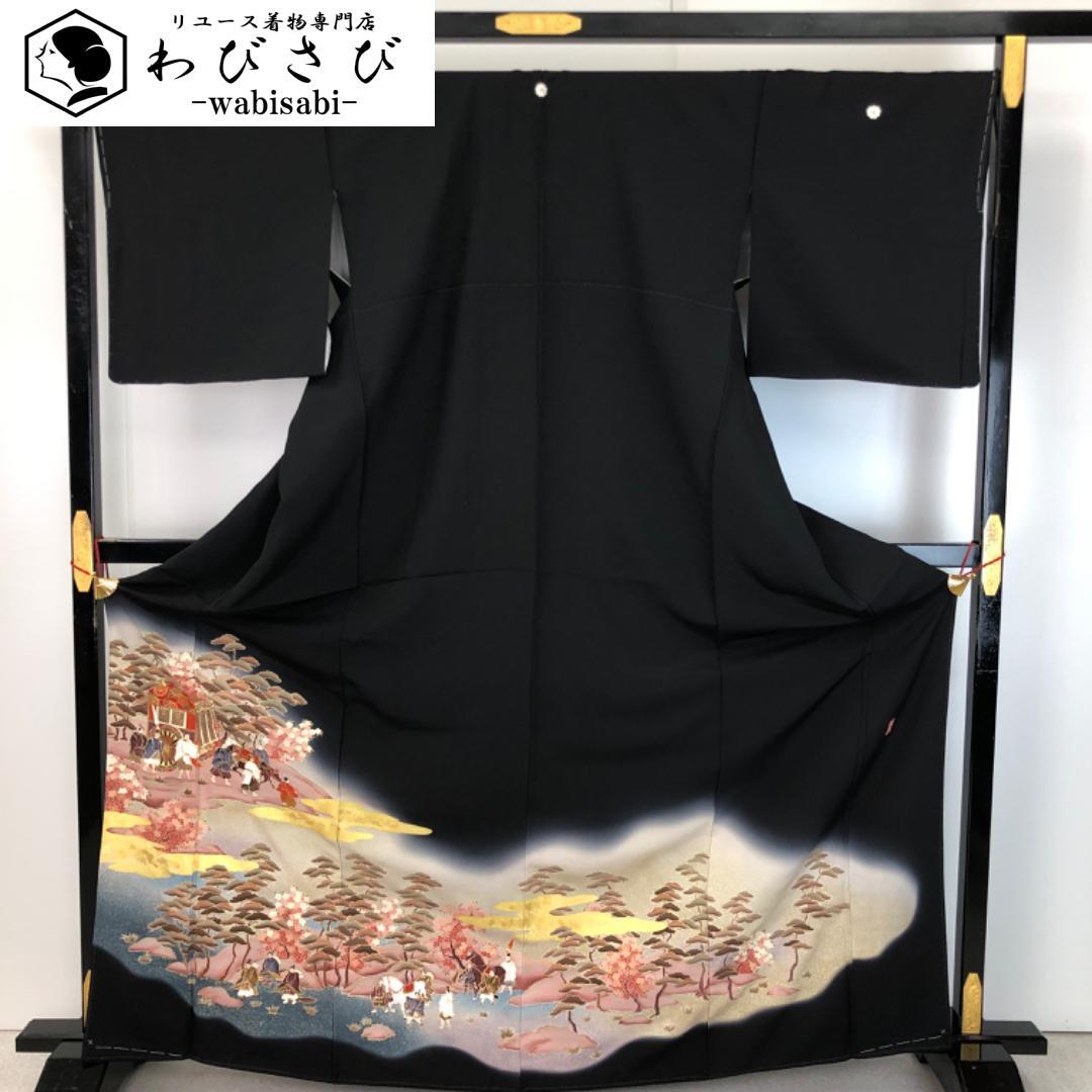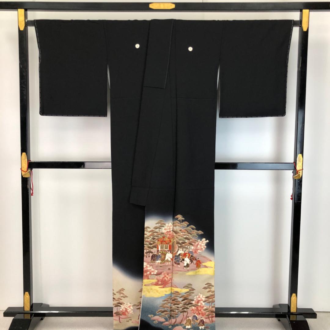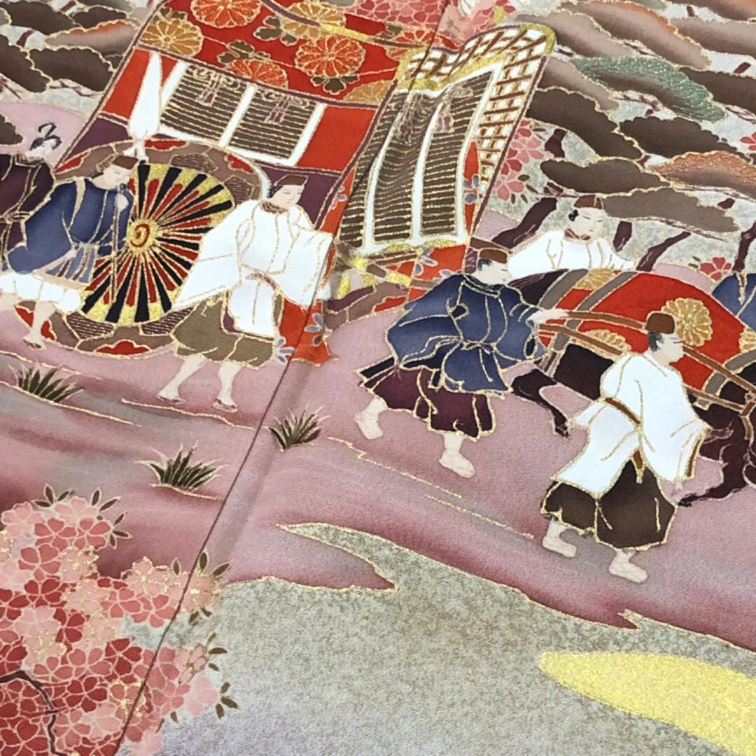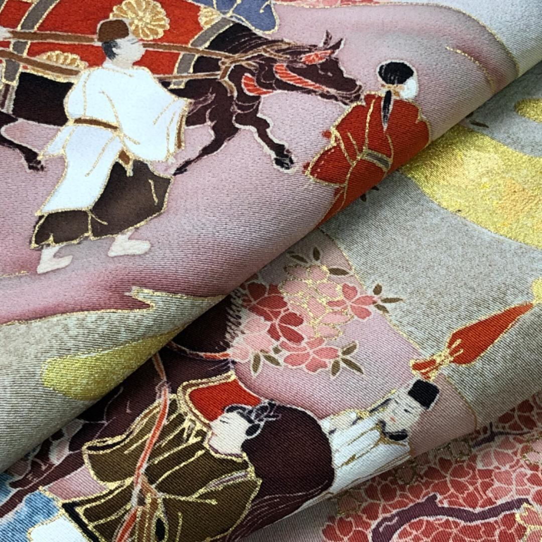 金彩が使われた人物、松花模様などの柄裄がデザインされた素敵なお品でございます。
