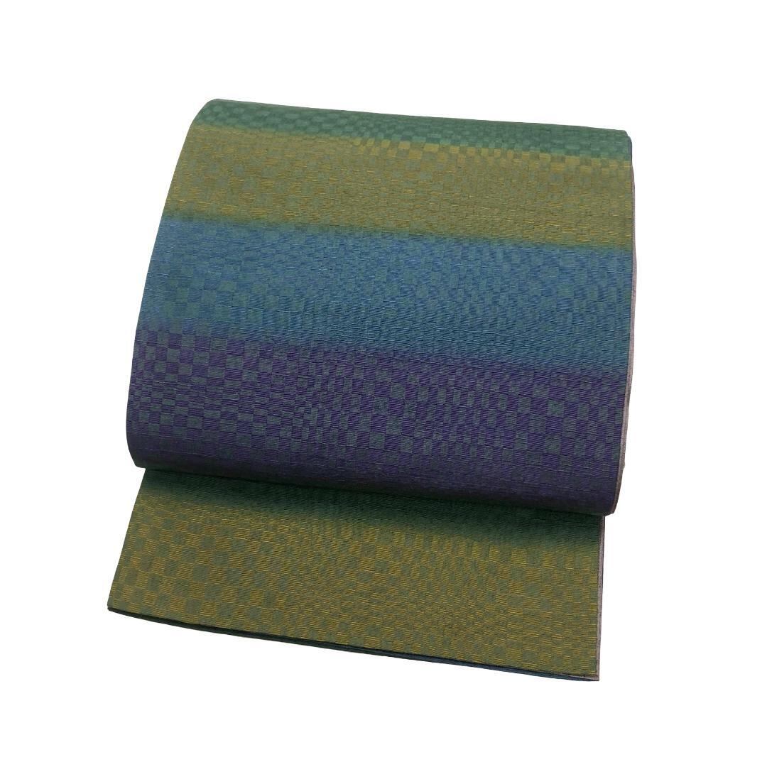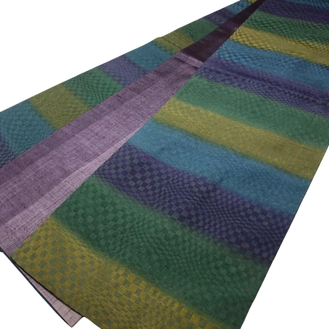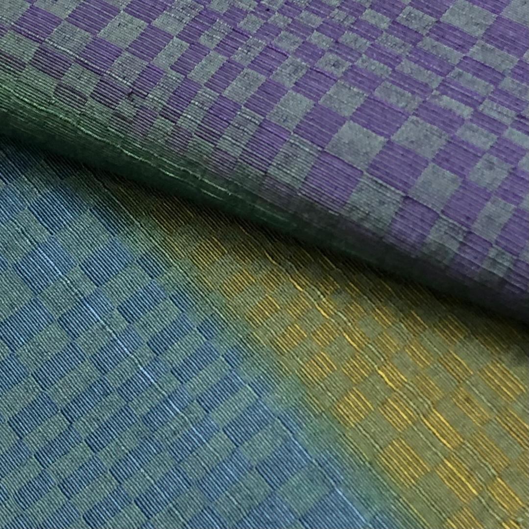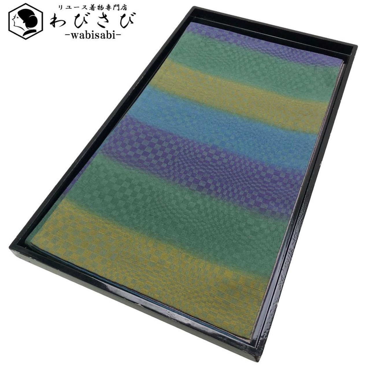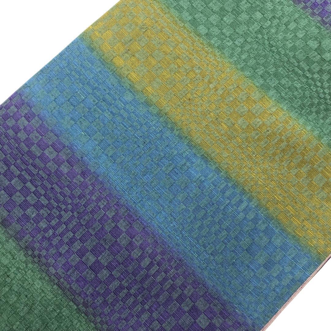 多彩な色彩の横縞模様に変わり市松、反対派紫色ベースの縦縞模様のグラデーション、両面使える素敵なお品でございます。