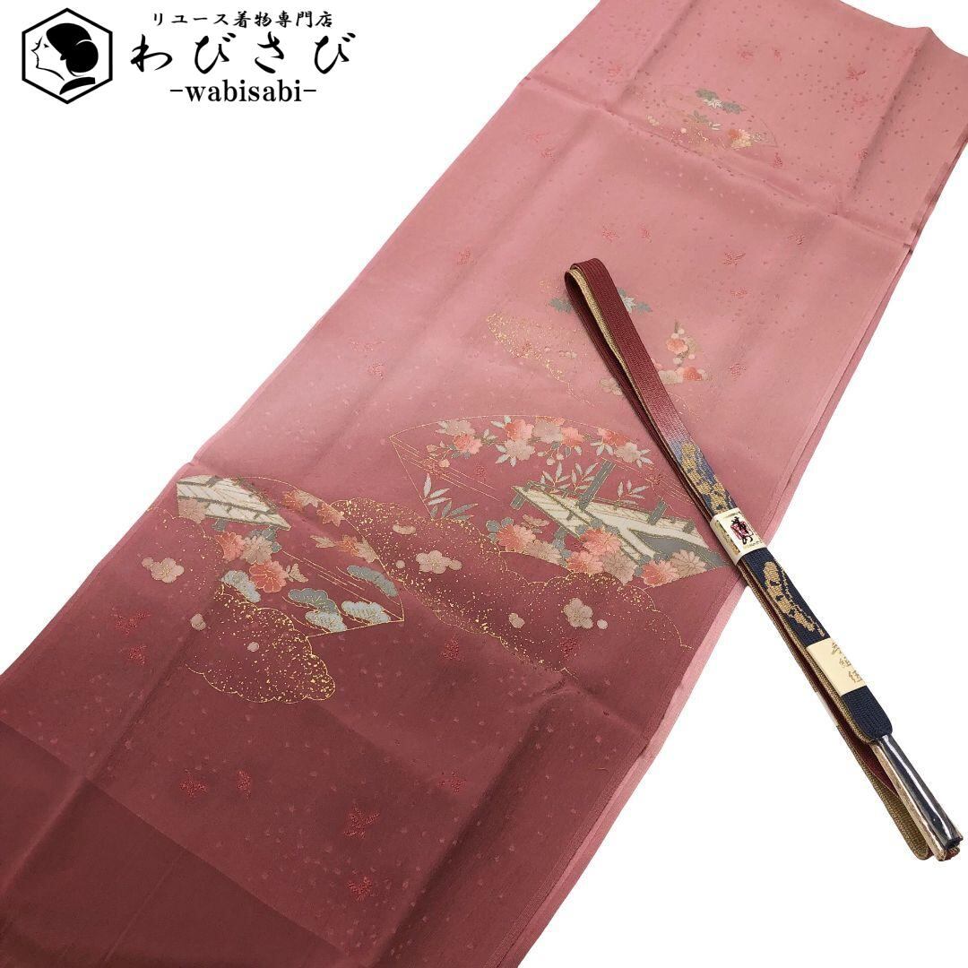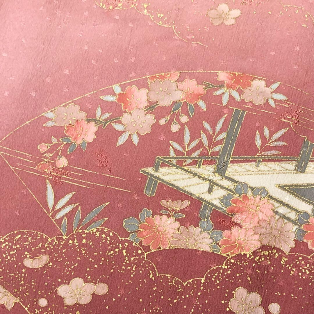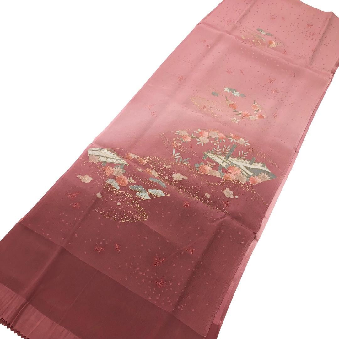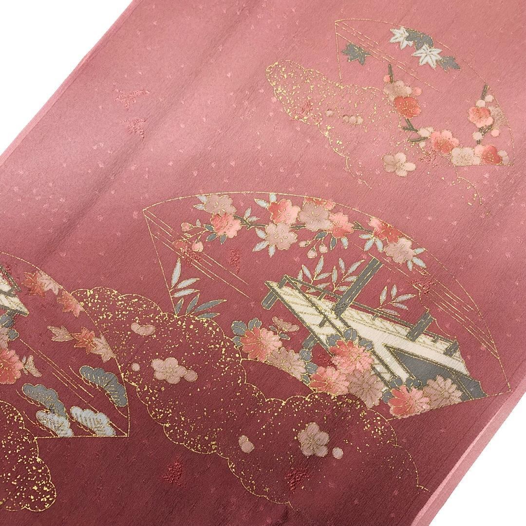 蘇芳色ベースのお色味に地紙に花模様がデザインされた綸子の帯揚げ、高麗組の帯締めの素敵なお品でございます。