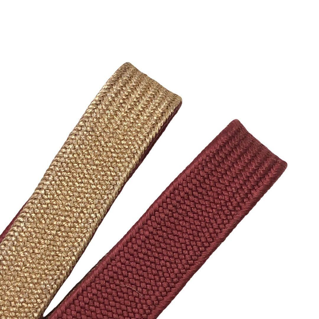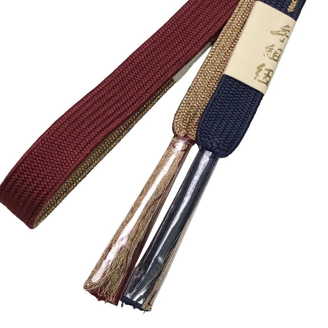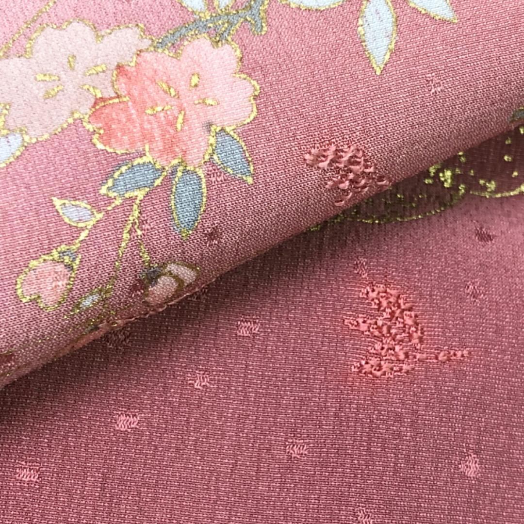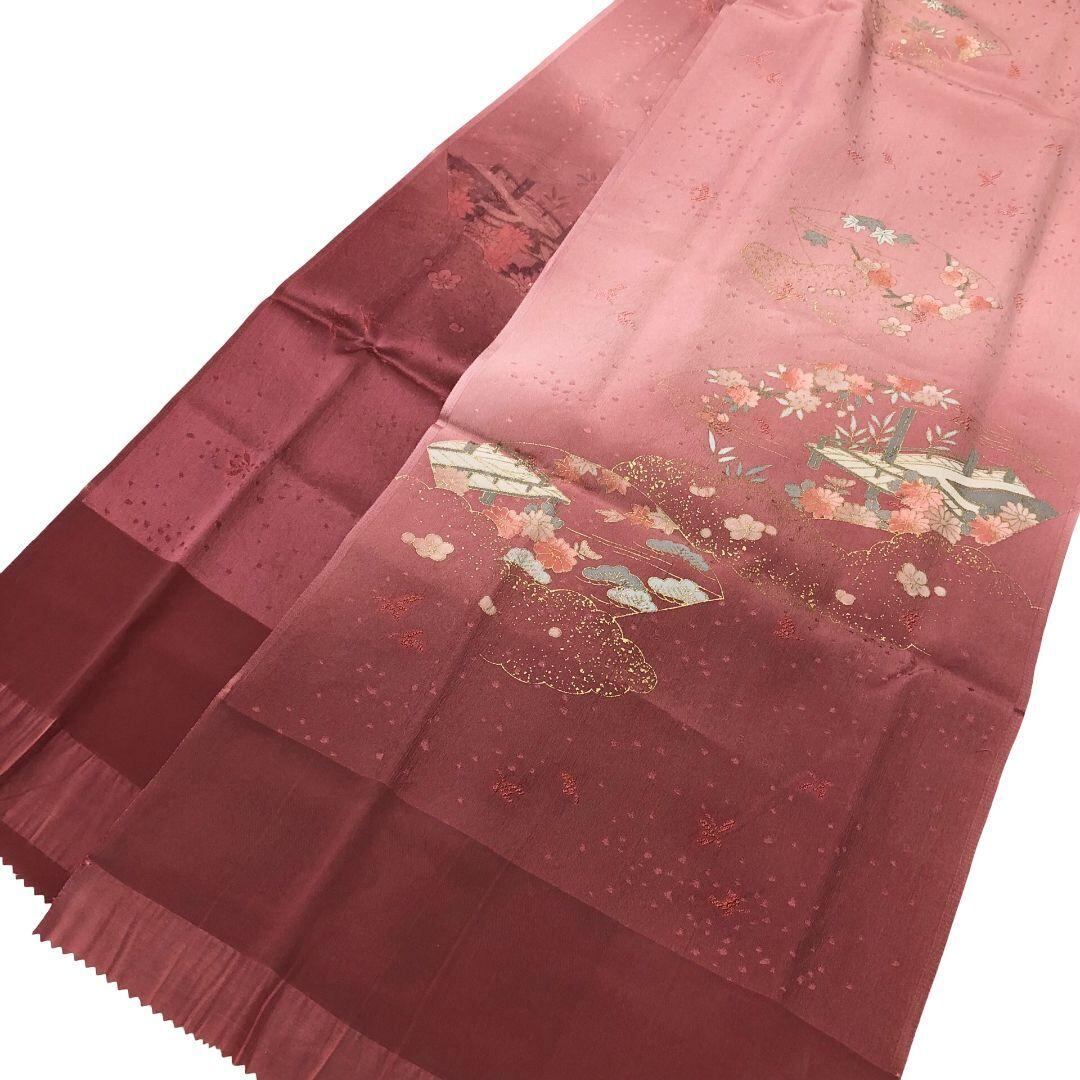 蘇芳色ベースのお色味に地紙に花模様がデザインされた綸子の帯揚げ、高麗組の帯締めの素敵なお品でございます。
