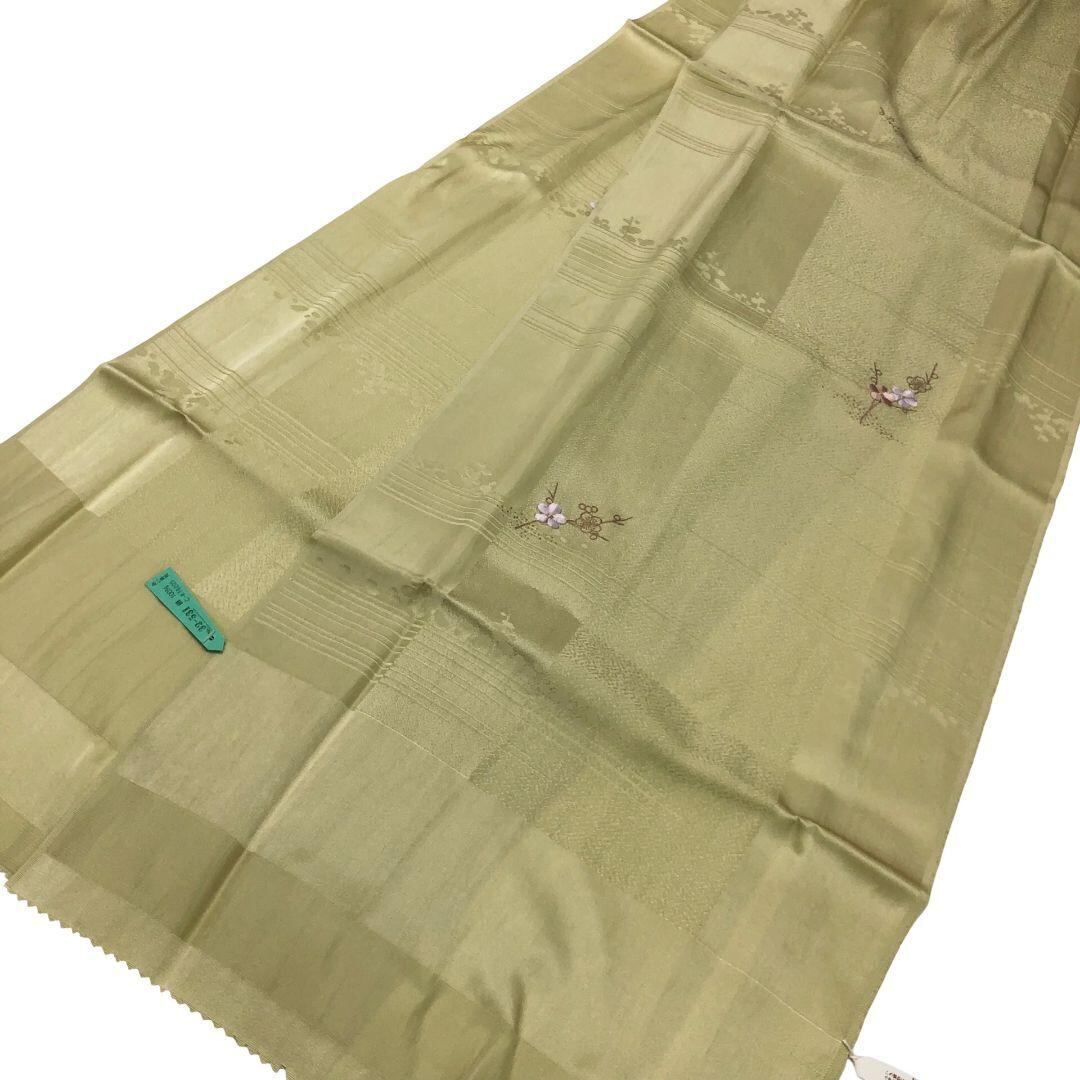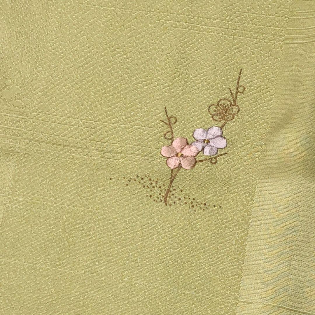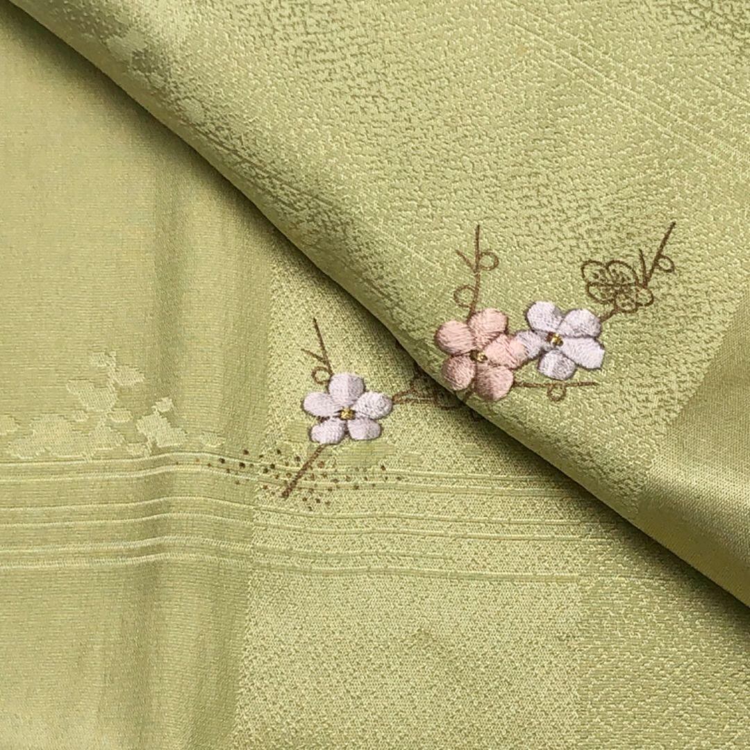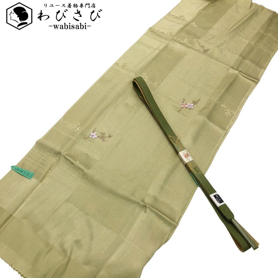 裏柳色のお色味に可愛らしい梅の刺繍がデザインされた綸子の帯揚げ、高麗組の帯締めの素敵なお品でございます。