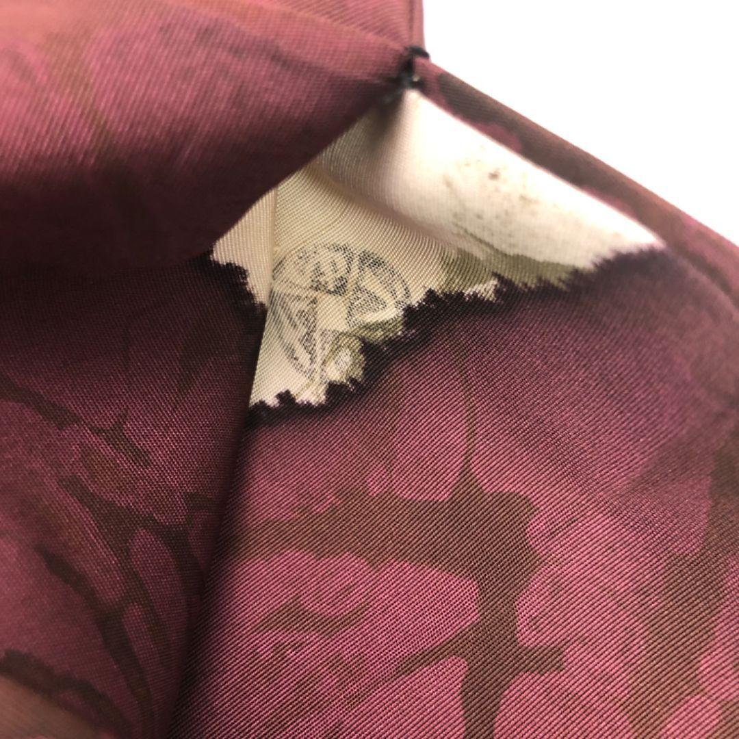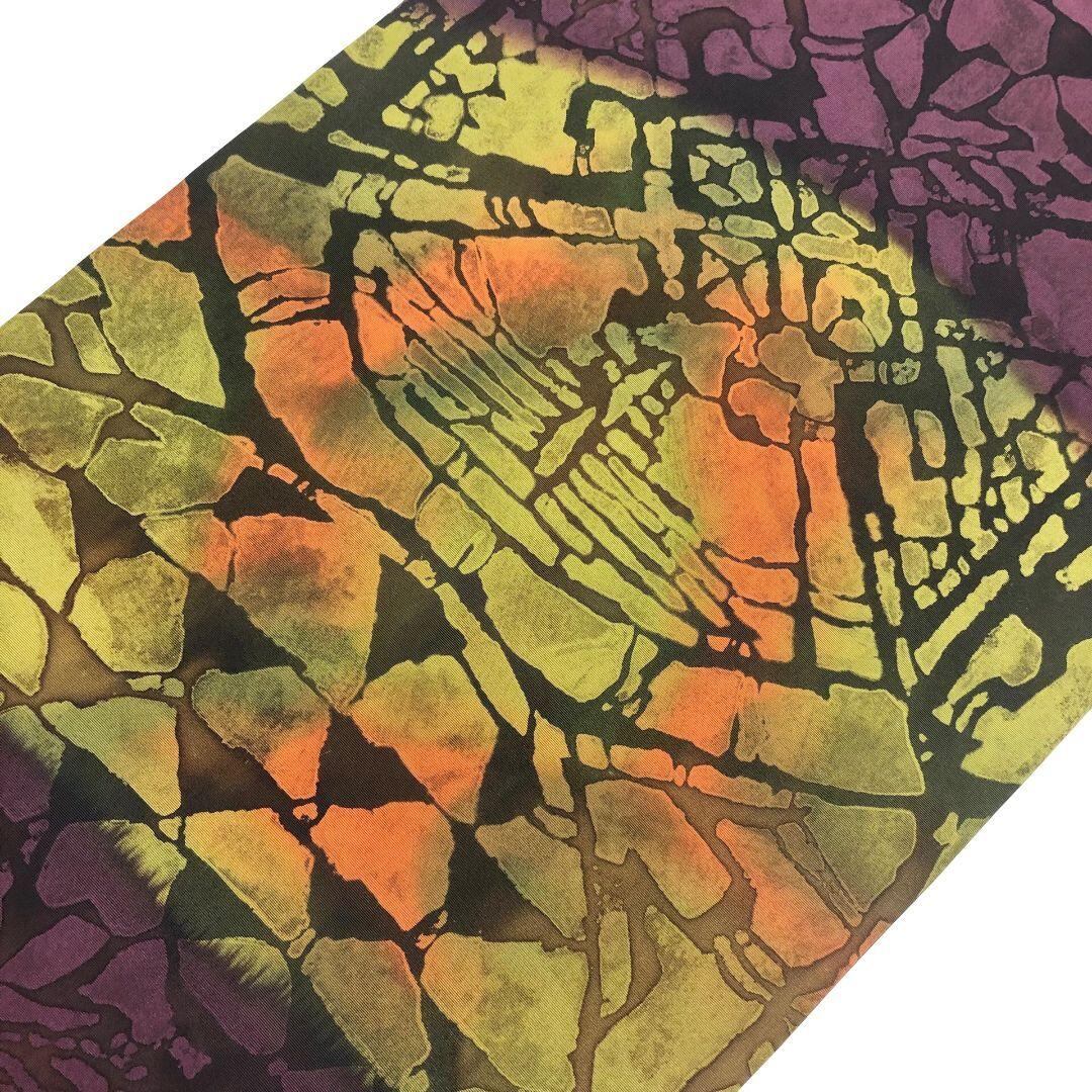 赤紫色ベースのお色味に印象的な色彩の染めの抽象柄がデザインされた素敵なお品でございます。