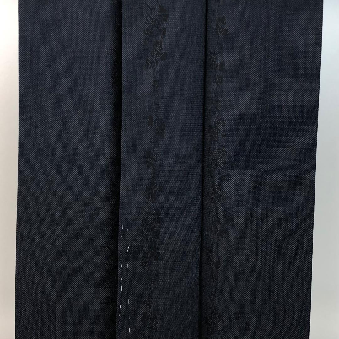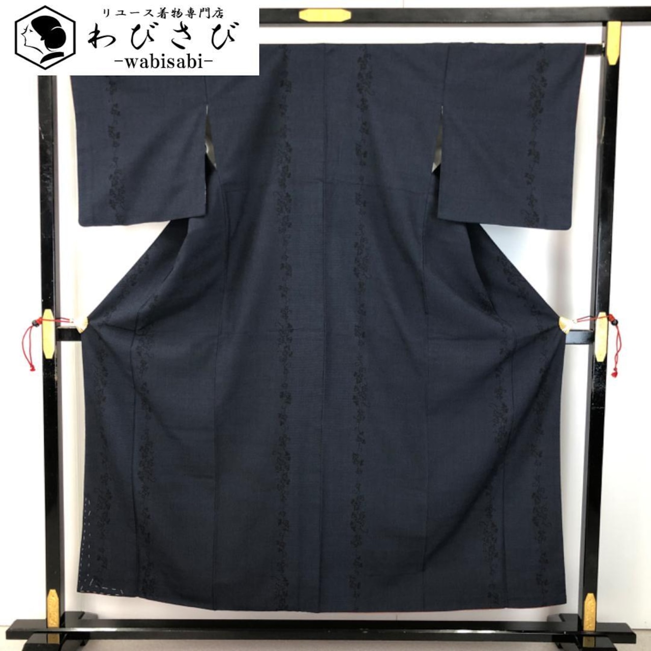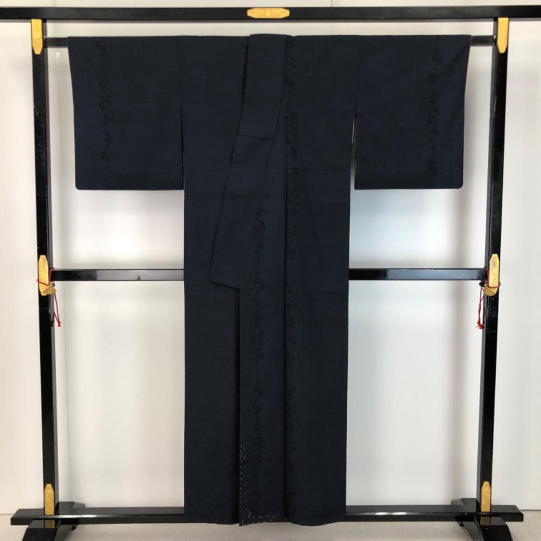 青褐色のお色味に花唐草模様の柄裄がデザインされた素敵なお品でございます。