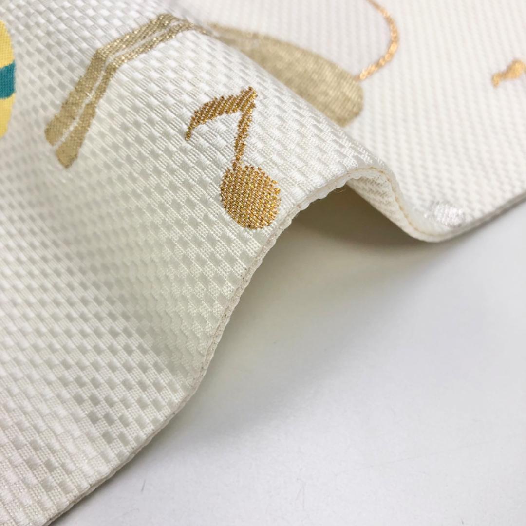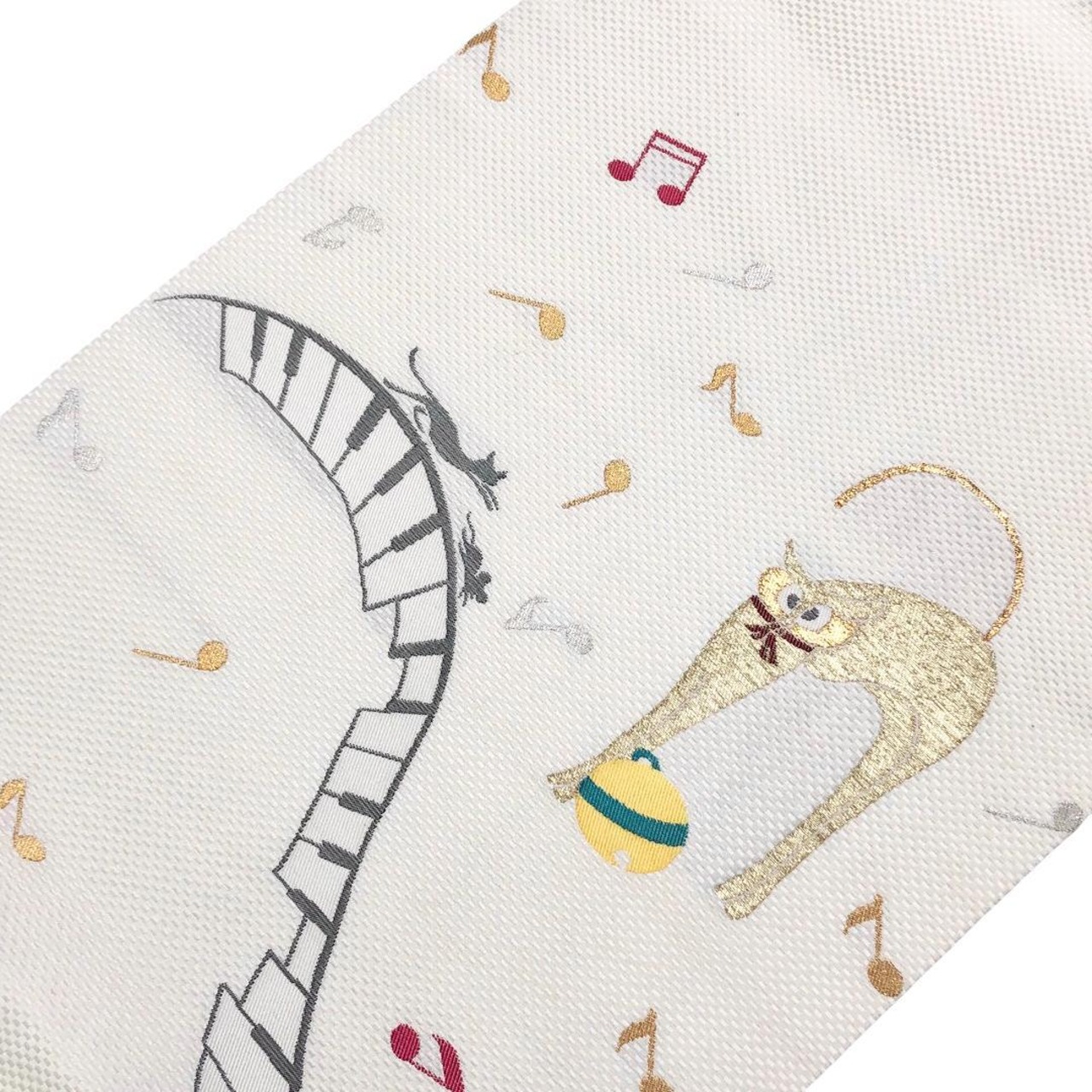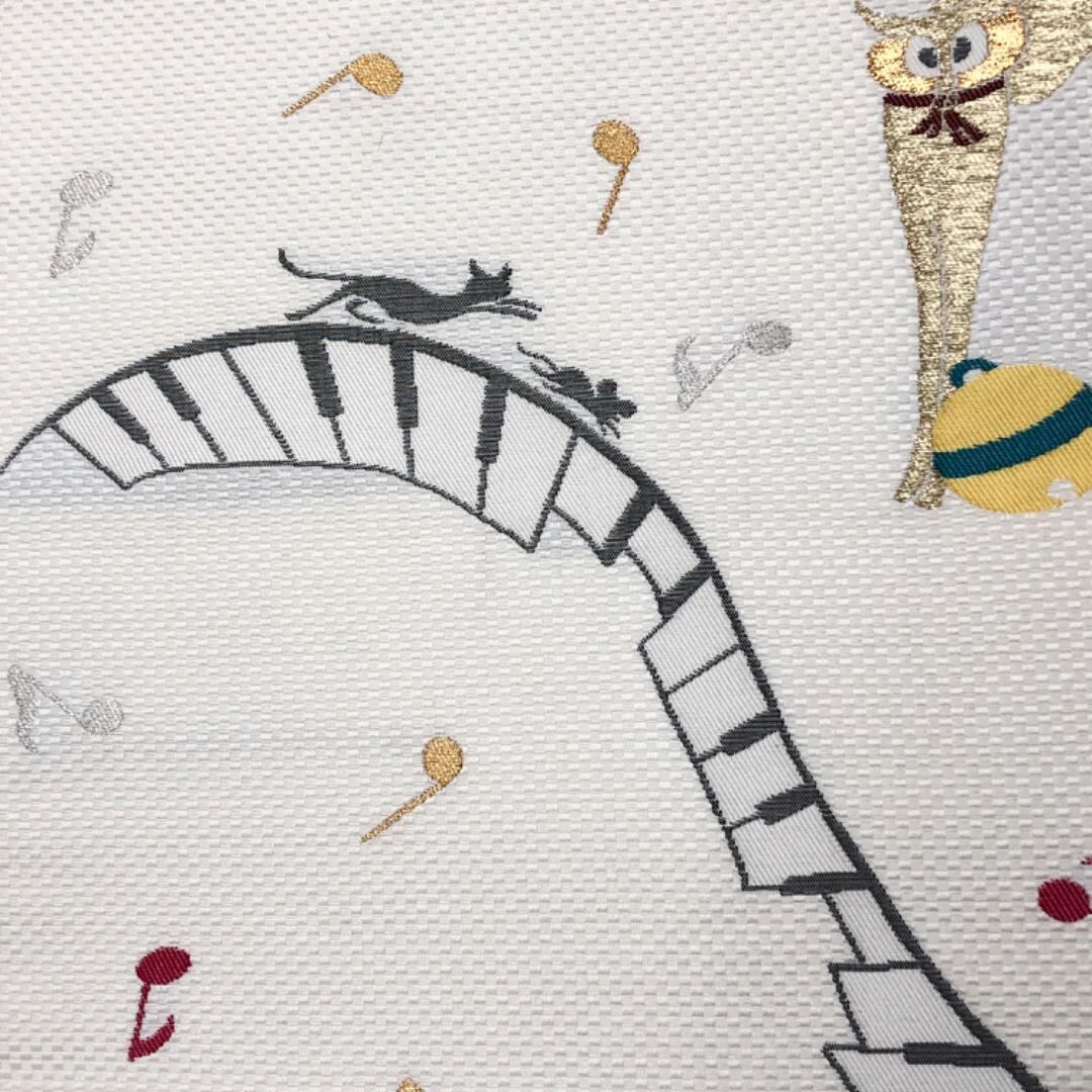乳白色のお色味に猫にネズミピアノに音符などの河合らしい柄裄がデザインされた素敵なお品でございます。