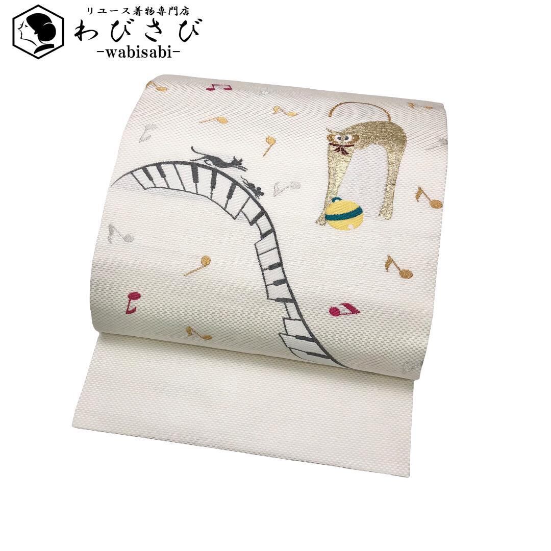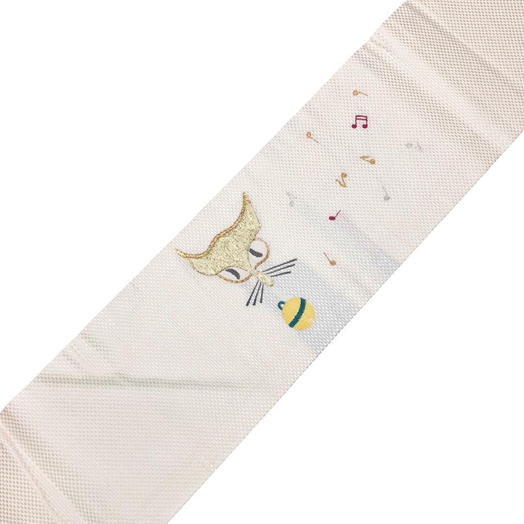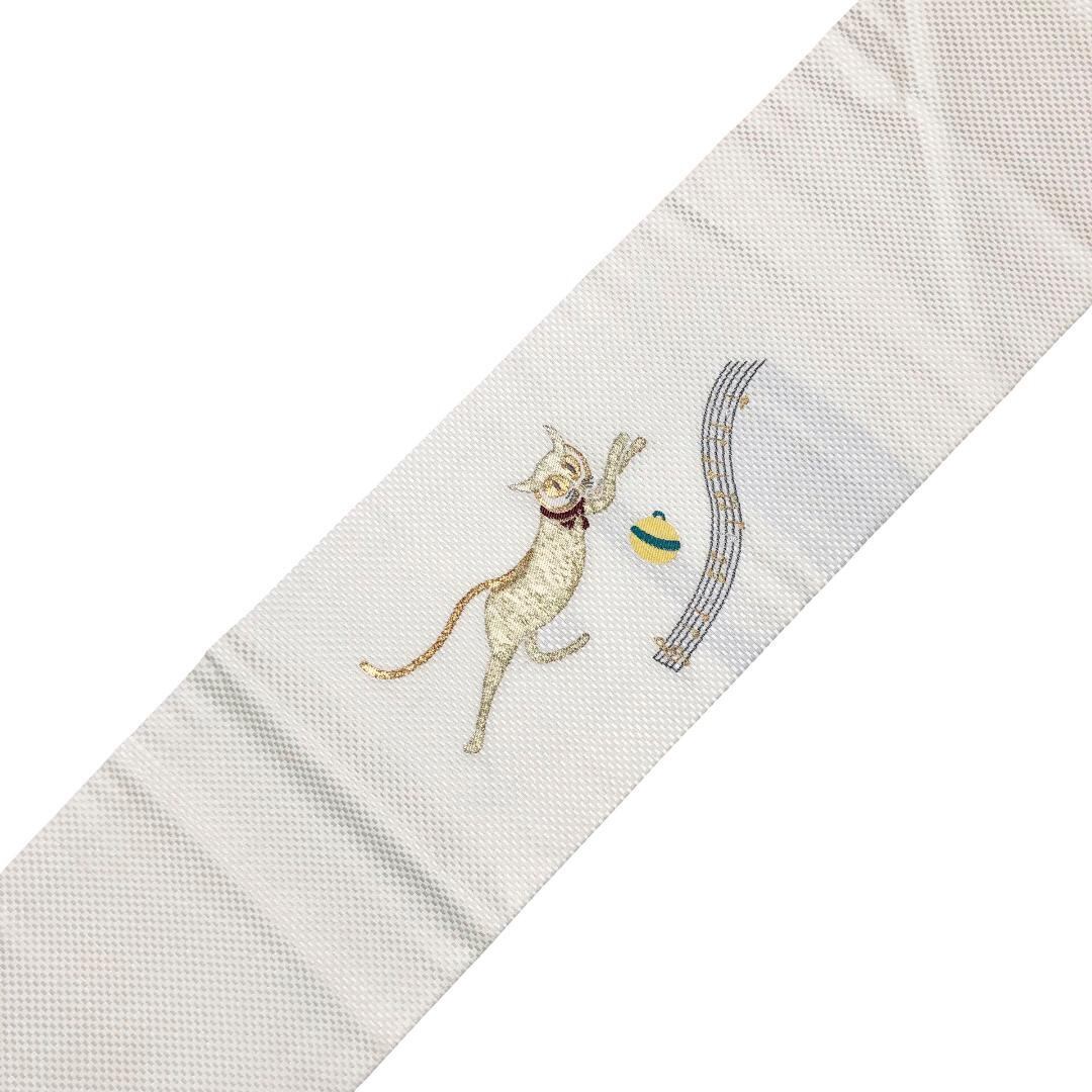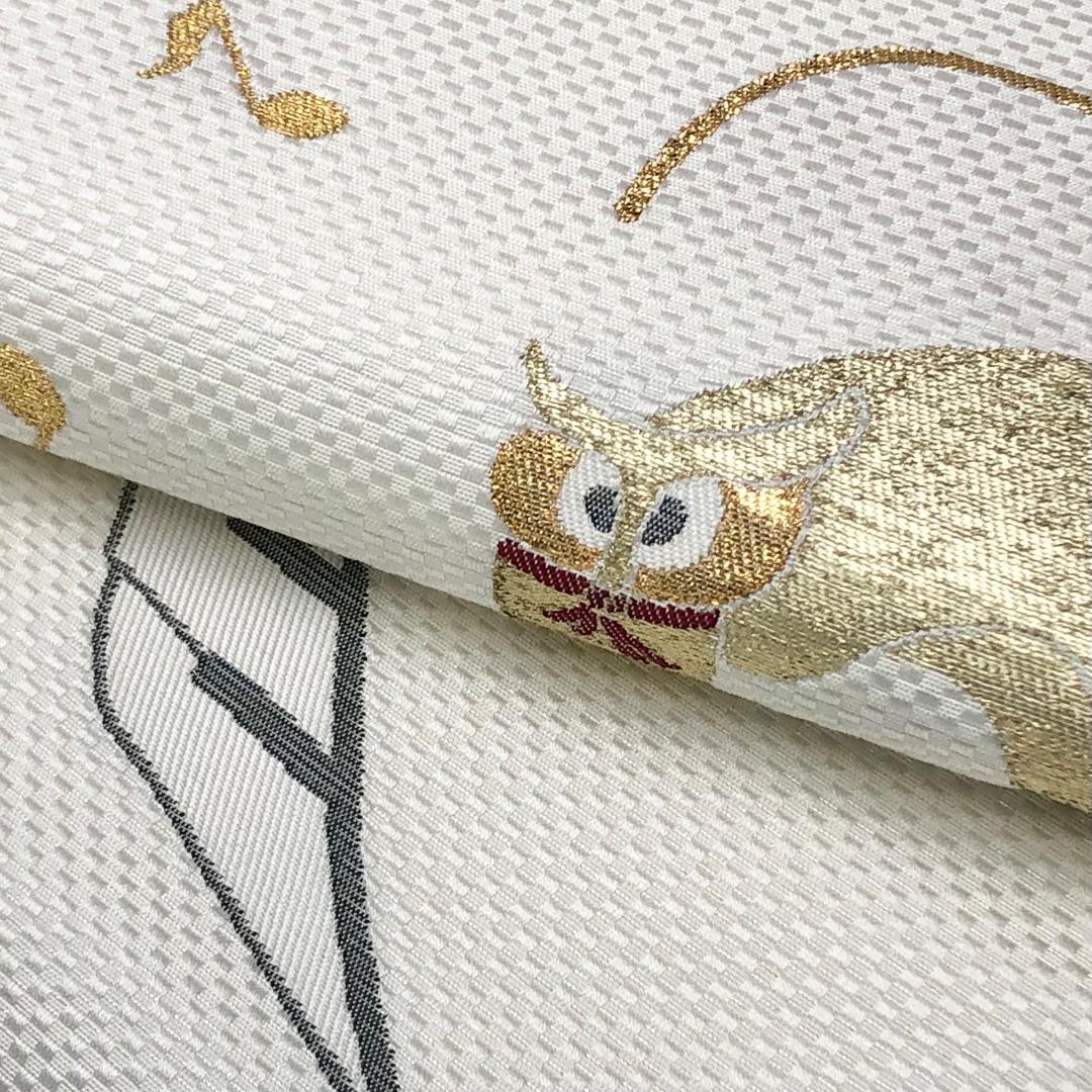 乳白色のお色味に猫にネズミピアノに音符などの河合らしい柄裄がデザインされた素敵なお品でございます。