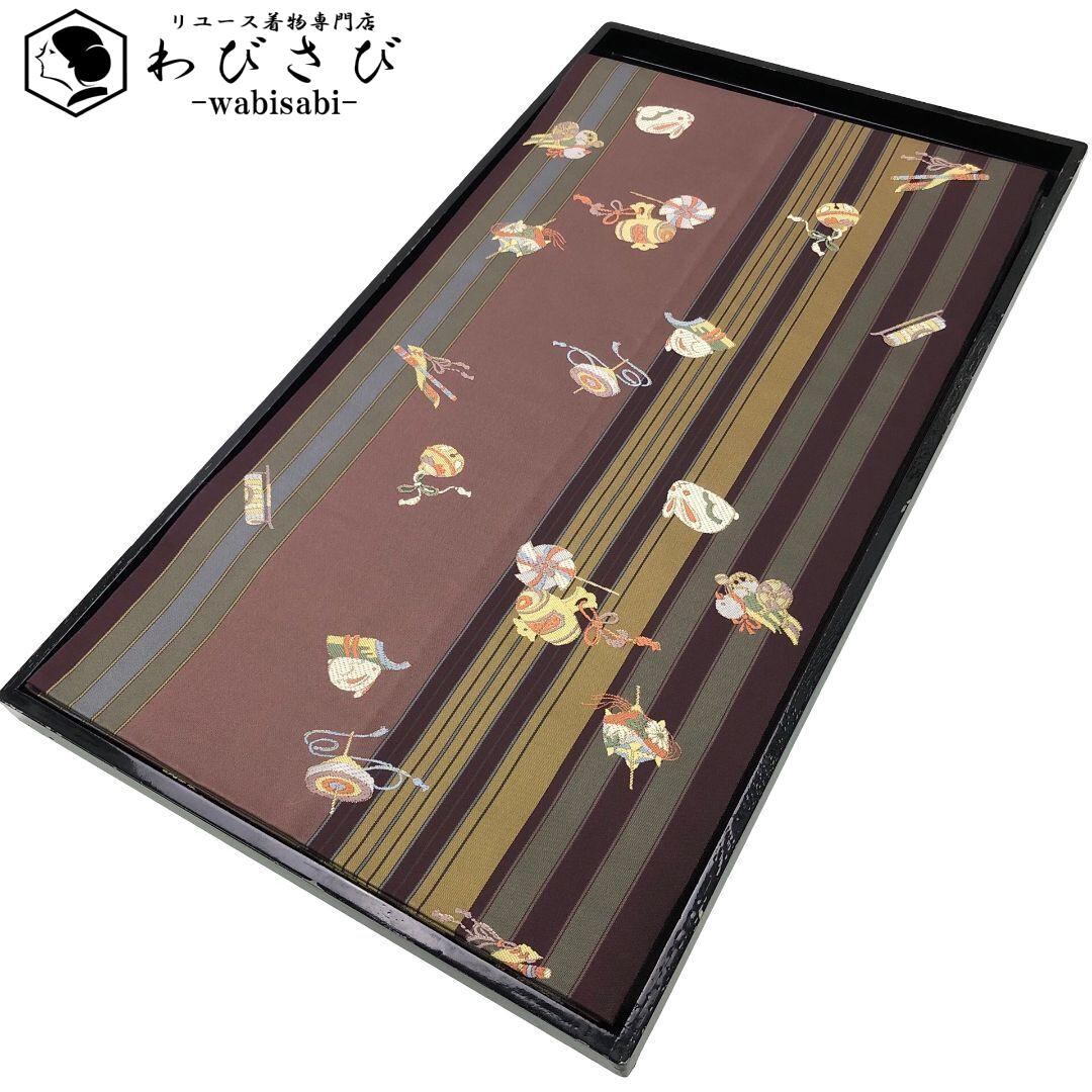 袋帯 西陣織 永本機業 証紙付 縦縞模様に可愛らしい和玩具 紅鳶色 O-5761 着物 きもの kimono 和服 和装 中古 リサイクル着物 【送料無料】