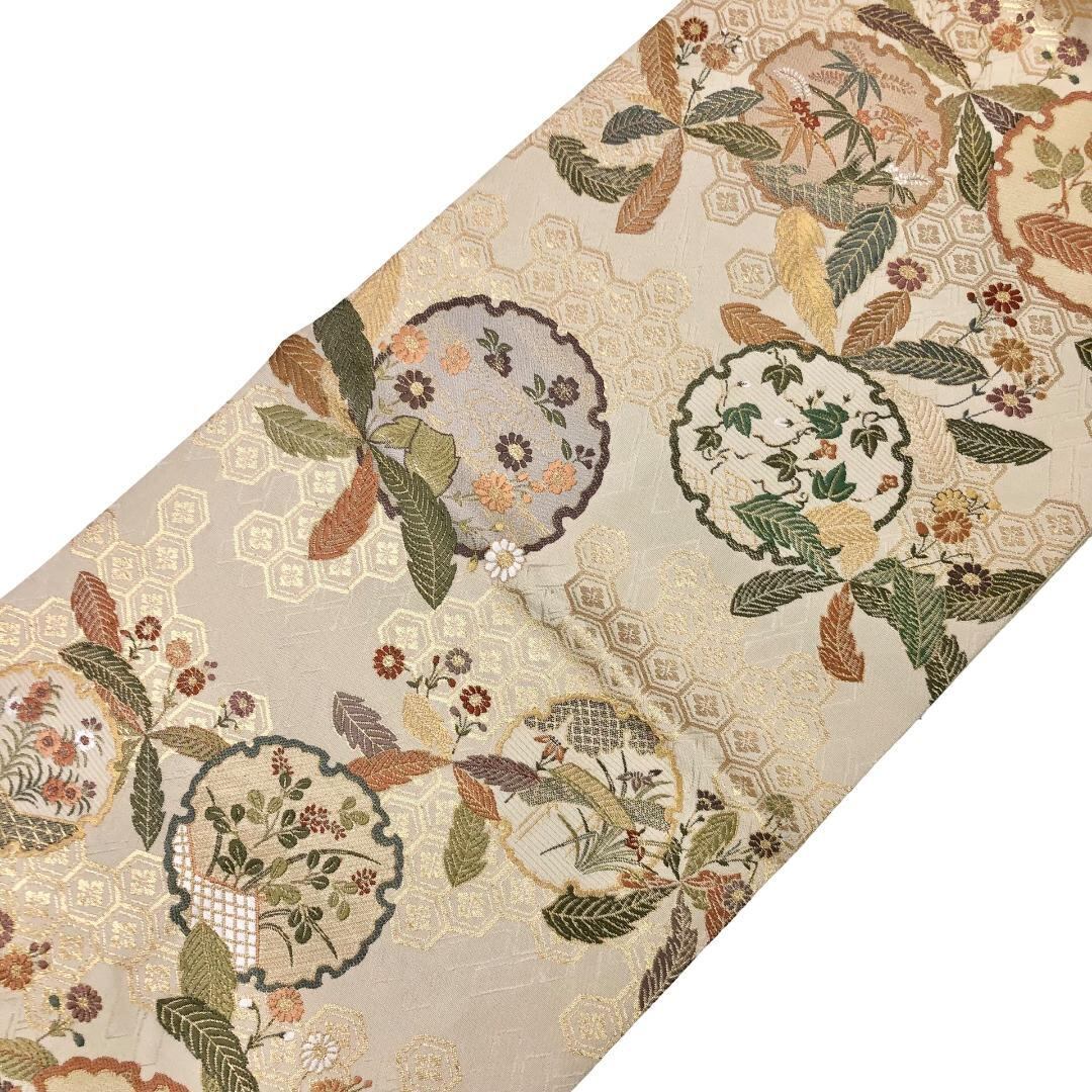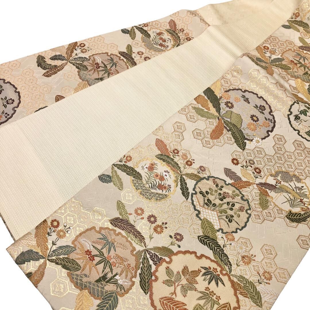 練色の雰囲気の良いお色味に雪輪に花模様、花亀甲などの柄裄がデザインされた素敵なお品でございます。