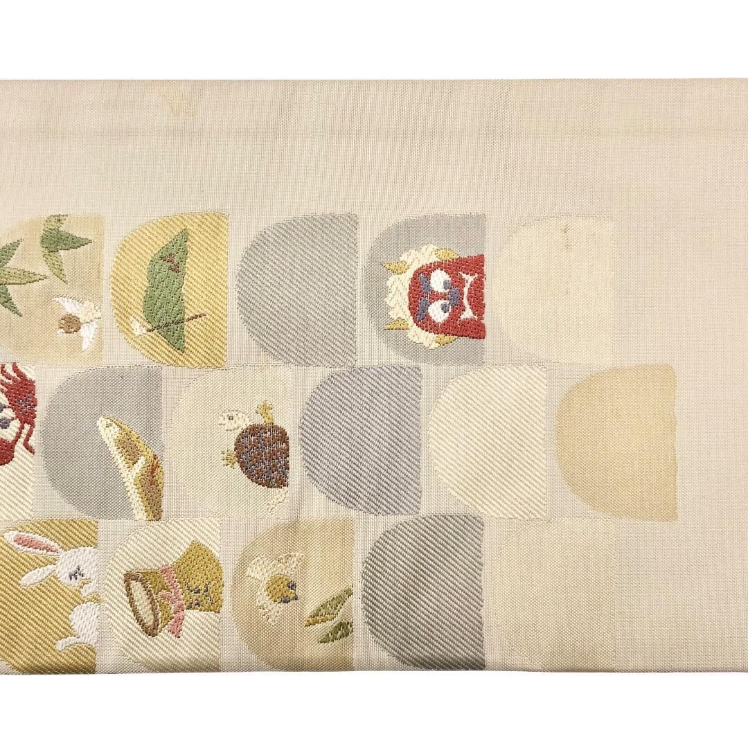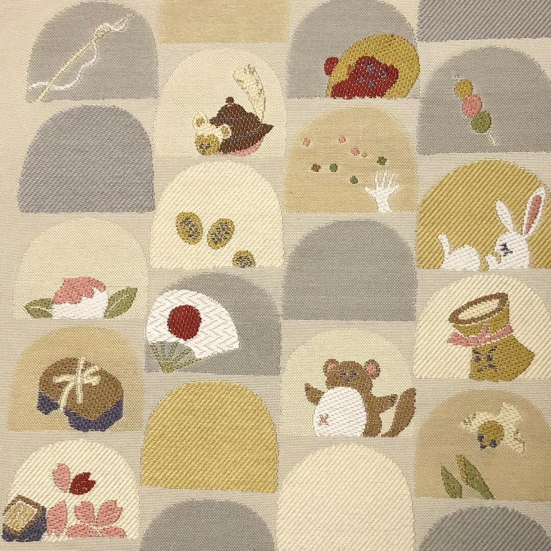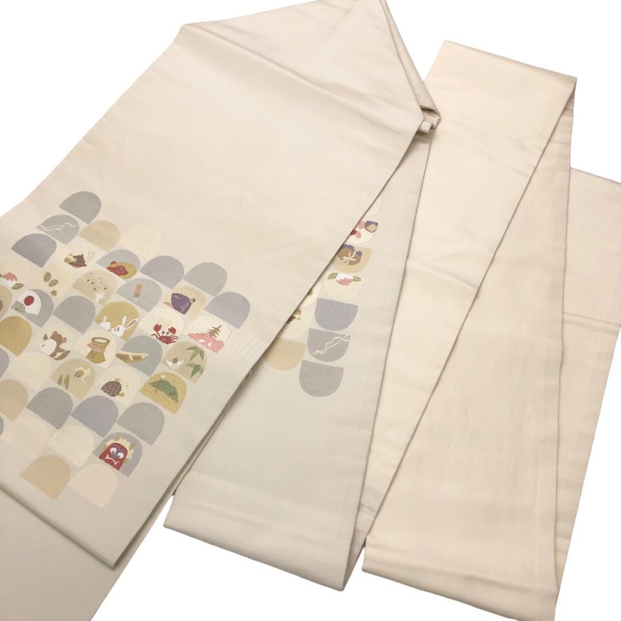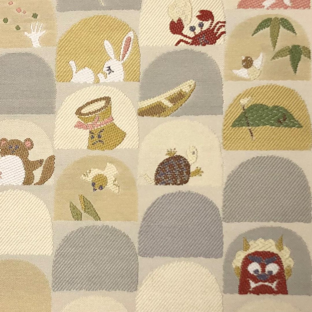 生成色のお色味に日本昔話をモチーフにした可愛い動物や鬼などの柄行がデザインされた素敵なお品でございます。
