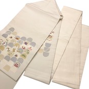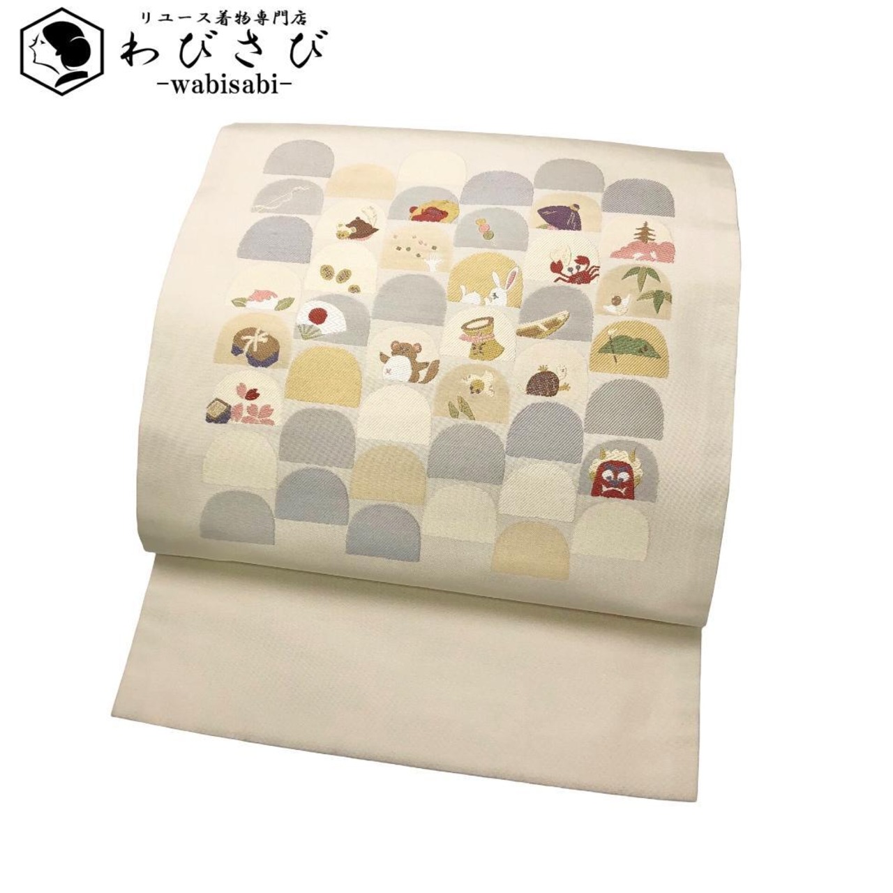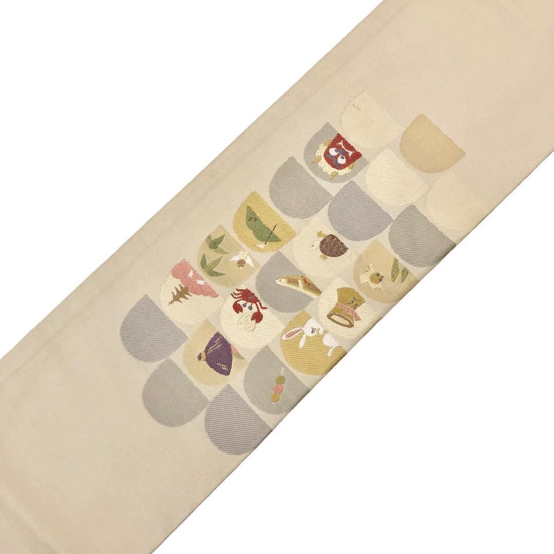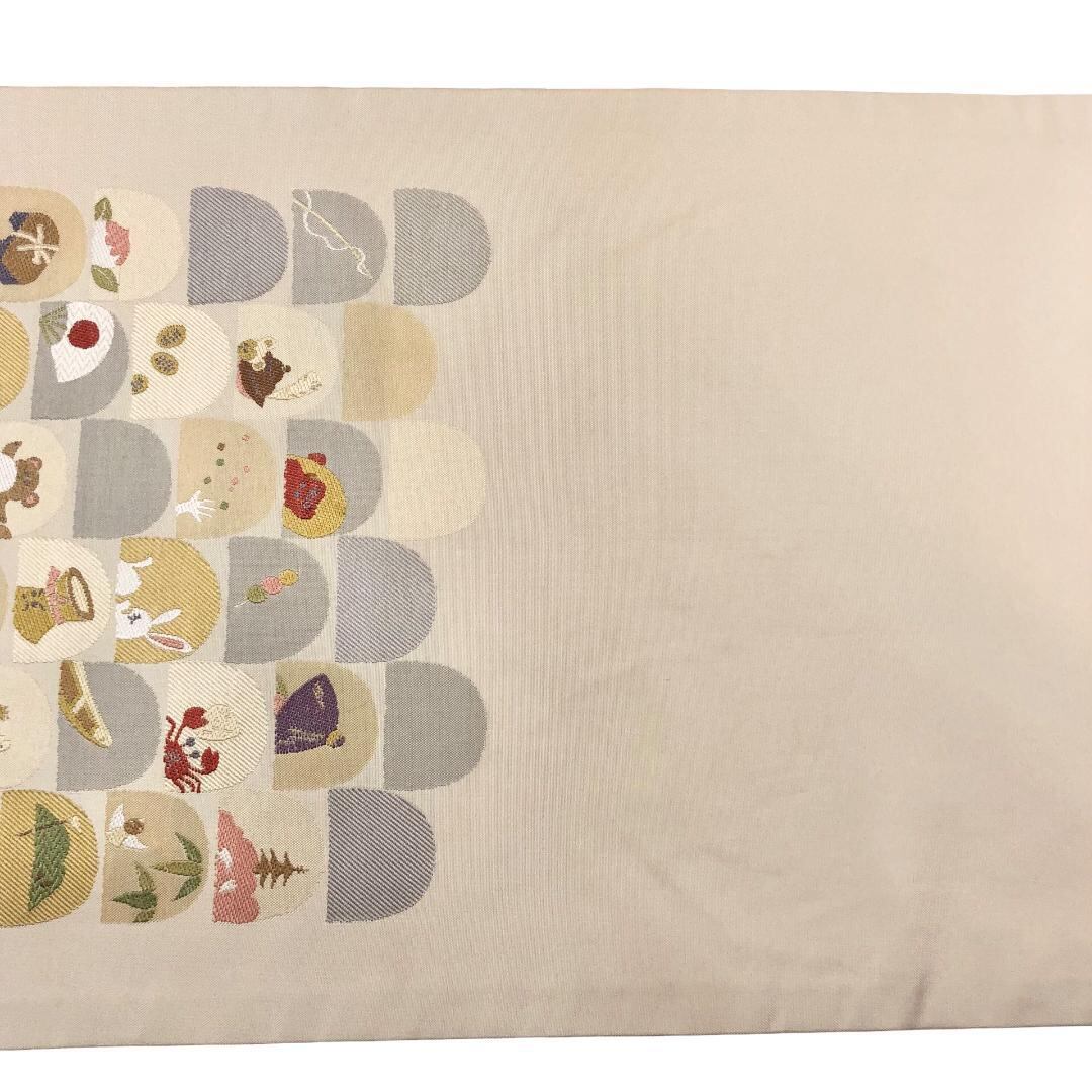 生成色のお色味に日本昔話をモチーフにした可愛い動物や鬼などの柄行がデザインされた素敵なお品でございます。