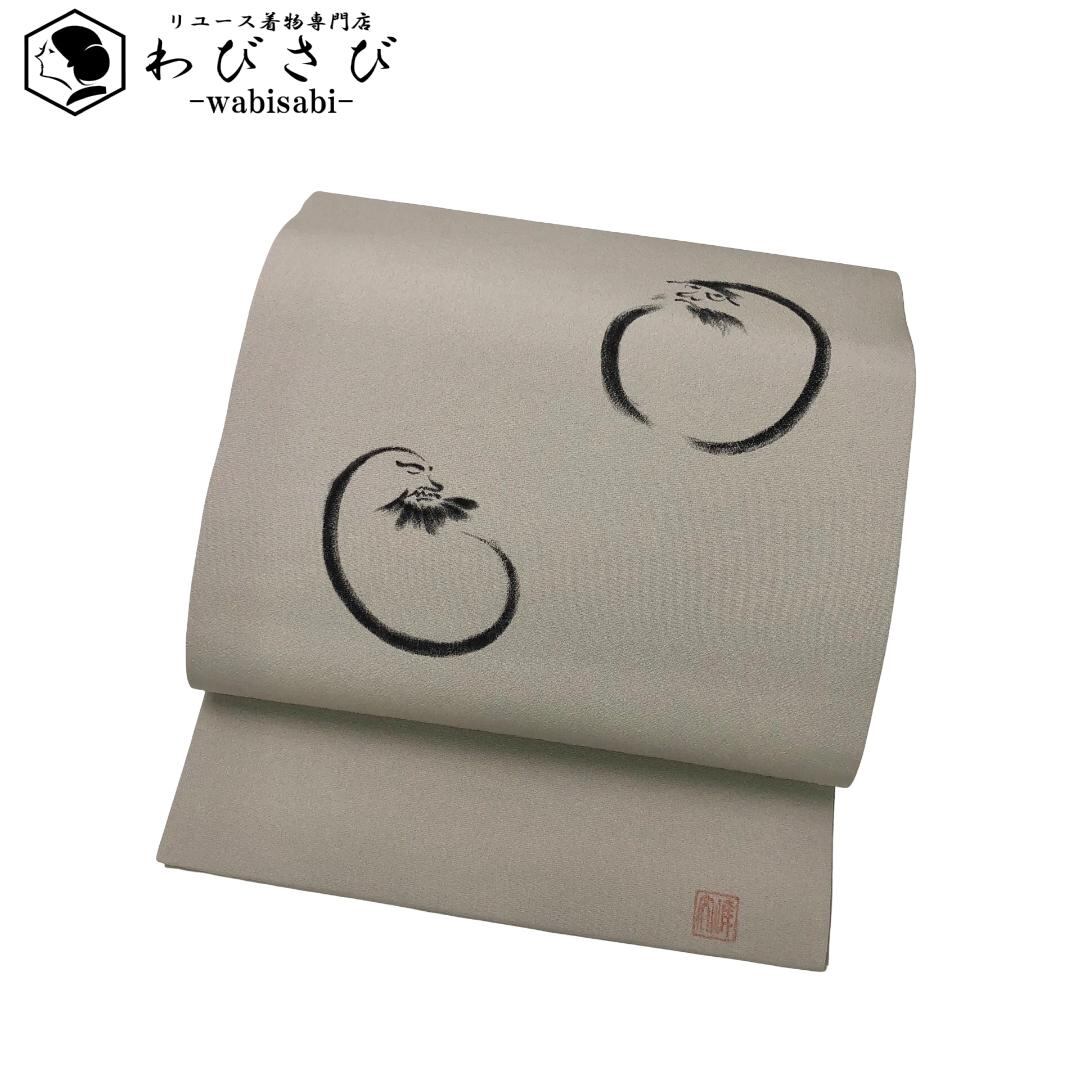 名古屋帯 作家物 手描き 達磨 だるま 灰色 縮緬 O-5800 着物 きもの kimono 和服 和装 中古 リサイクル着物 【送料無料】