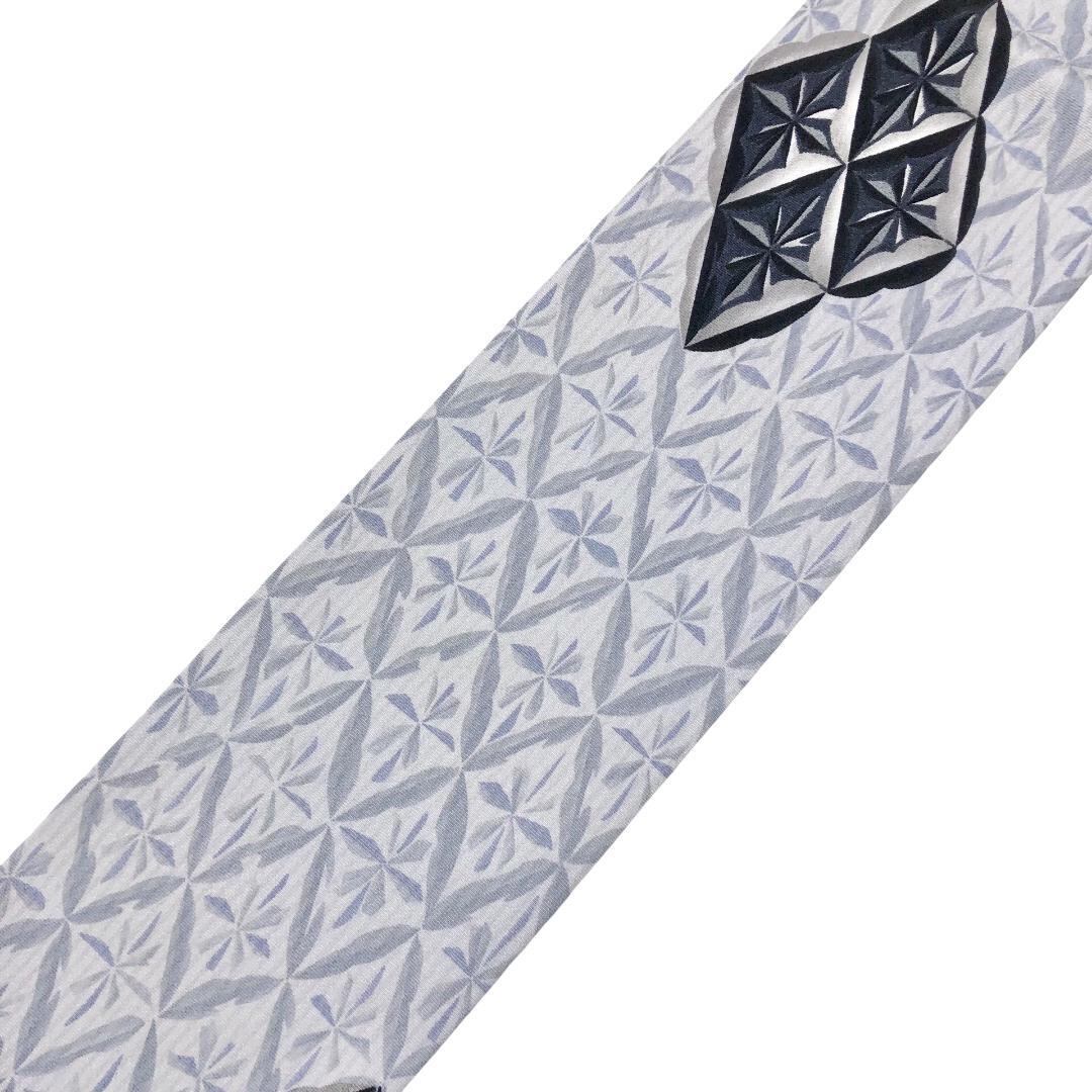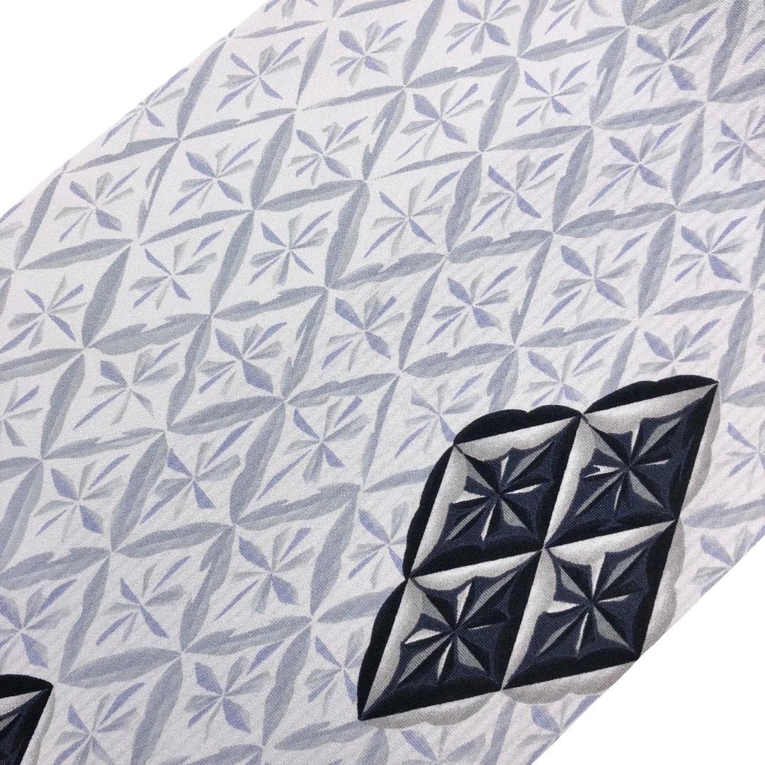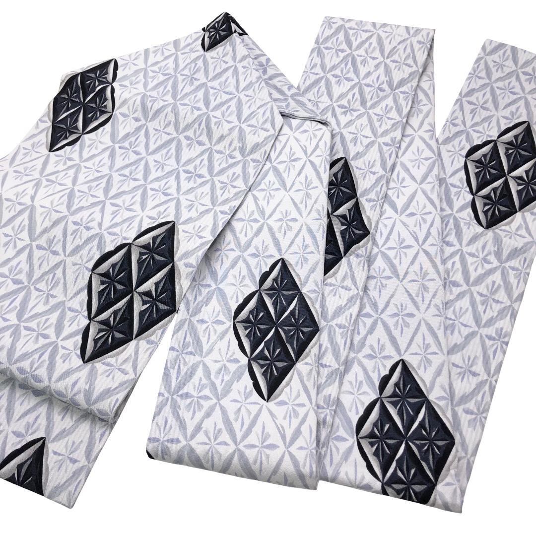 雪色のお色味の縮緬地にモノトーンの切子柄、菱形模様の雰囲気の良い柄裄がデザインされた素敵なお品でございます。