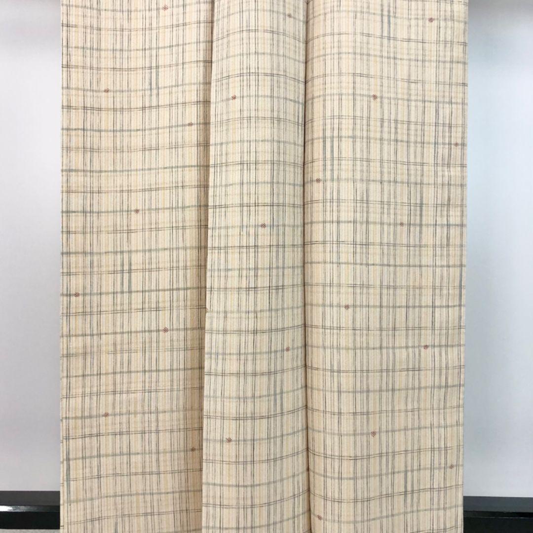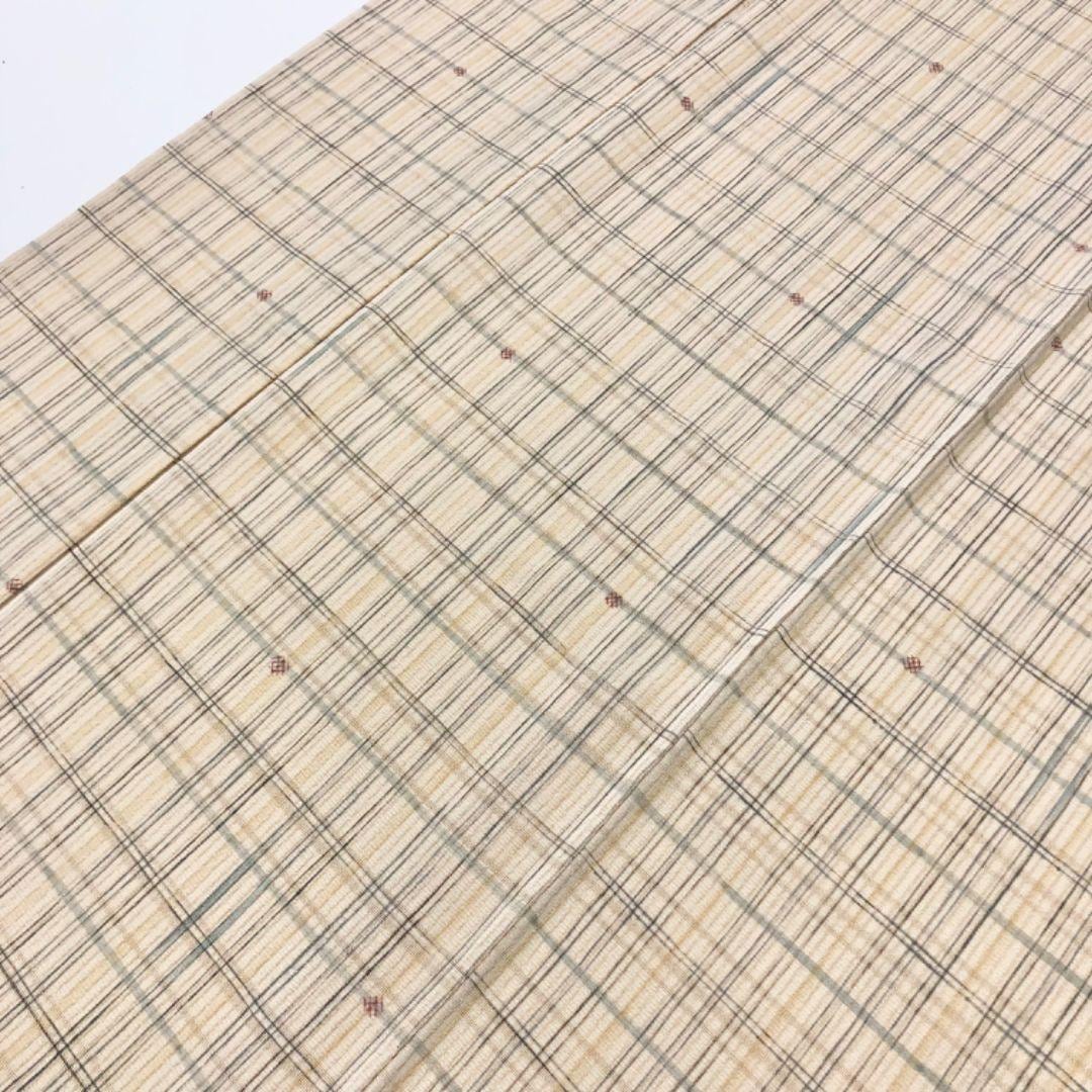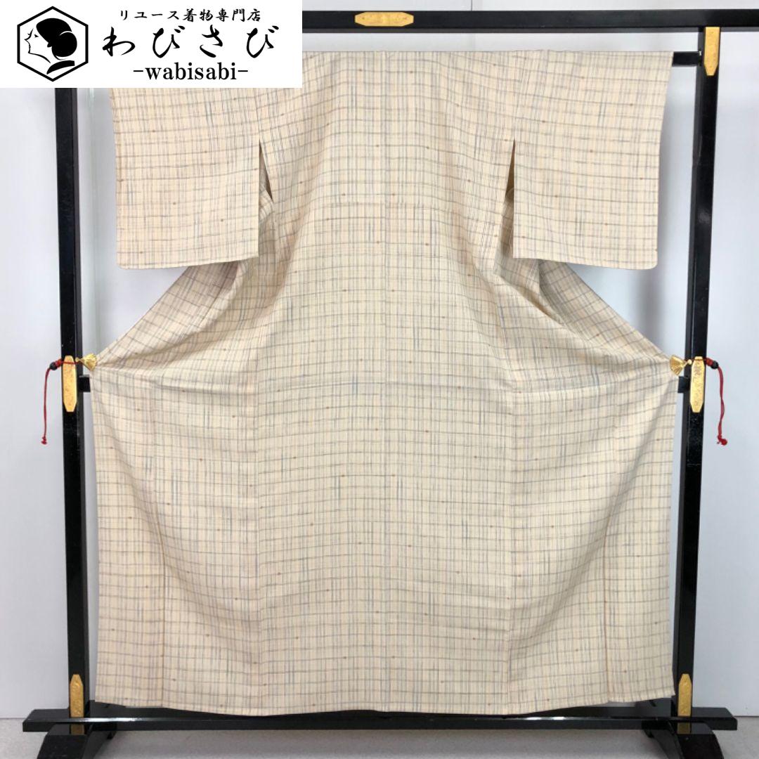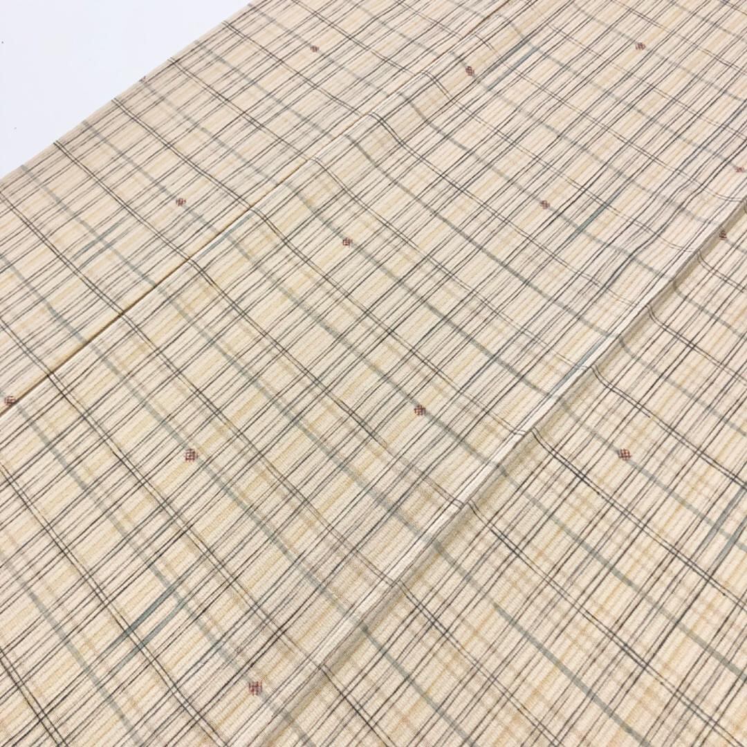 生成色のお色味の縮緬地に格子柄、四角い小花模様がデザインされた素敵な柄裄のお品でございます。