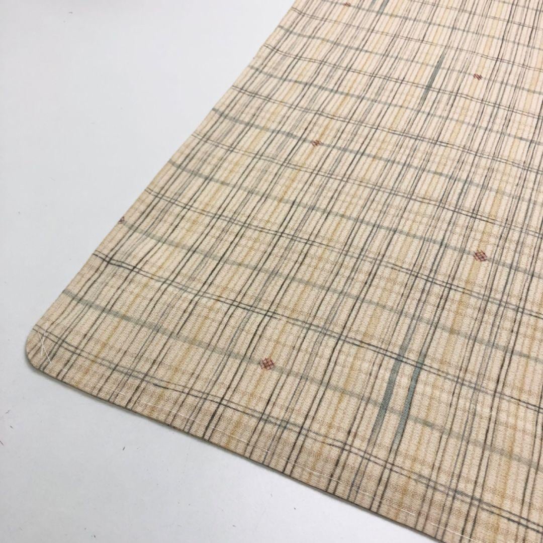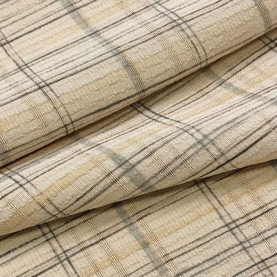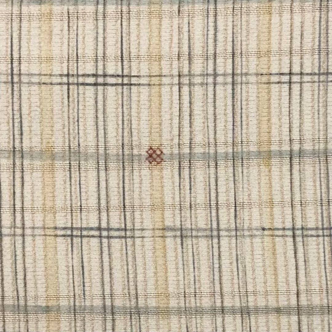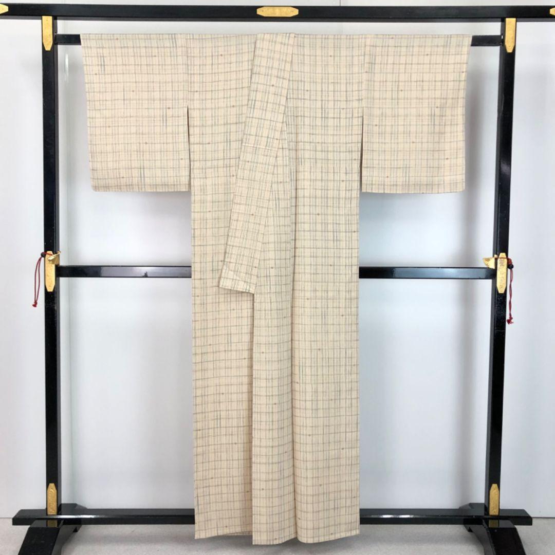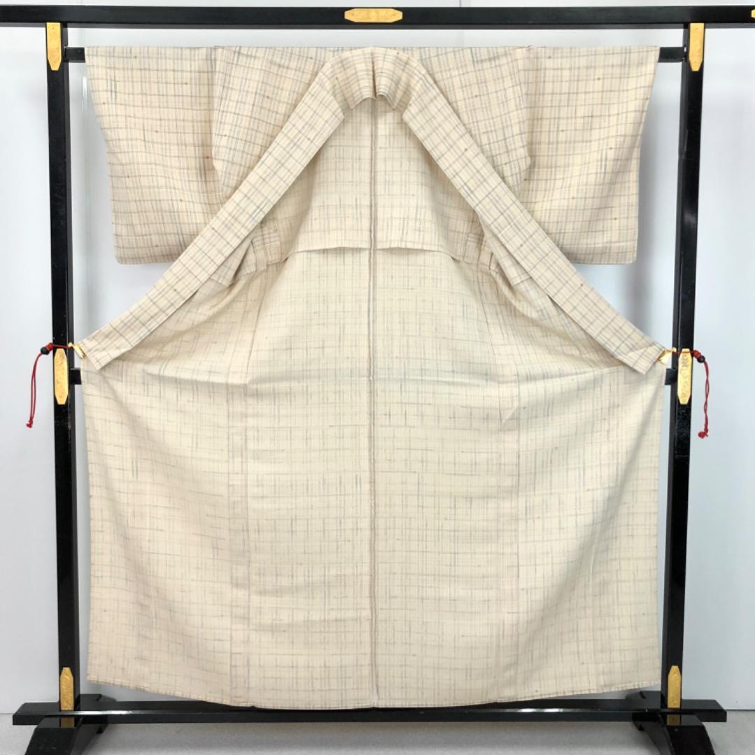 生成色のお色味の縮緬地に格子柄、四角い小花模様がデザインされた素敵な柄裄のお品でございます。