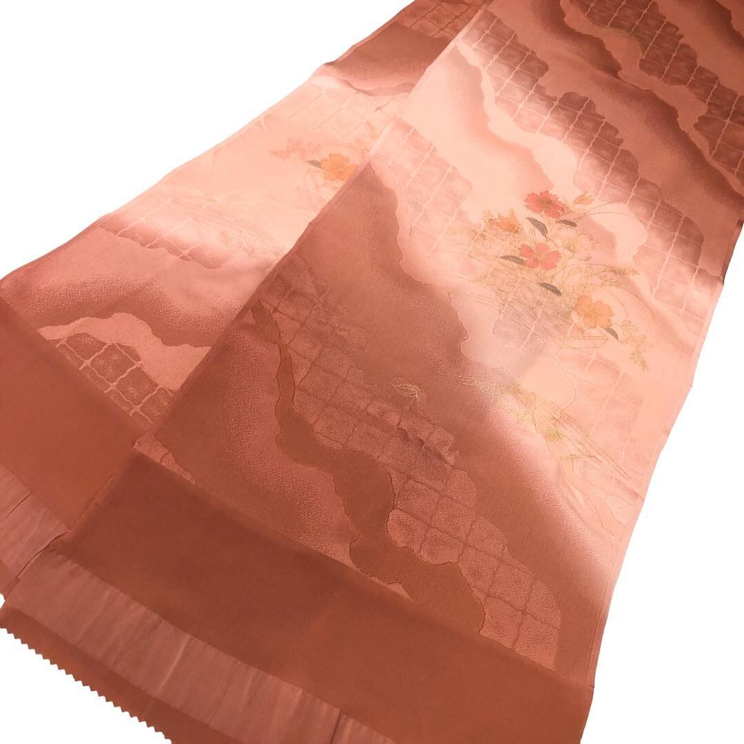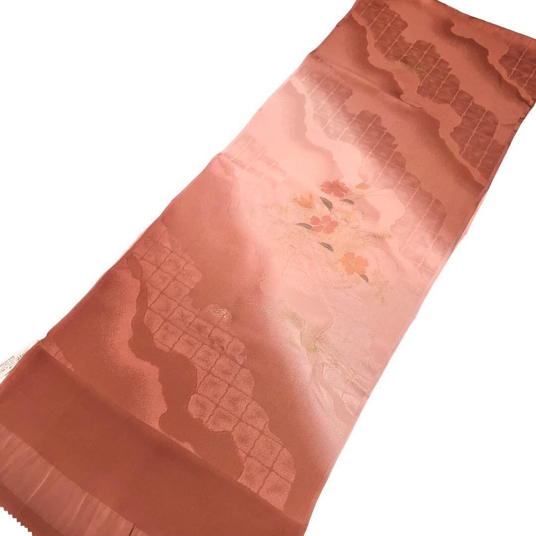 似紅色ベースのお色味に花模様がデザインされた綸子の帯揚げ、笹浪組の千晃の帯締めの素敵なお品でございます。