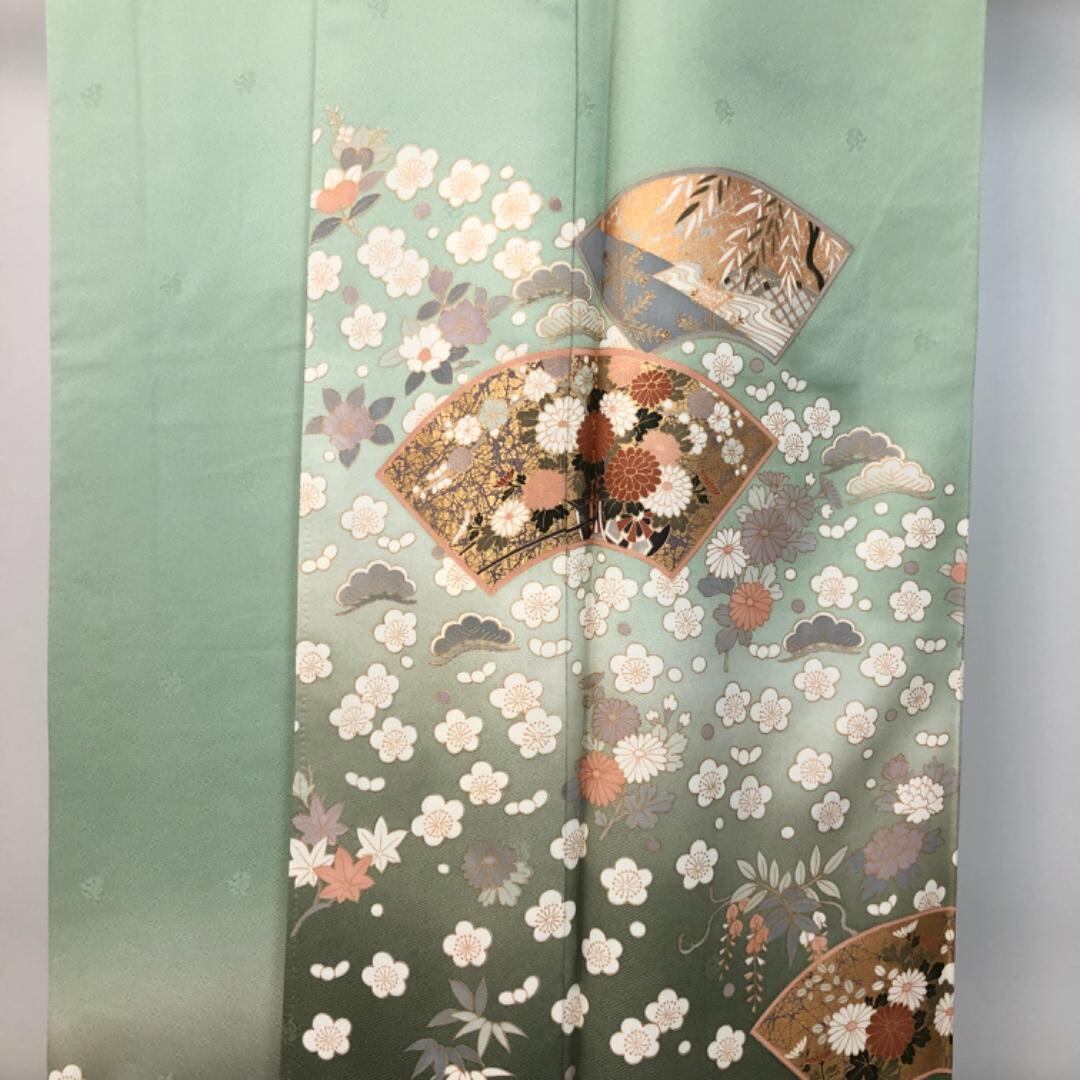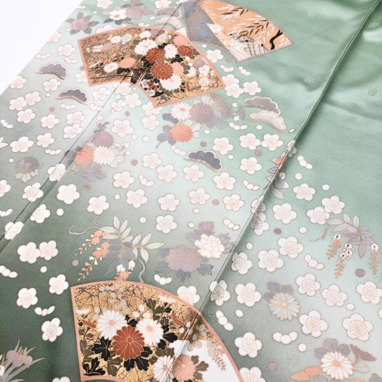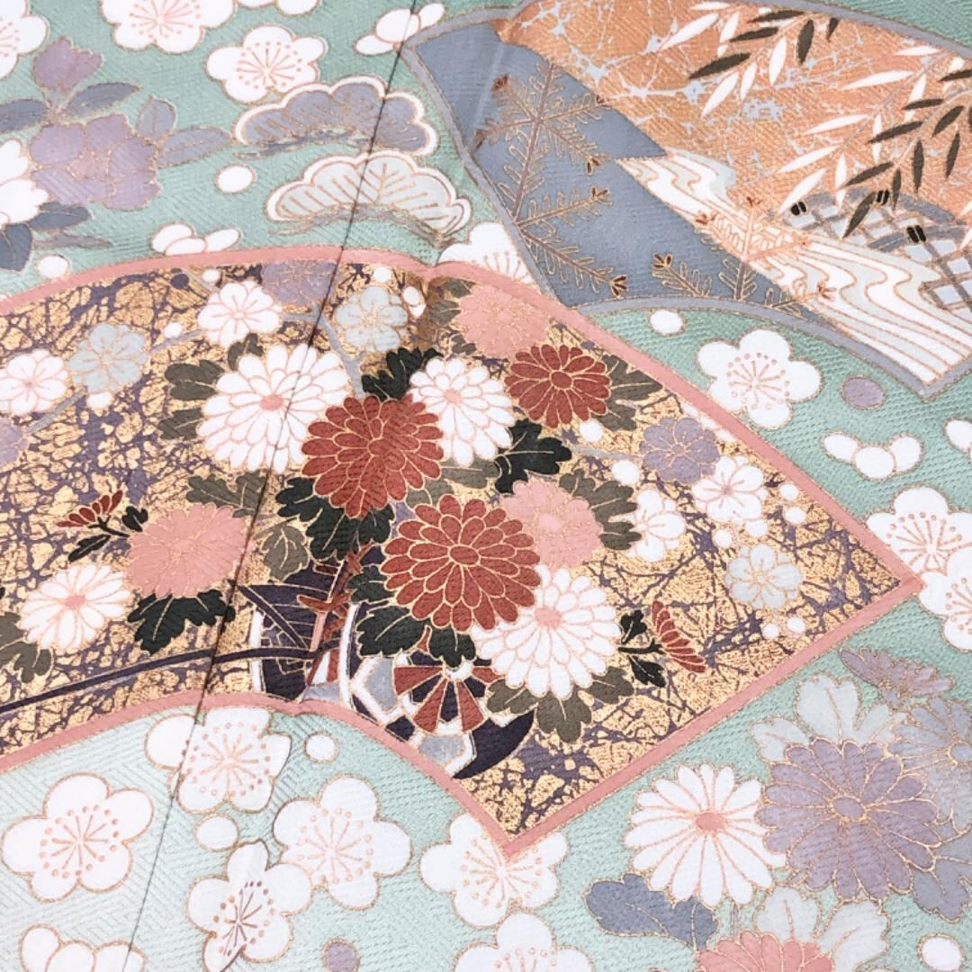青磁色のお色味に地紙に花模様、梅の花などの柄裄がデザインされた素敵なお品でございます。