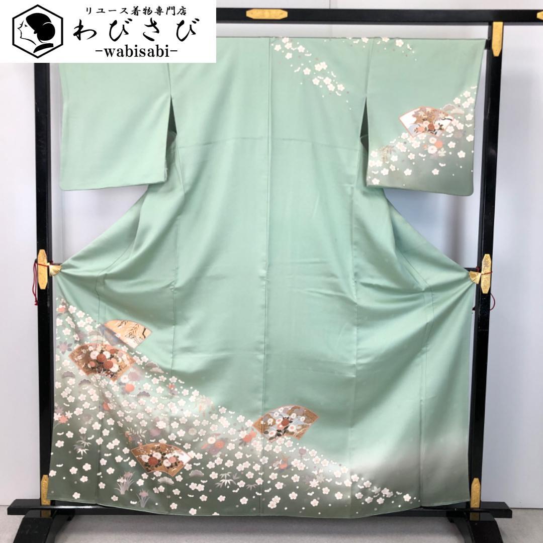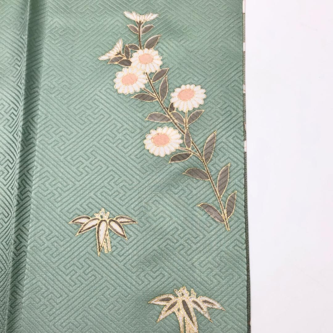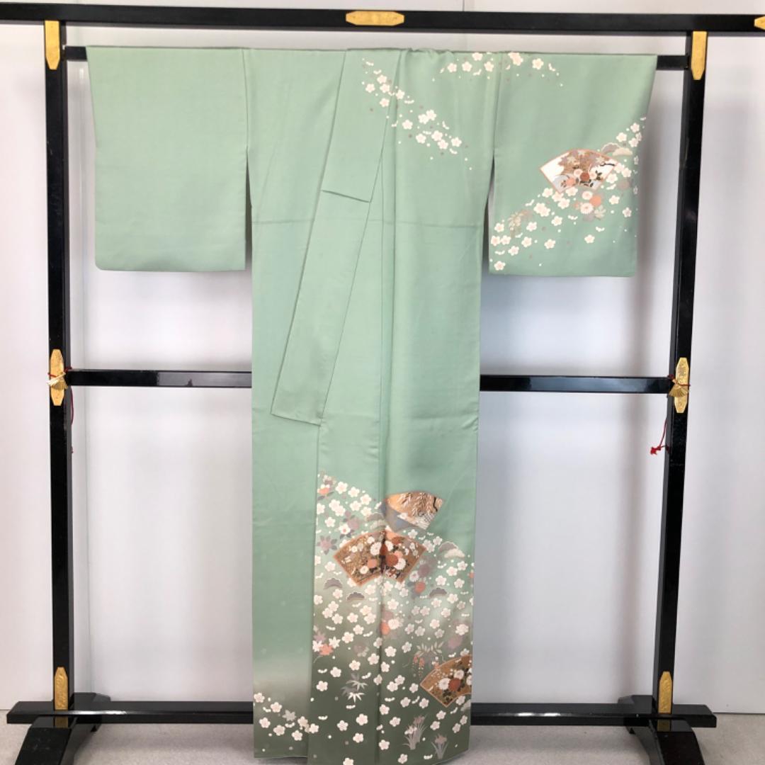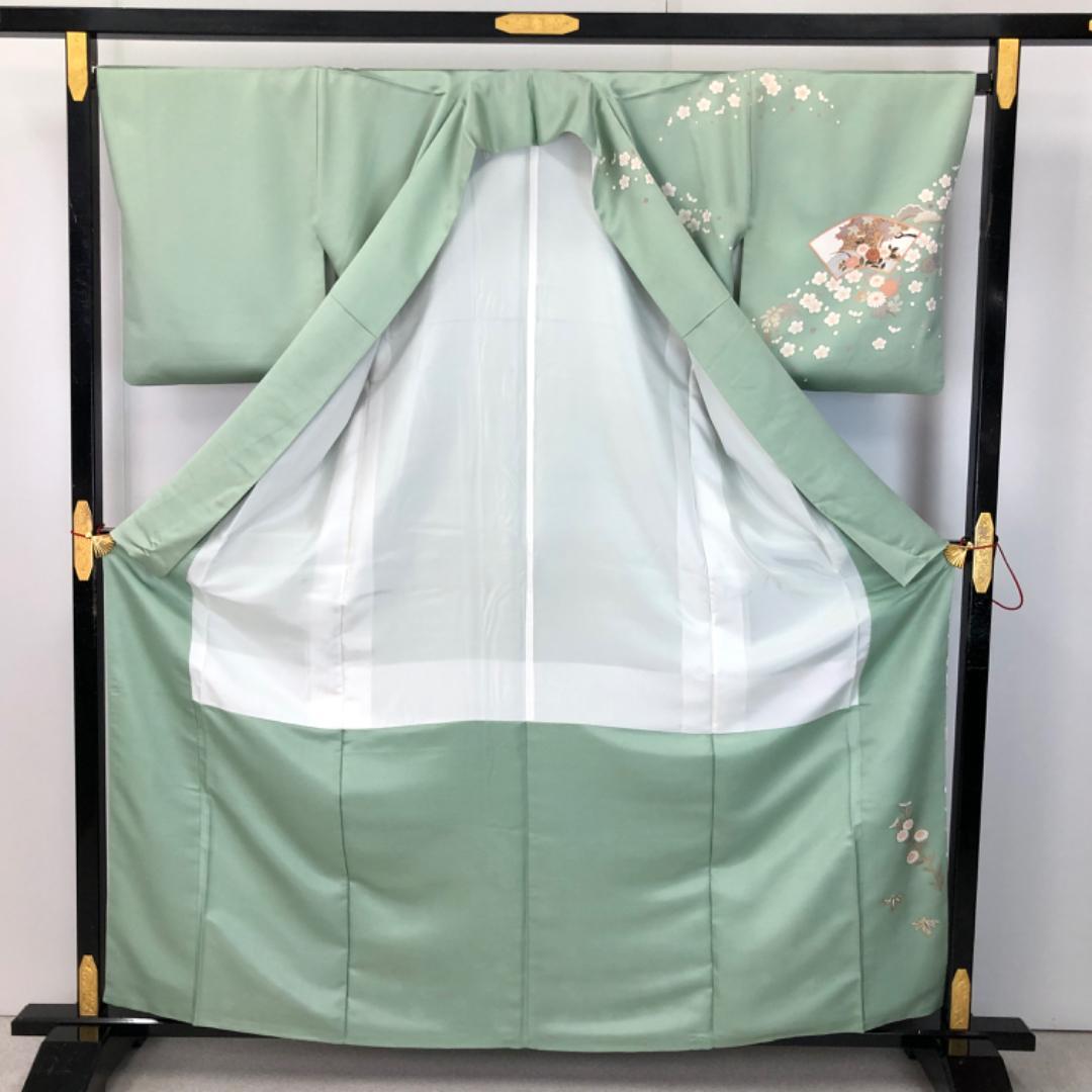 青磁色のお色味に地紙に花模様、梅の花などの柄裄がデザインされた素敵なお品でございます。