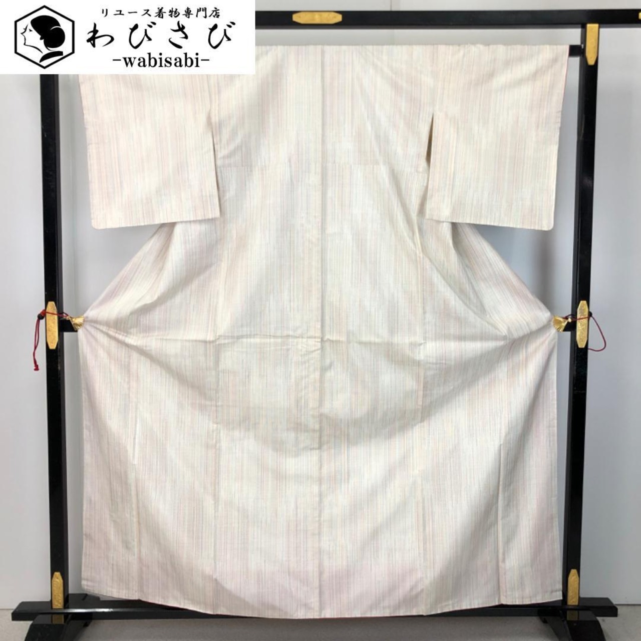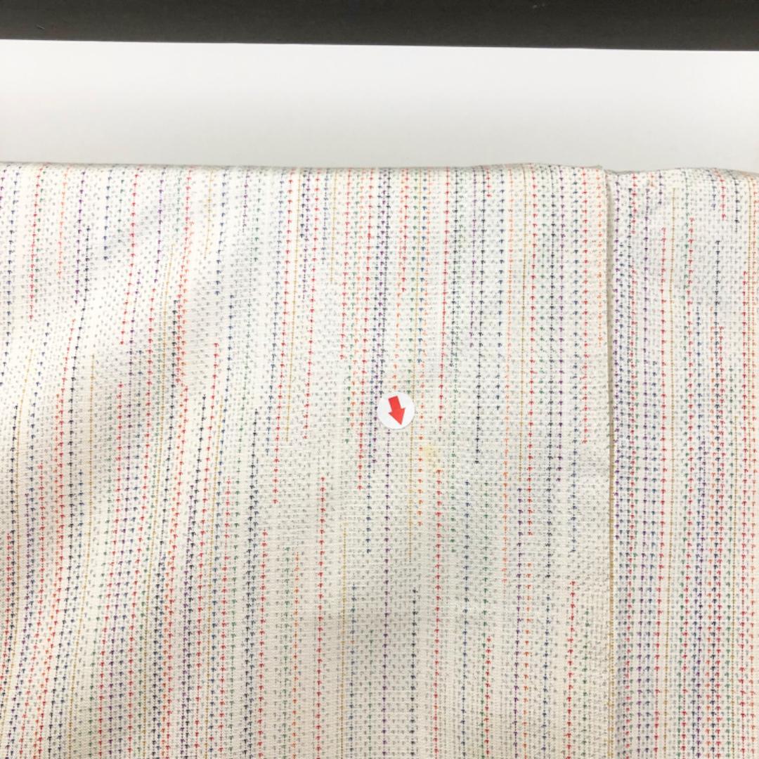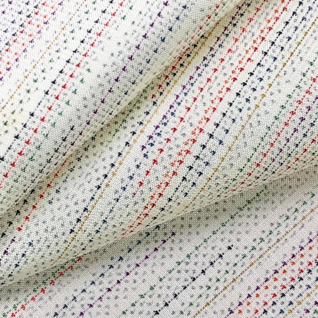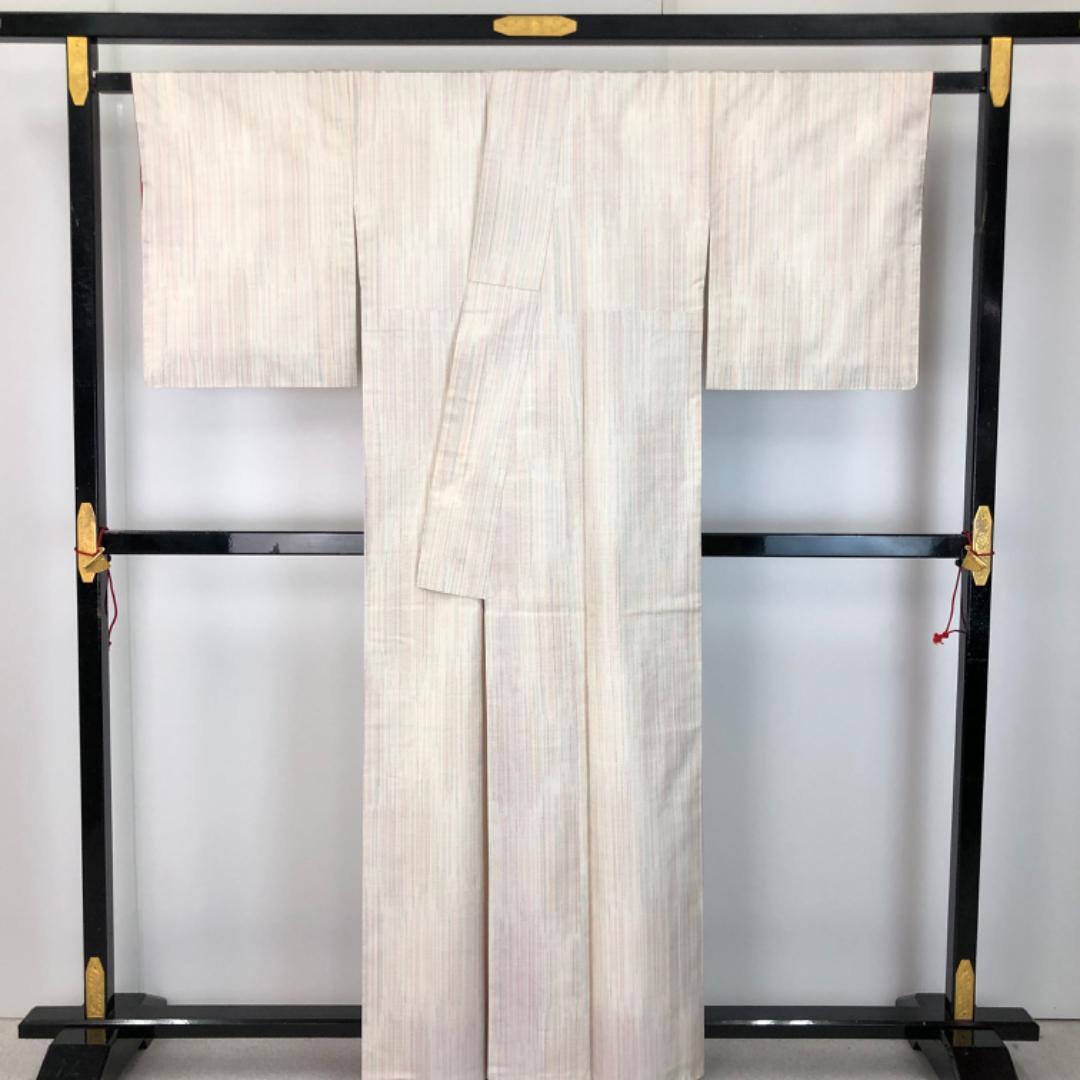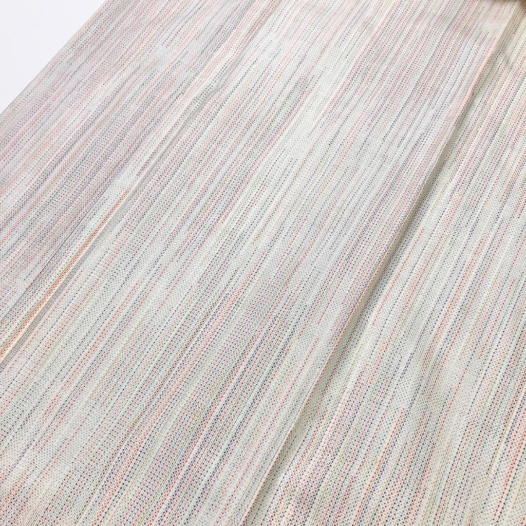 乳白色の上品なお色味に多彩なお色の絣でデザインされた柔らかい雰囲気の縦柄模様が素敵なお品でございます。