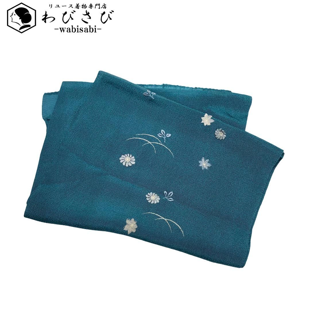和装小物 帯揚げ 正絹 芝に花 刺繍 縮緬 藍鉄色 C-6736 着物 きもの kimono 和服 和装 中古 リサイクル着物 【送料無料】