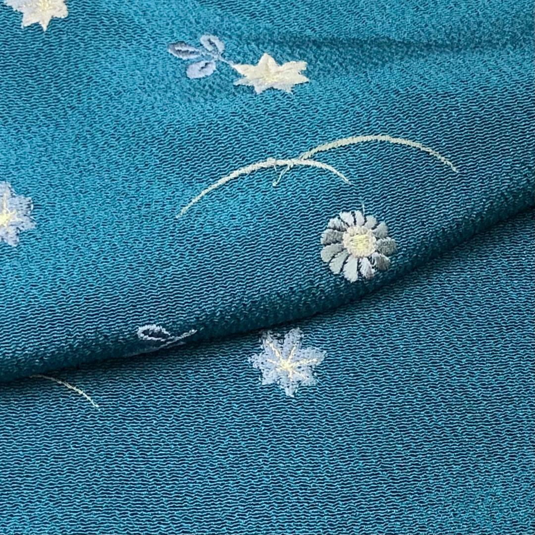 藍鉄色のお色味に可愛らしい刺繍の芝に花がデザインされた素敵な縮緬のお品でございます。