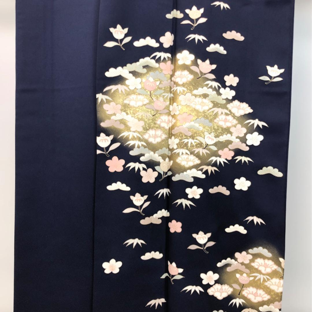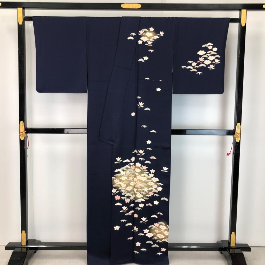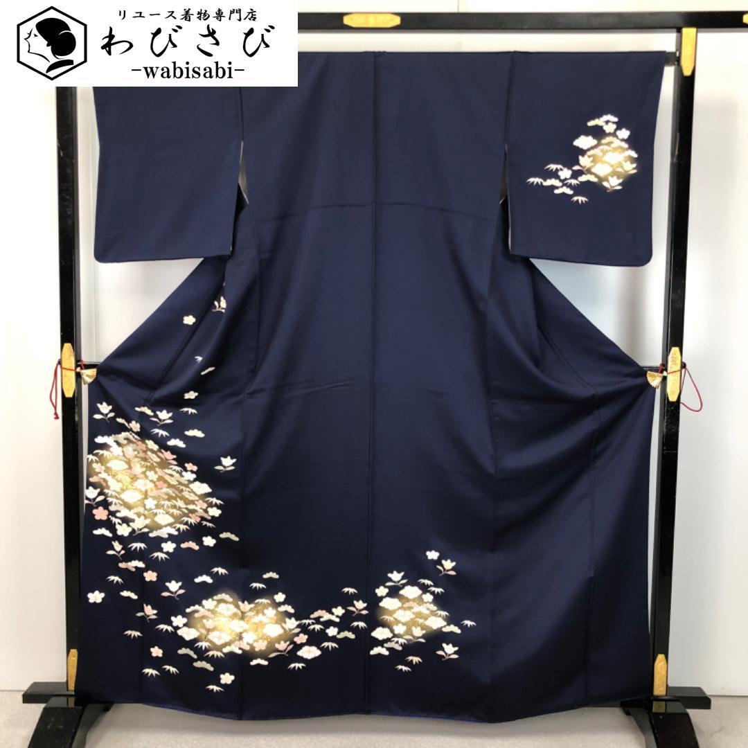 訪問着 椿に橘 松 金彩 濃紺色 K-5615 着物 きもの kimono 和服 和装 中古 リサイクル着物 【送料無料】