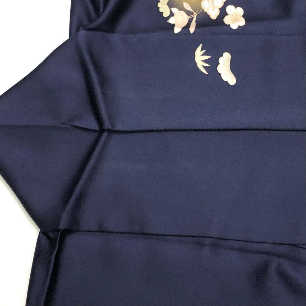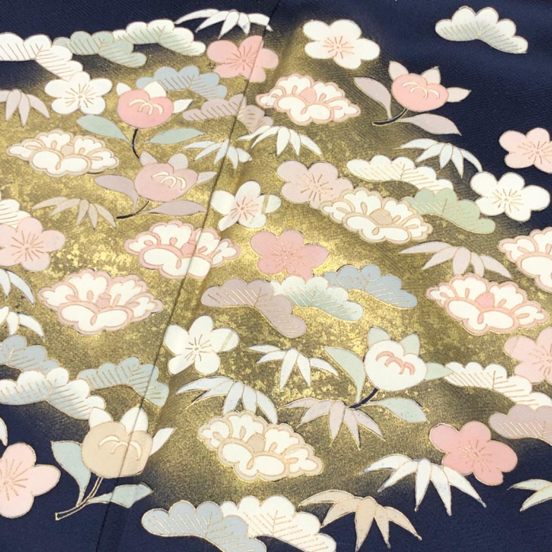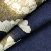 濃紺色のお色味に金彩が使われた椿に橘、松などの柄裄がデザインされた素敵なお品でございます。