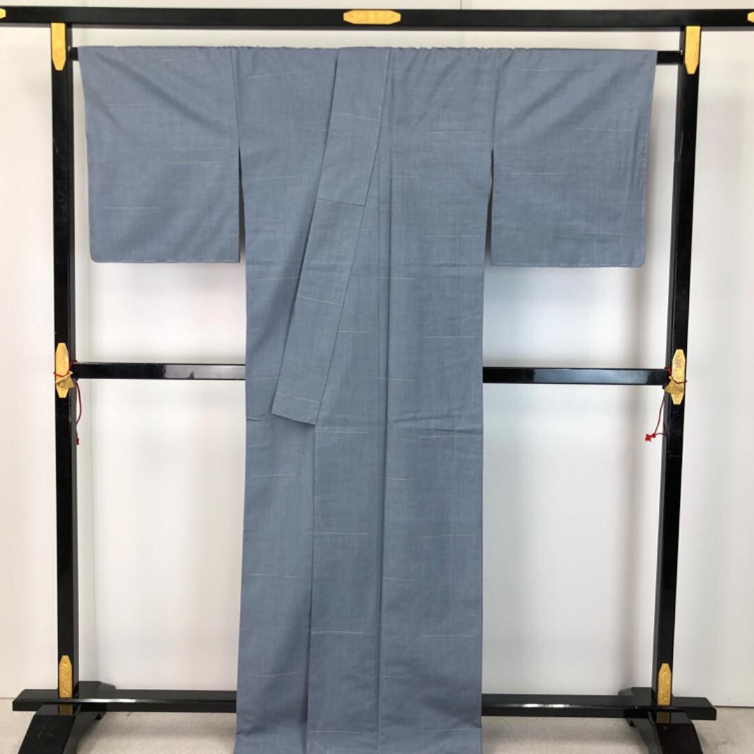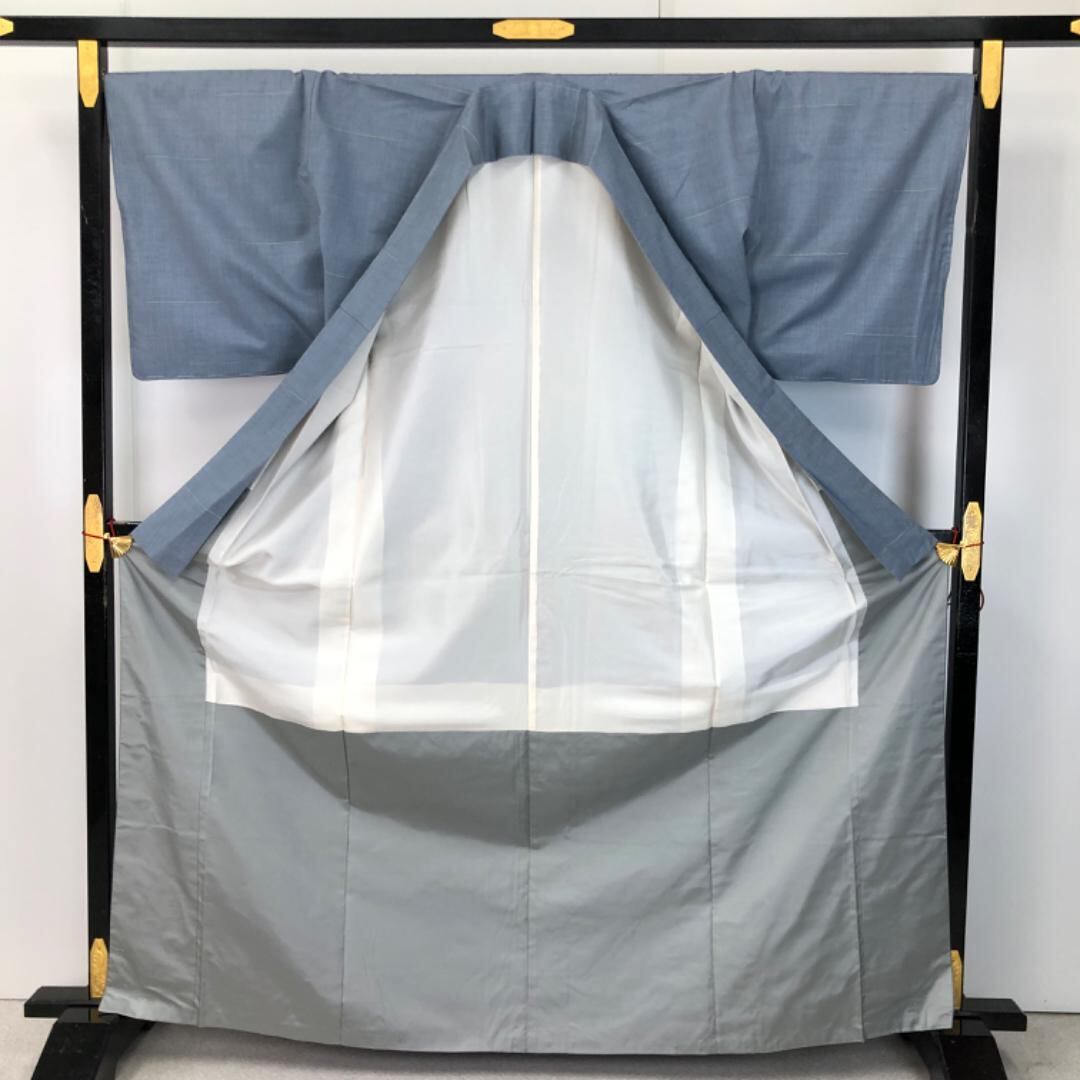 紬着物 織模様 青袋鼠色 しつけ糸 トールサイズ K-5613 着物 きもの kimono 和服 和装 中古 リサイクル着物 【送料無料】