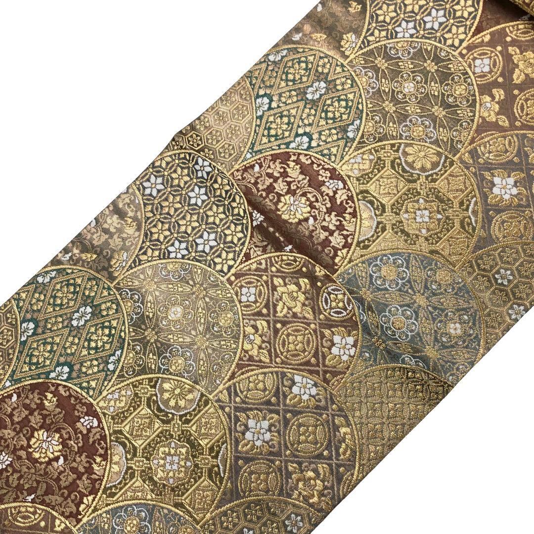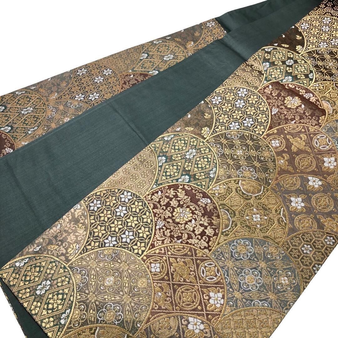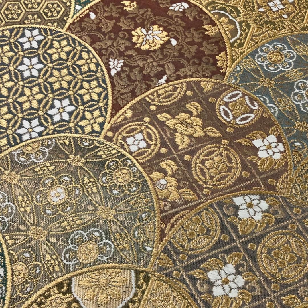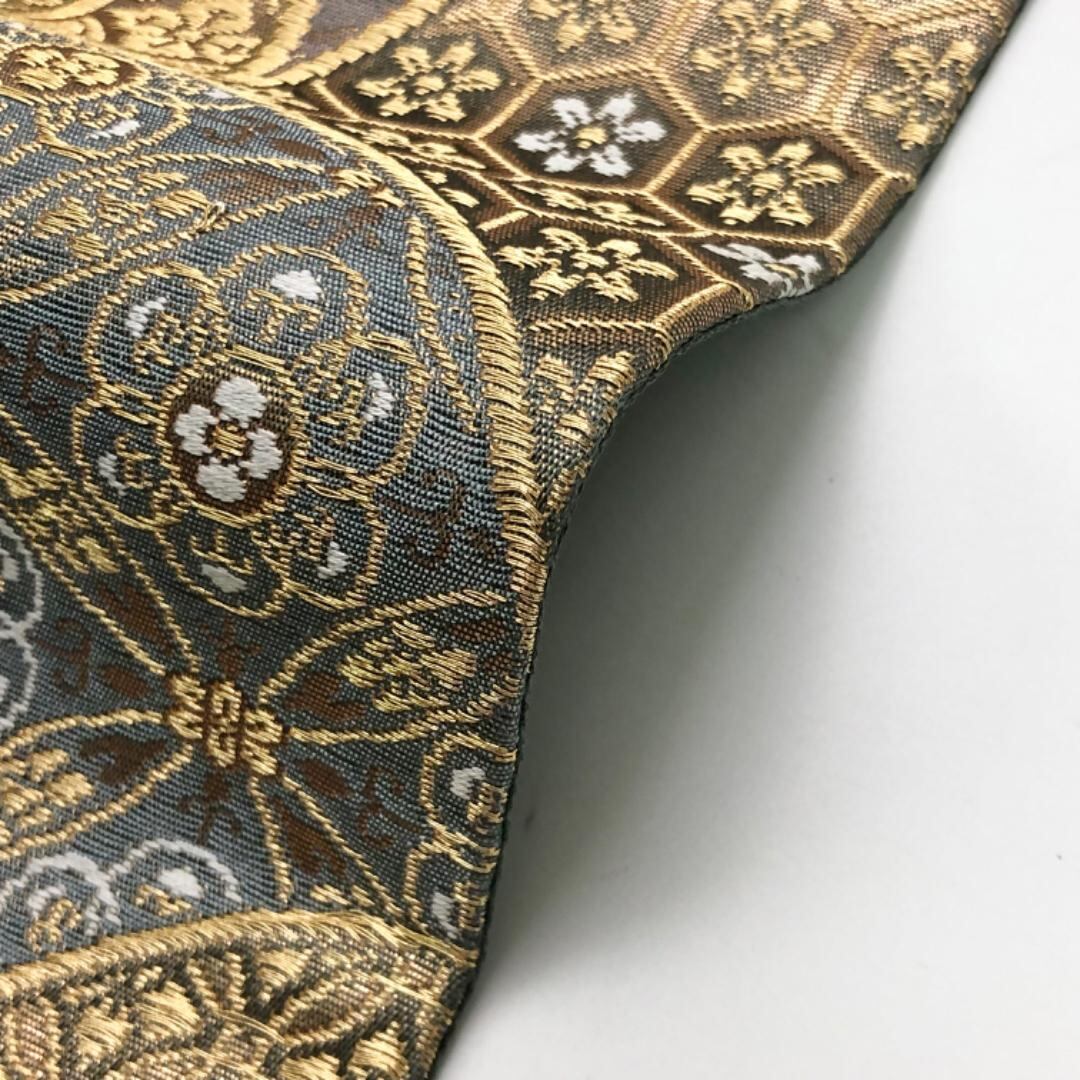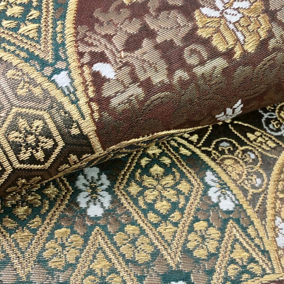 金糸が使われた煌びやかな色彩、華柄模様、花七宝、花菱、花亀甲などの美しい柄裄がデザインされた素敵なお品でございます。