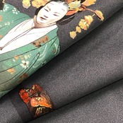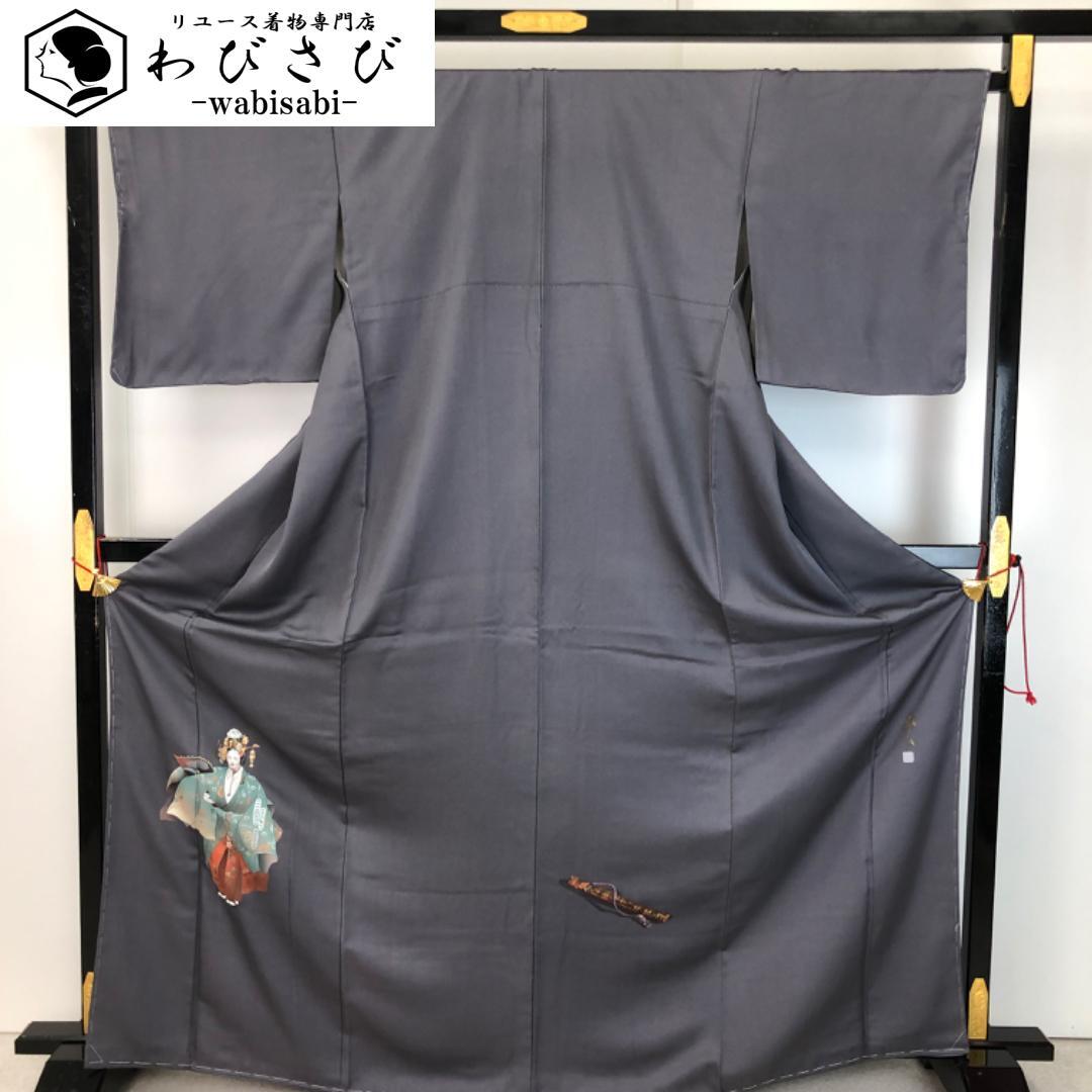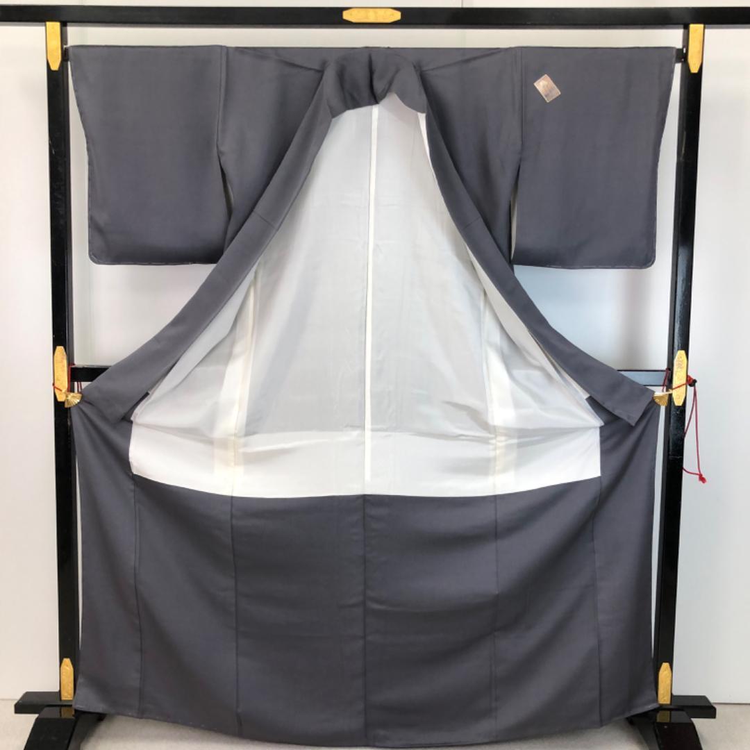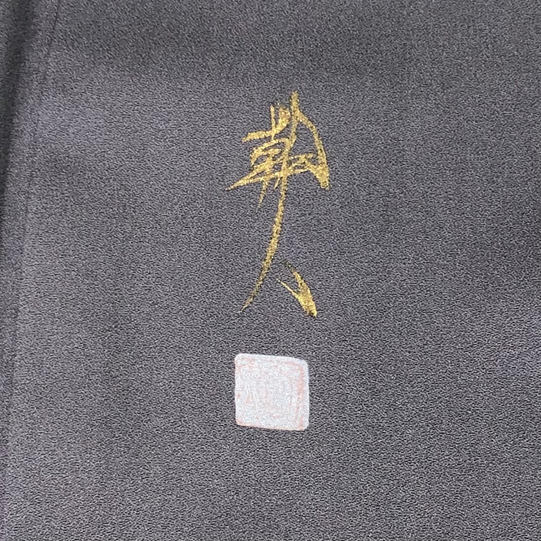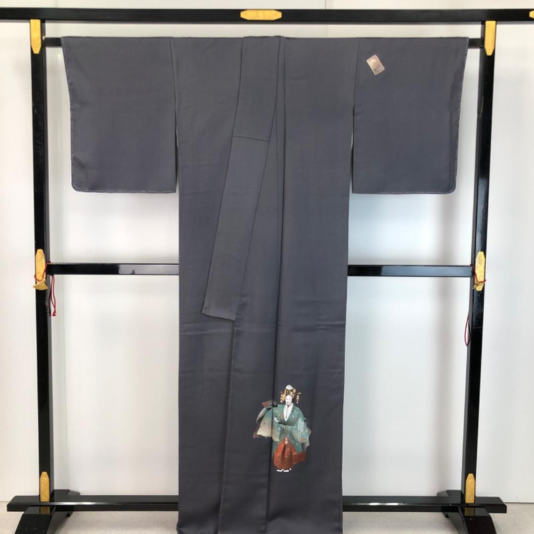 藍鼠色のお色味に能羽衣の柄裄がデザインされた素敵なお品でございます。