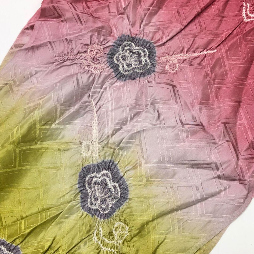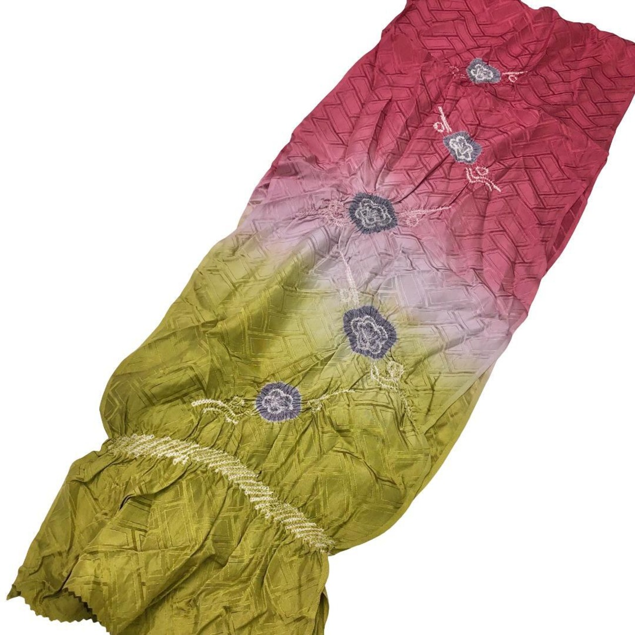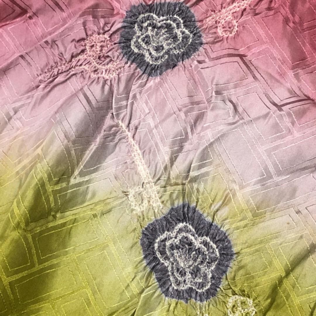 臙脂色ベースの染分けのお色味に絞りの花模様がデザインされた素敵なお品でございます。