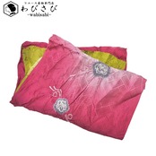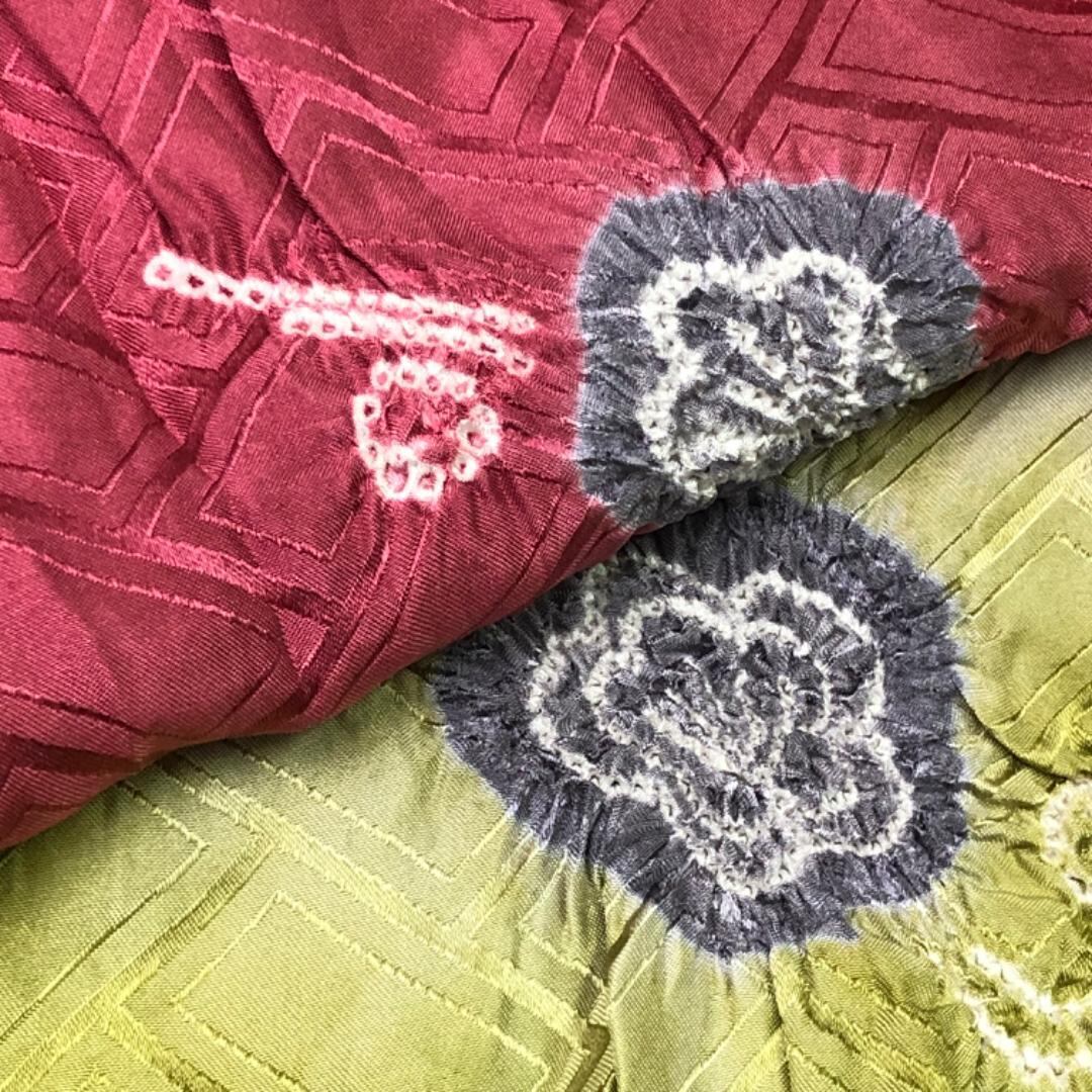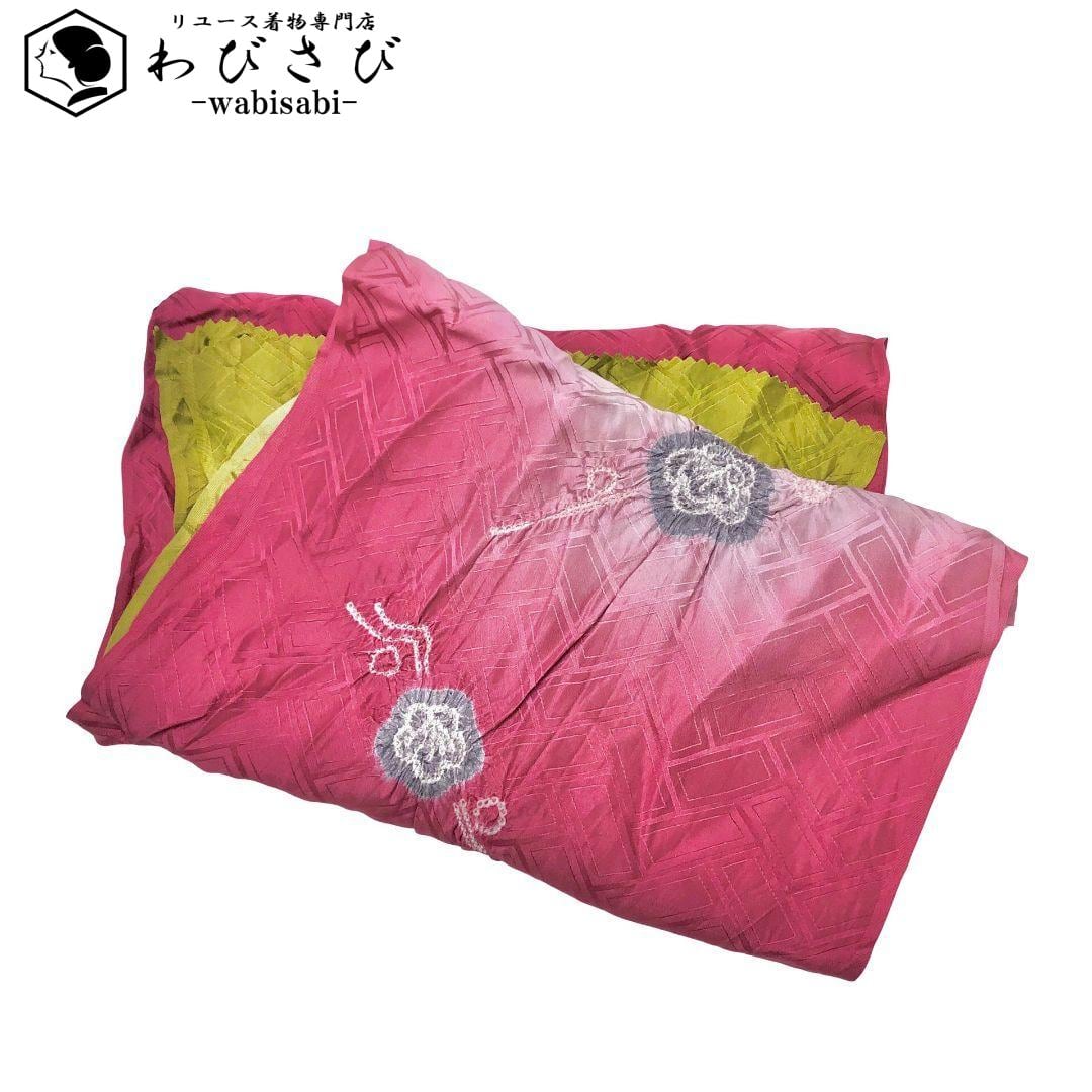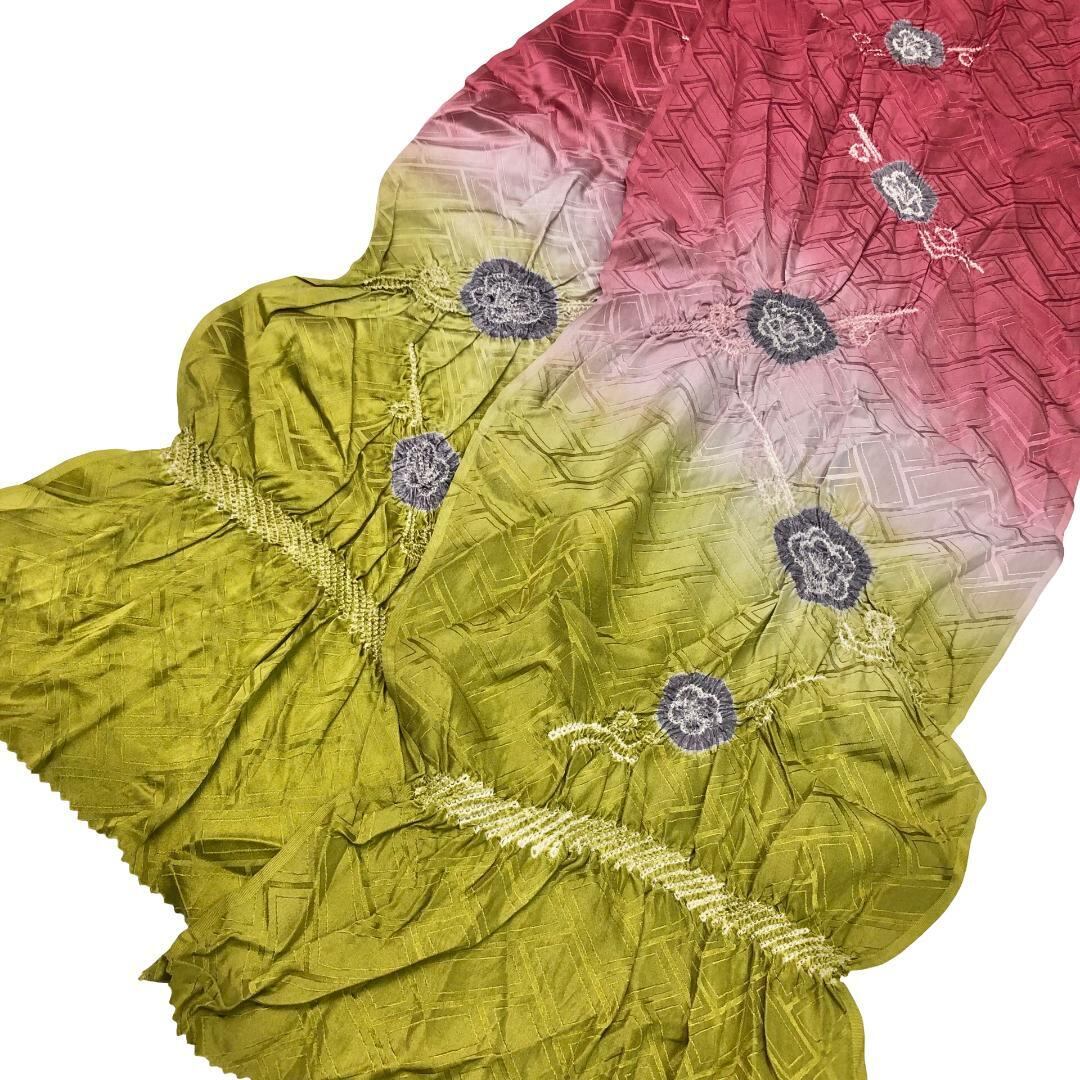 臙脂色ベースの染分けのお色味に絞りの花模様がデザインされた素敵なお品でございます。