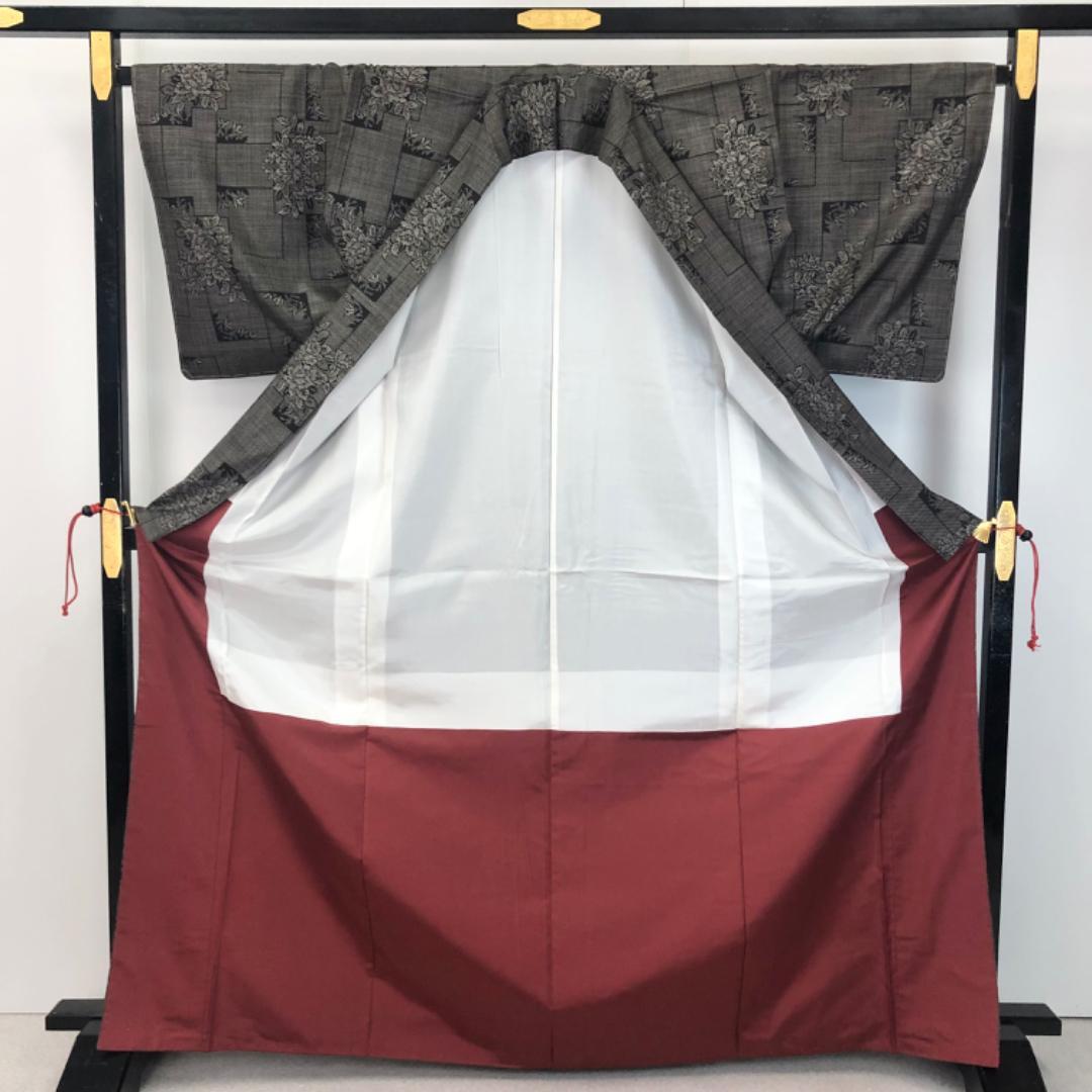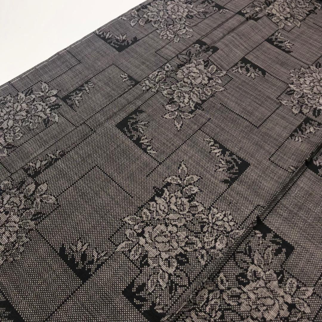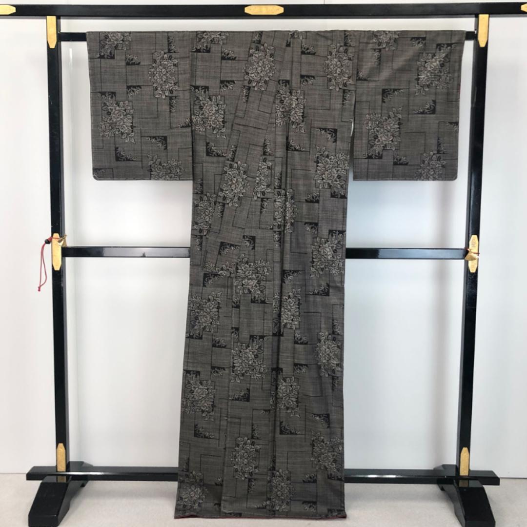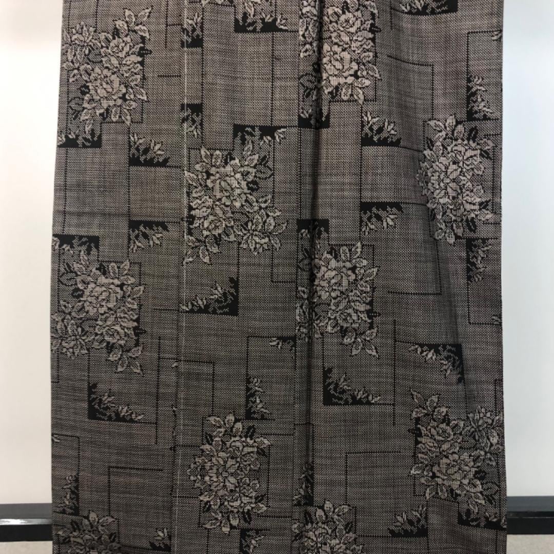 茶泥染の雰囲気の良いお色味に四角に花模様がデザインされた素敵な柄裄のお品でございます。