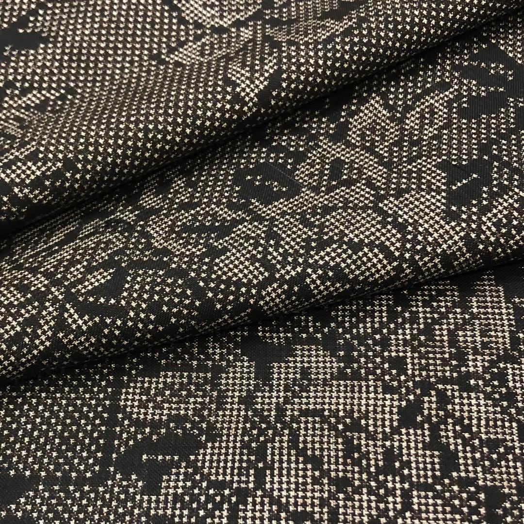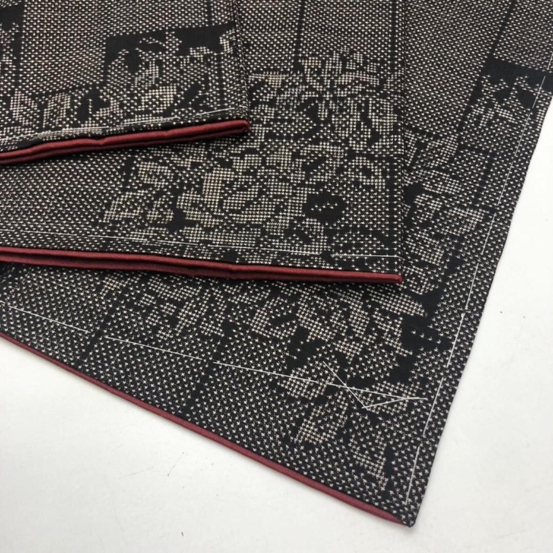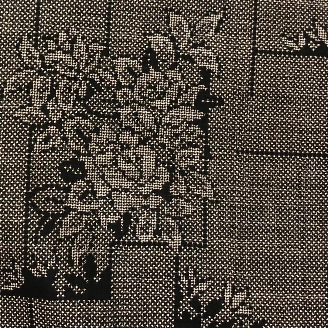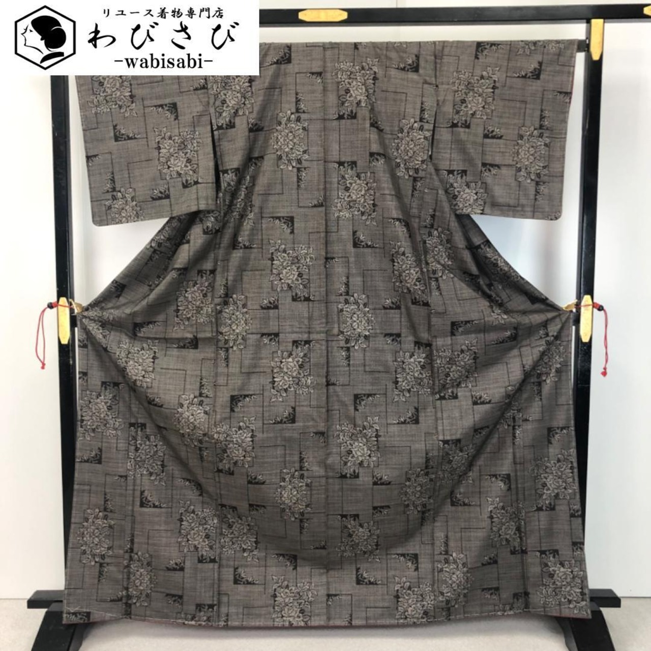 茶泥染の雰囲気の良いお色味に四角に花模様がデザインされた素敵な柄裄のお品でございます。