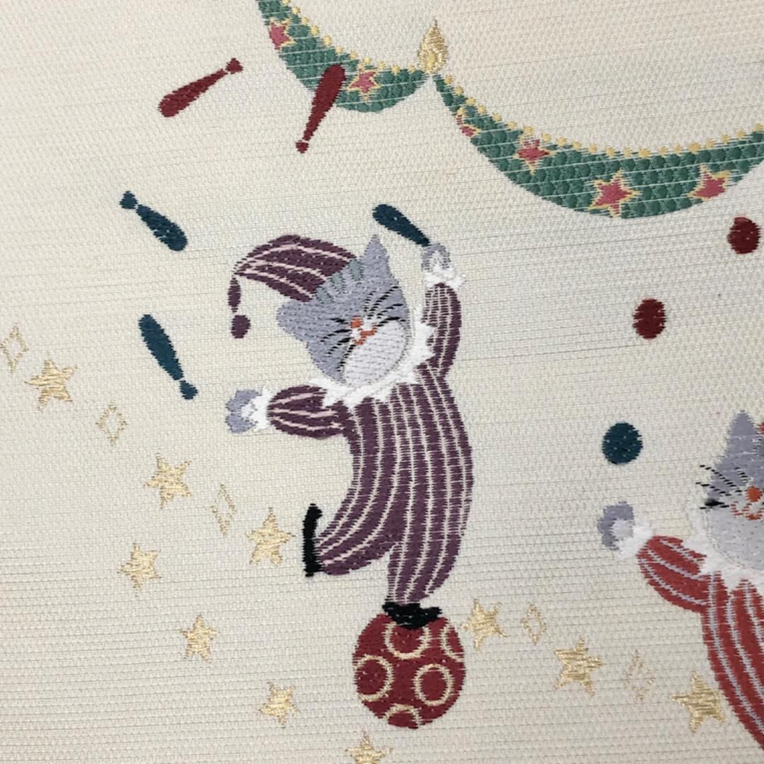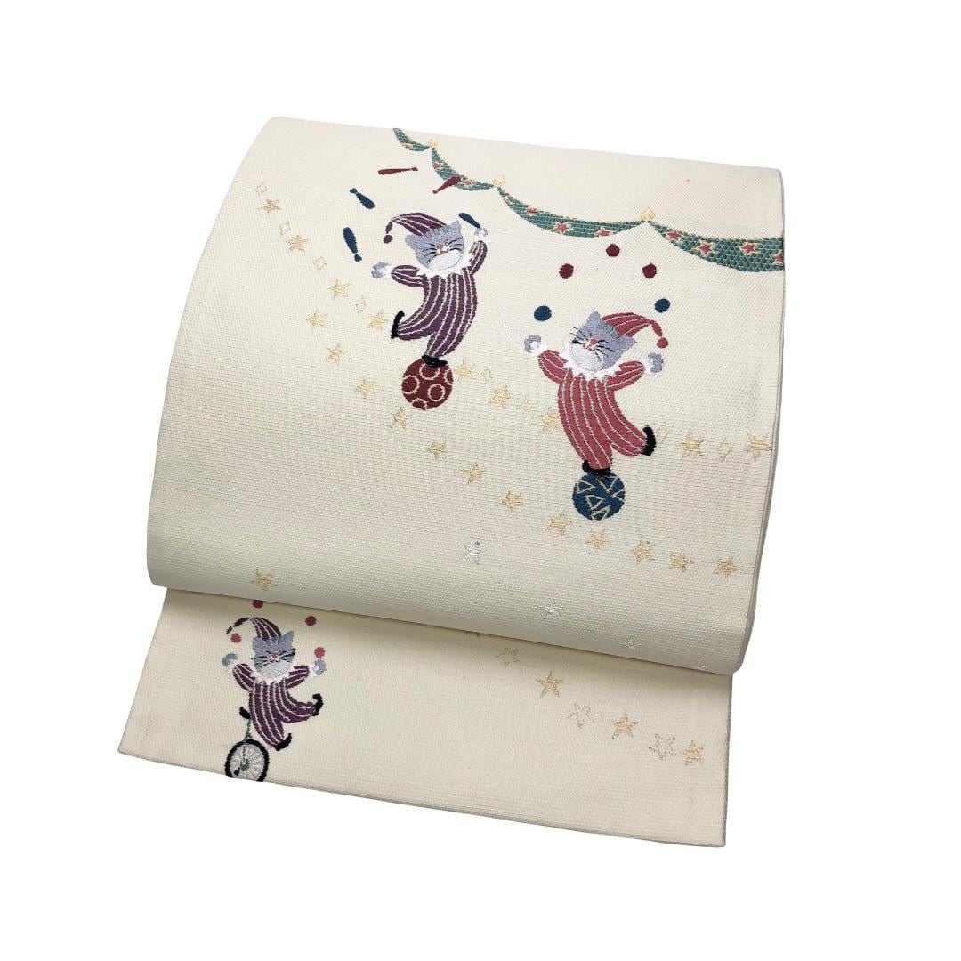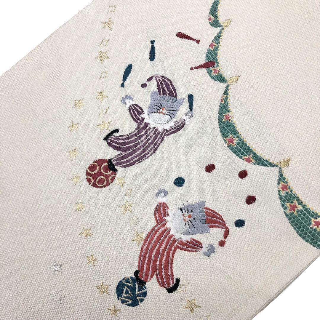 鳥の子色のお色味に玉乗りしながらお手玉やジャグリングしている猫のサーカスの柄行がデザインされた素敵なお品でございます。