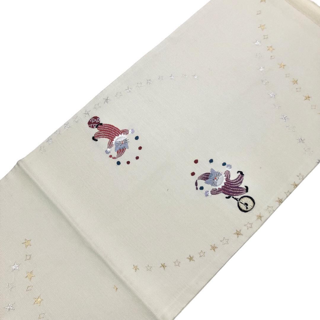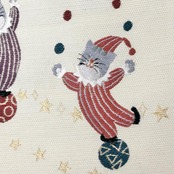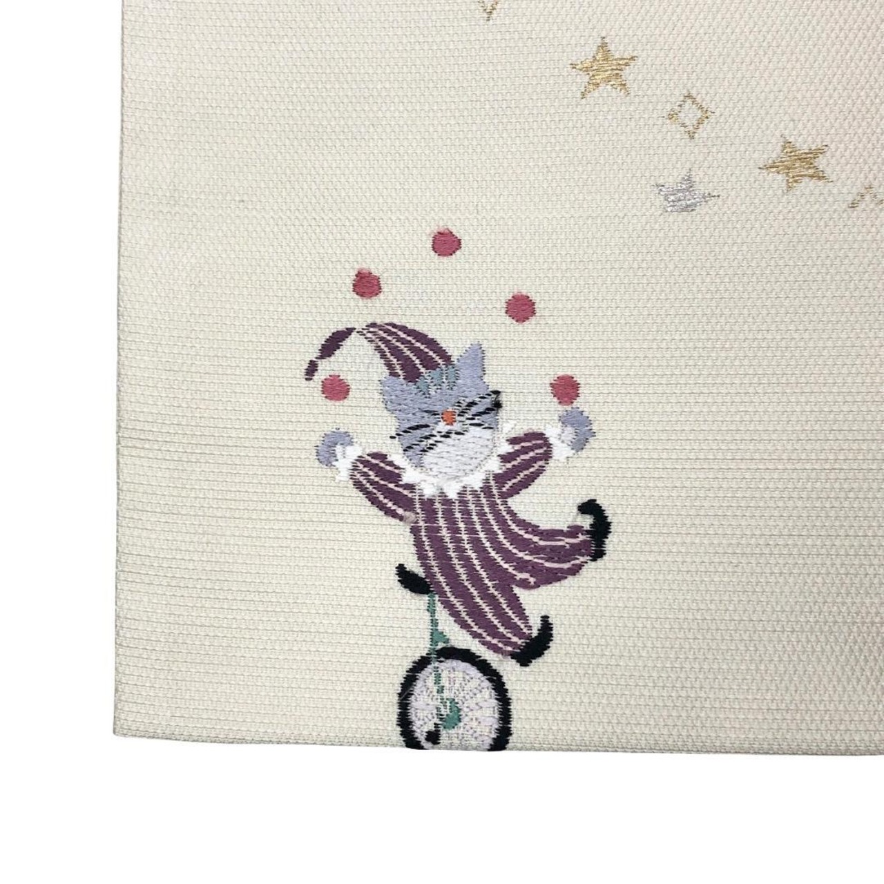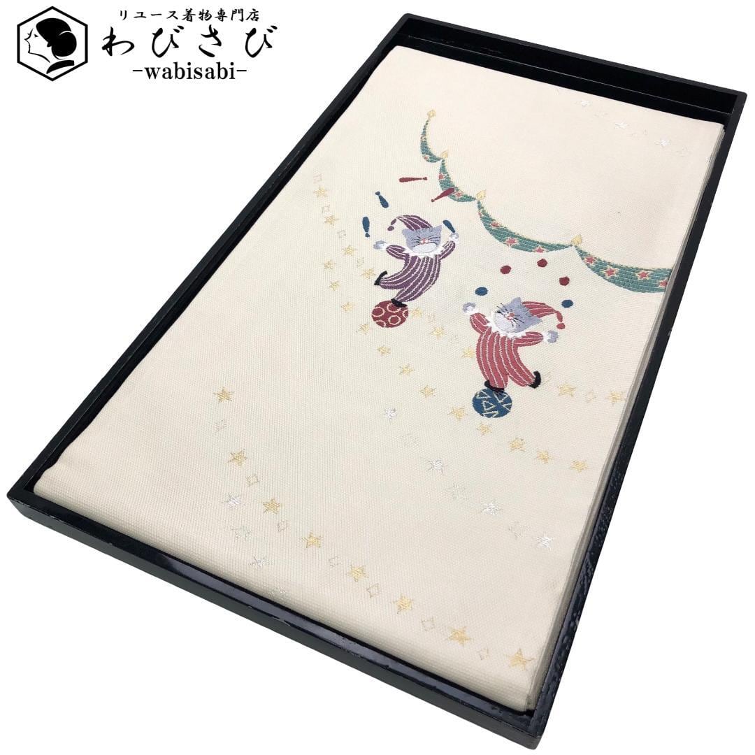 鳥の子色のお色味に玉乗りしながらお手玉やジャグリングしている猫のサーカスの柄行がデザインされた素敵なお品でございます。