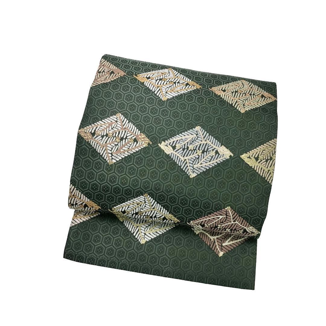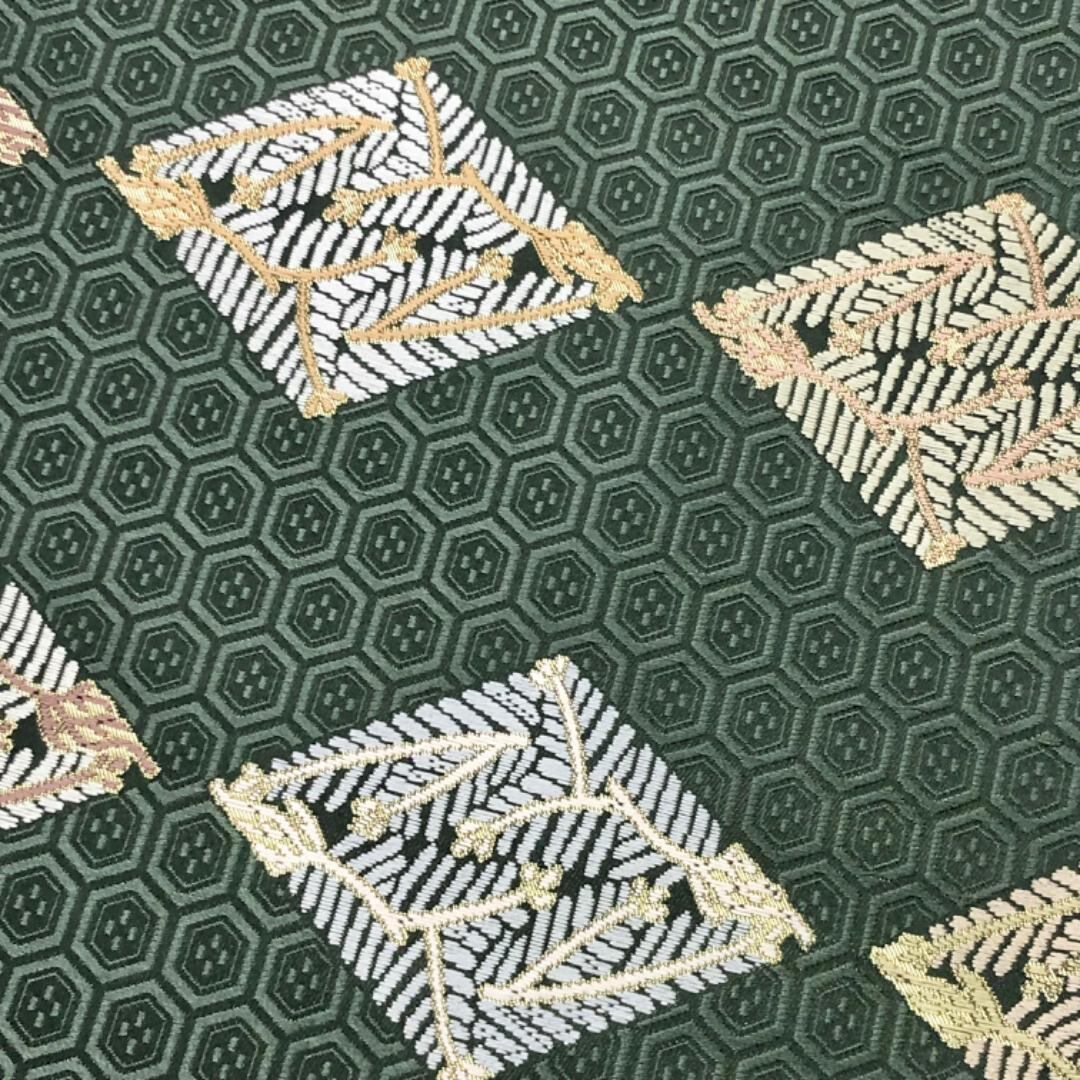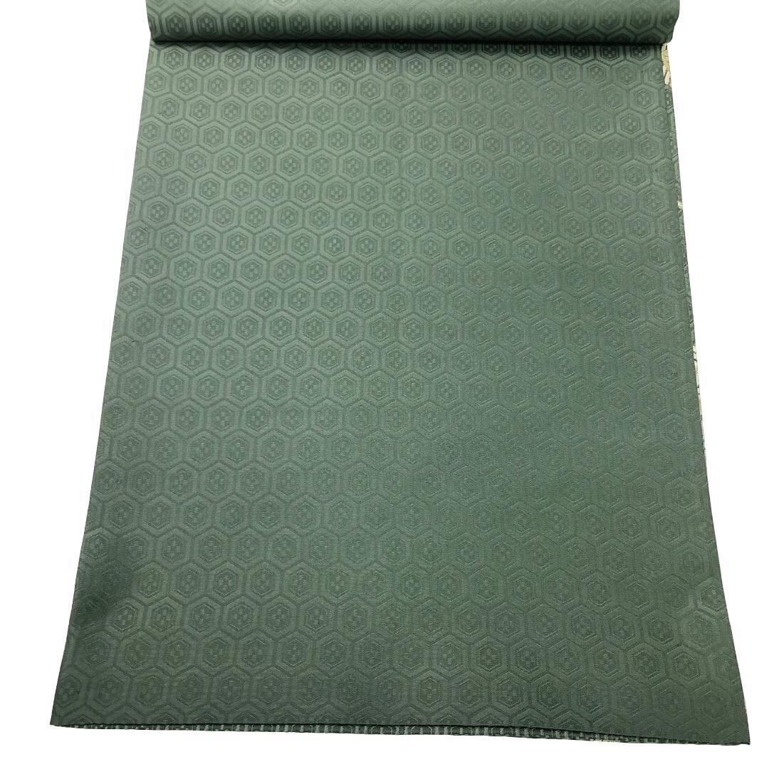 老緑色のお色味に亀甲繋ぎ、菱形に松葉模様の柄裄がデザインされた雰囲気の良い素敵なお品でございます。
