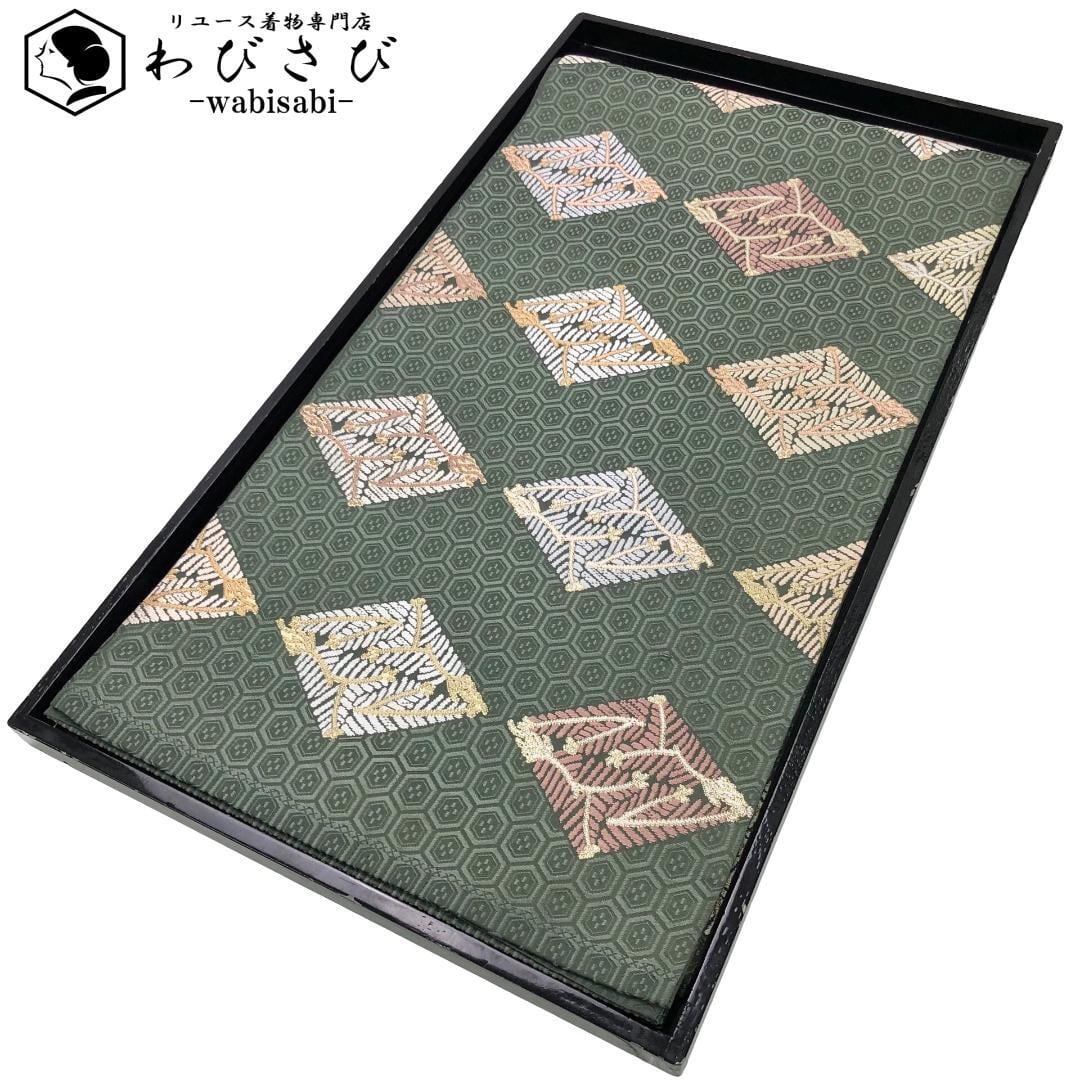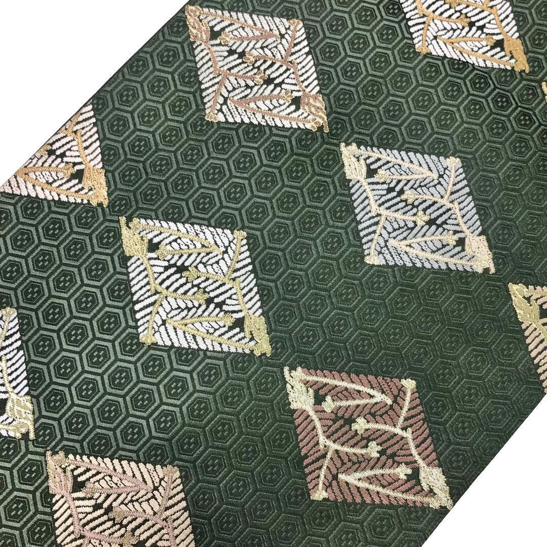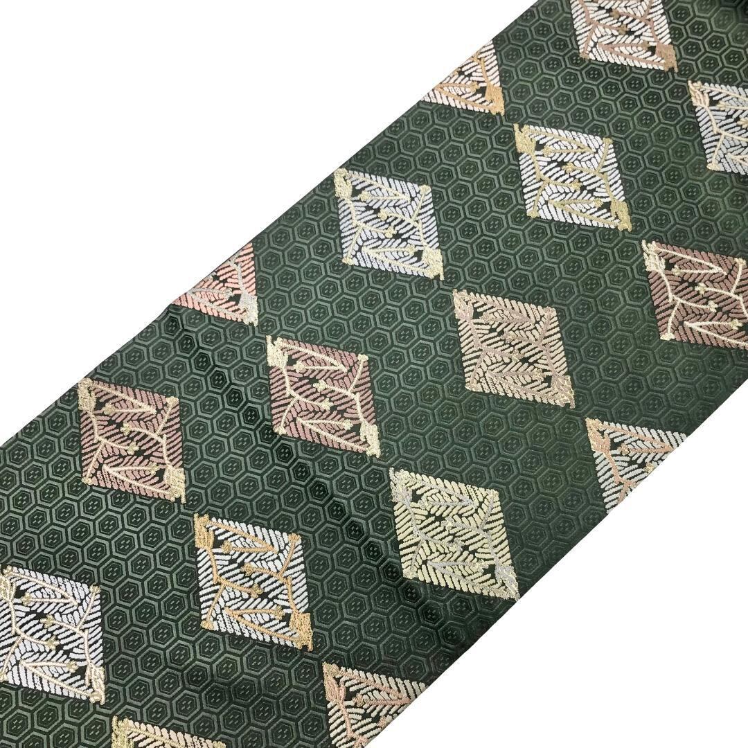 老緑色のお色味に亀甲繋ぎ、菱形に松葉模様の柄裄がデザインされた雰囲気の良い素敵なお品でございます。
