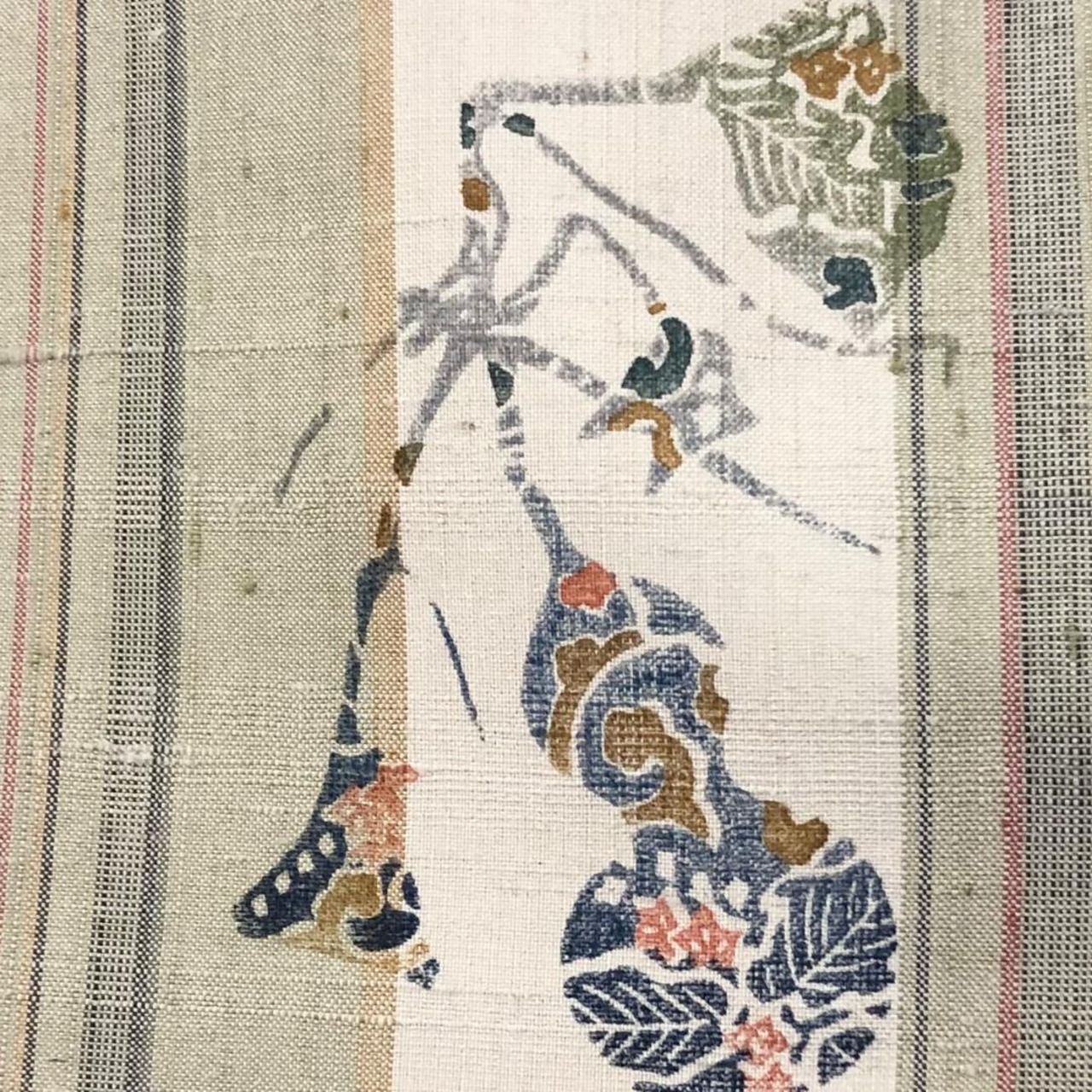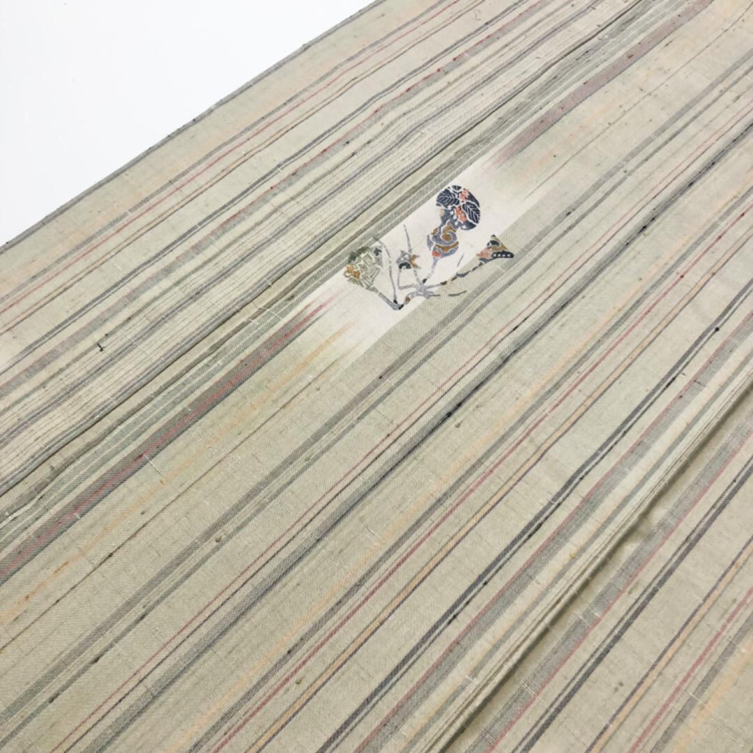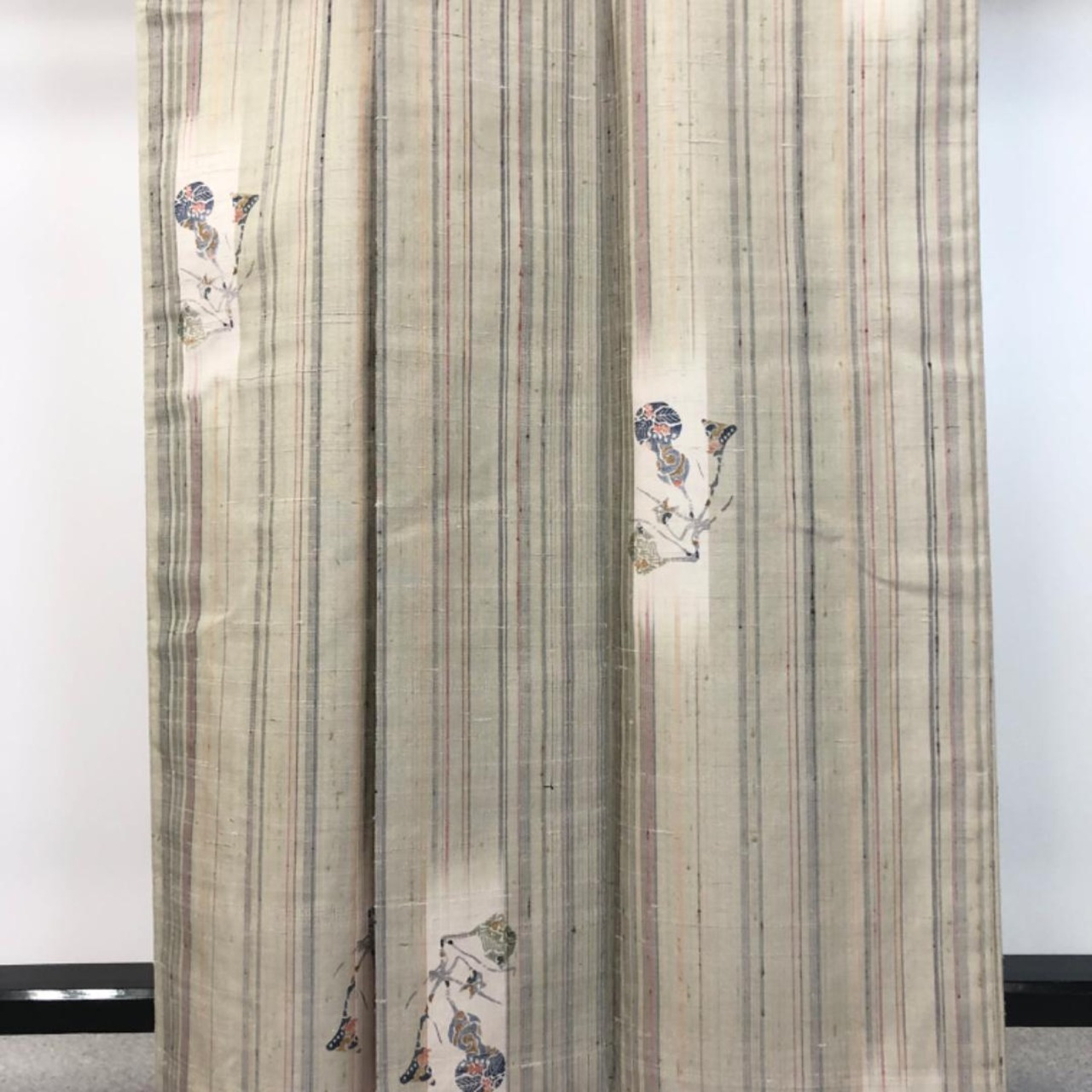 藁色の品のあるお色味に型染の瓢箪柄、縦縞模様がデザインされた雰囲気の良い素敵なお品でございます。