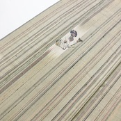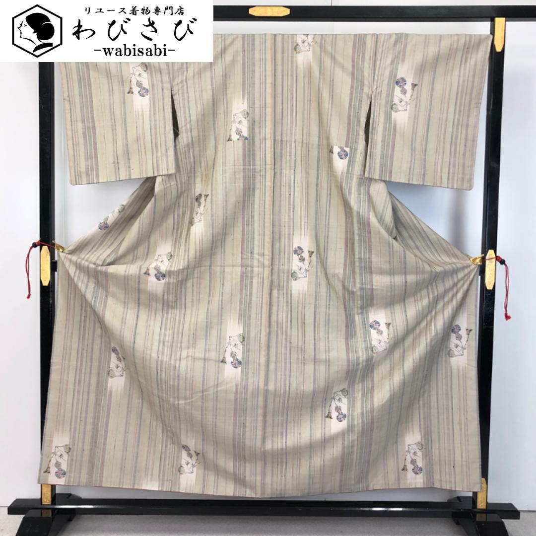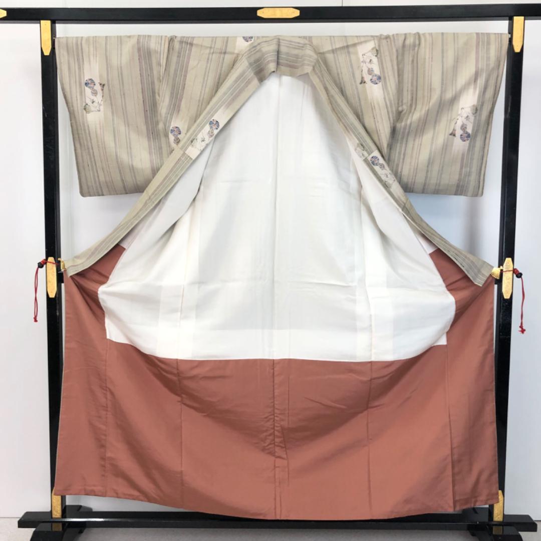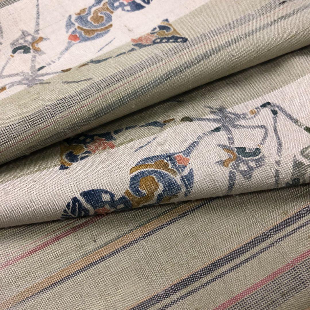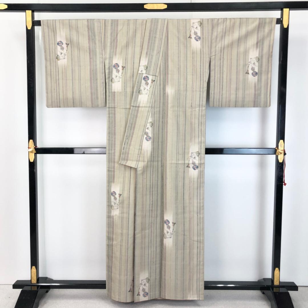 藁色の品のあるお色味に型染の瓢箪柄、縦縞模様がデザインされた雰囲気の良い素敵なお品でございます。