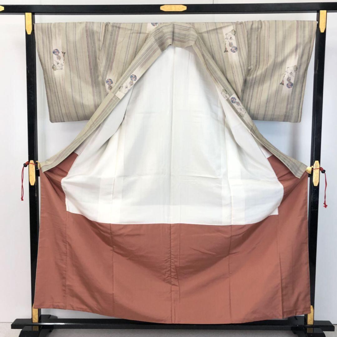 紬着物 縦縞模様 型染 瓢箪柄 藁色 K-5575 着物 きもの kimono 和服 和装 中古 リサイクル着物 【送料無料】