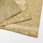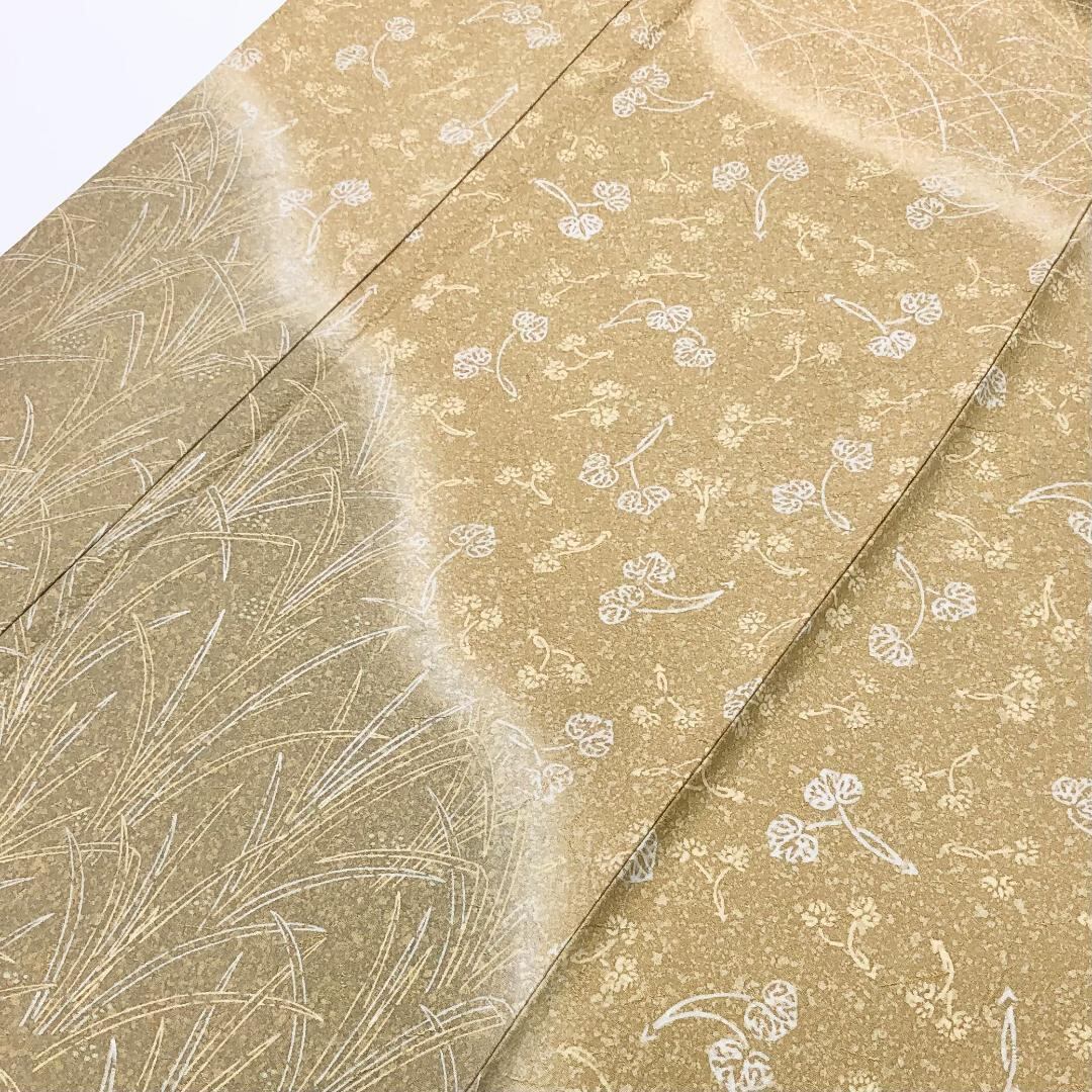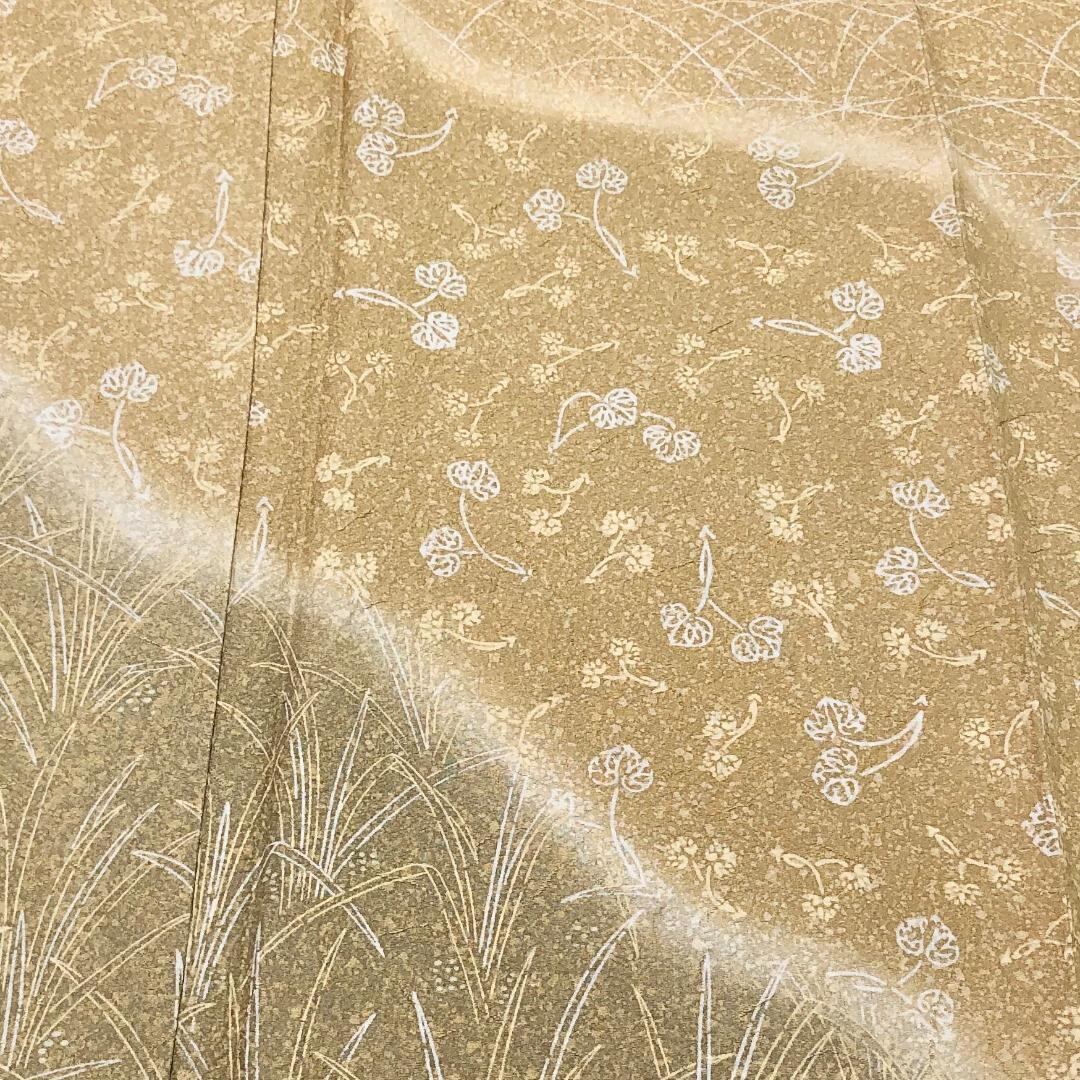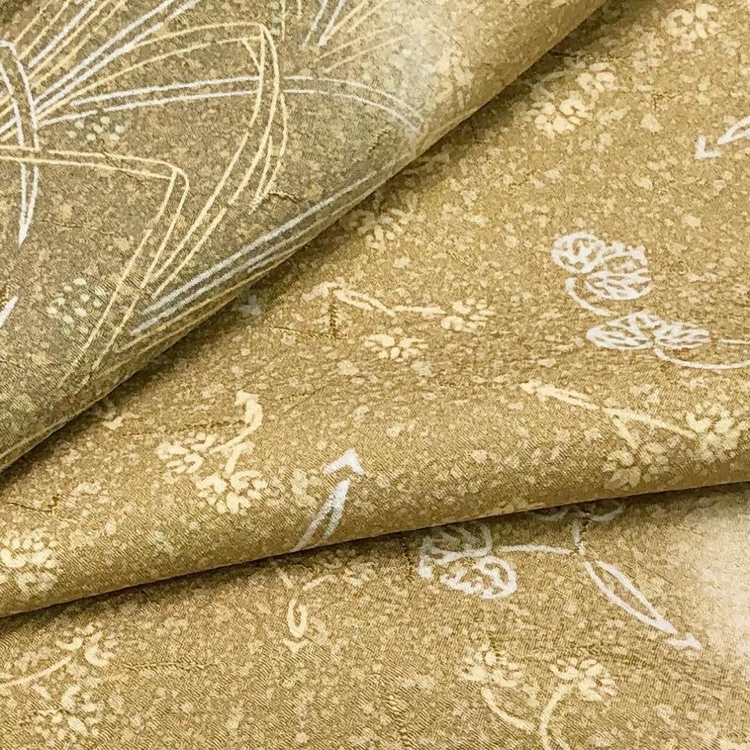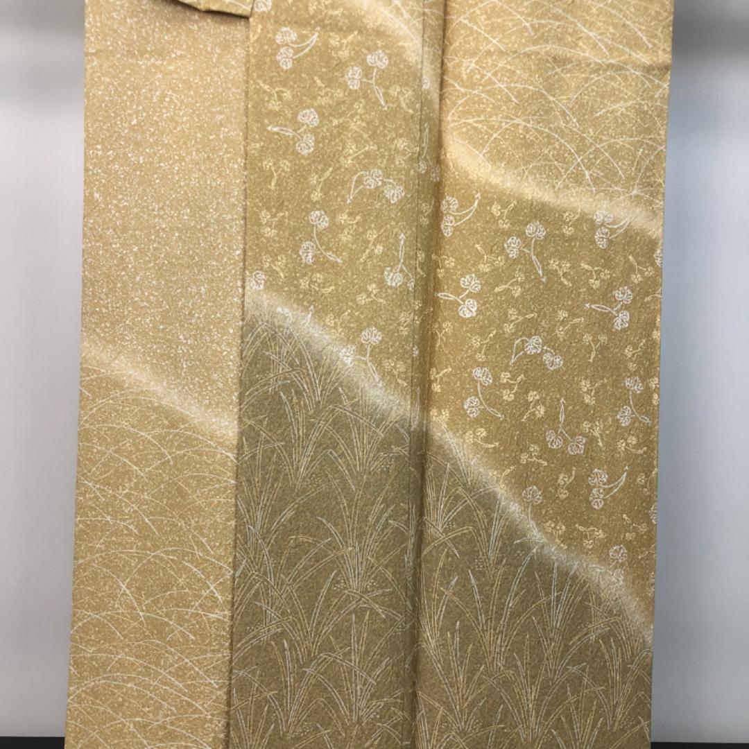 薄唐金色ベースのお色味に暈し、葉模様などの柄裄がデザインされた素敵なお品でございます。