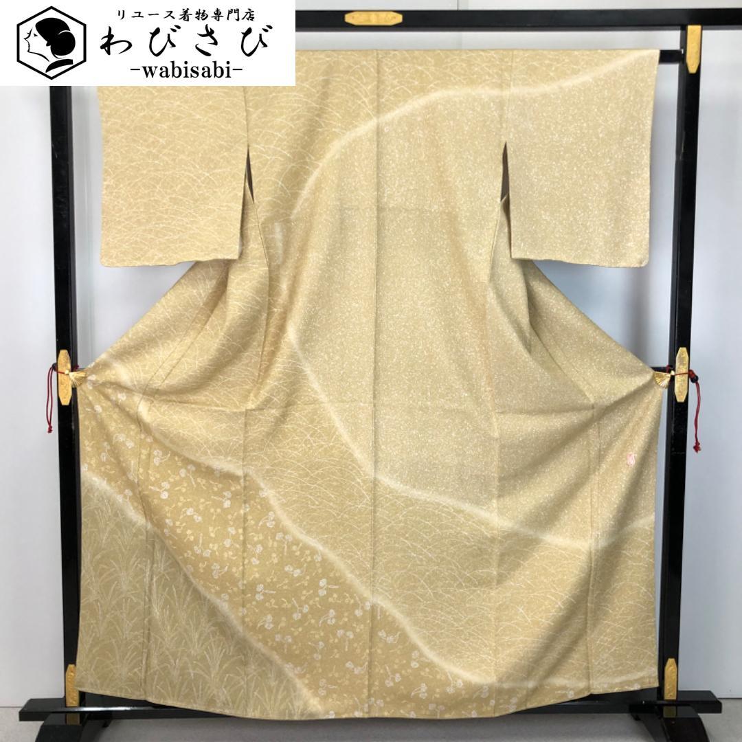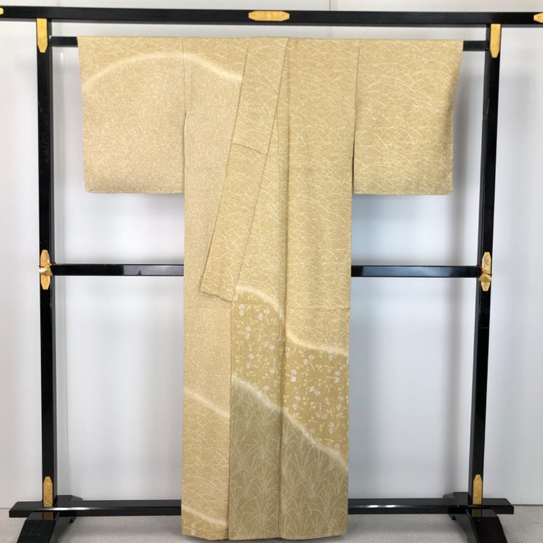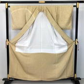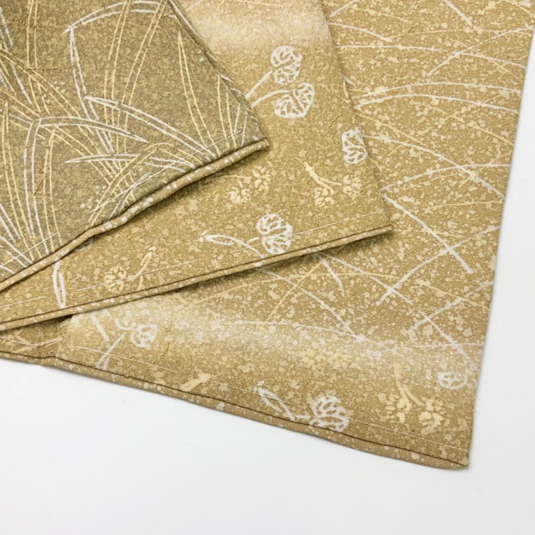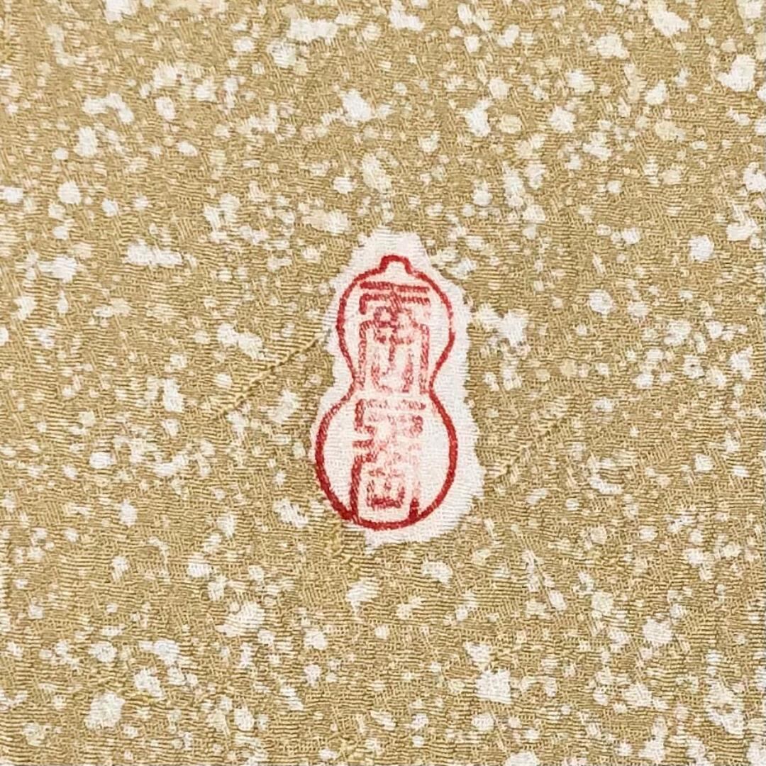 薄唐金色ベースのお色味に暈し、葉模様などの柄裄がデザインされた素敵なお品でございます。