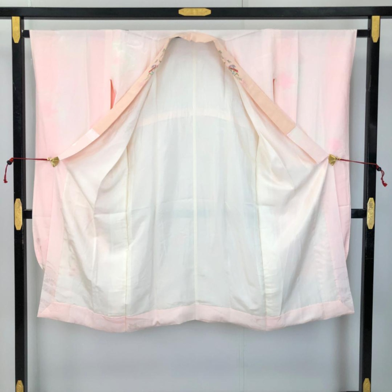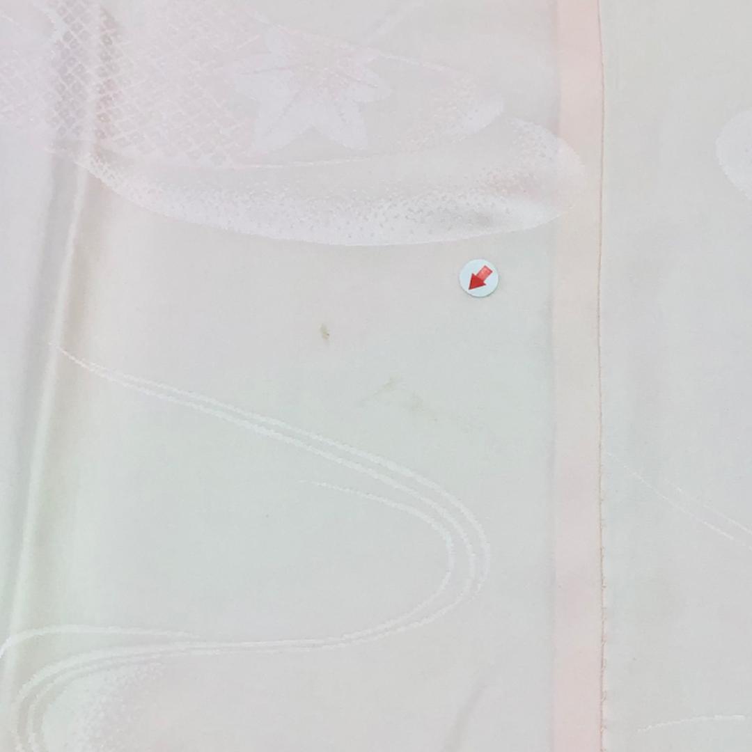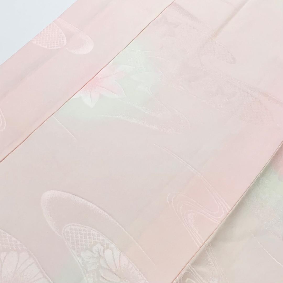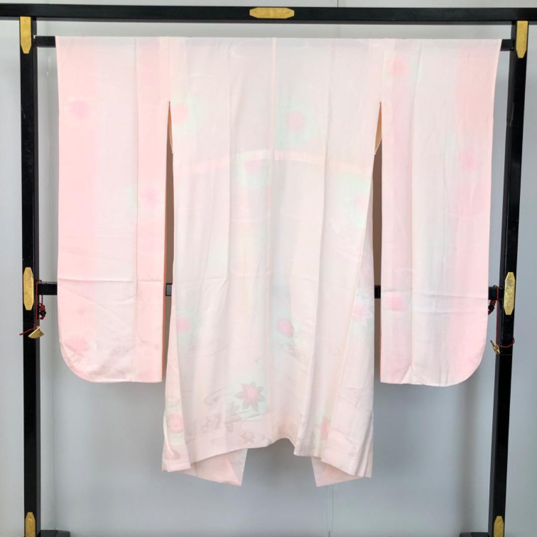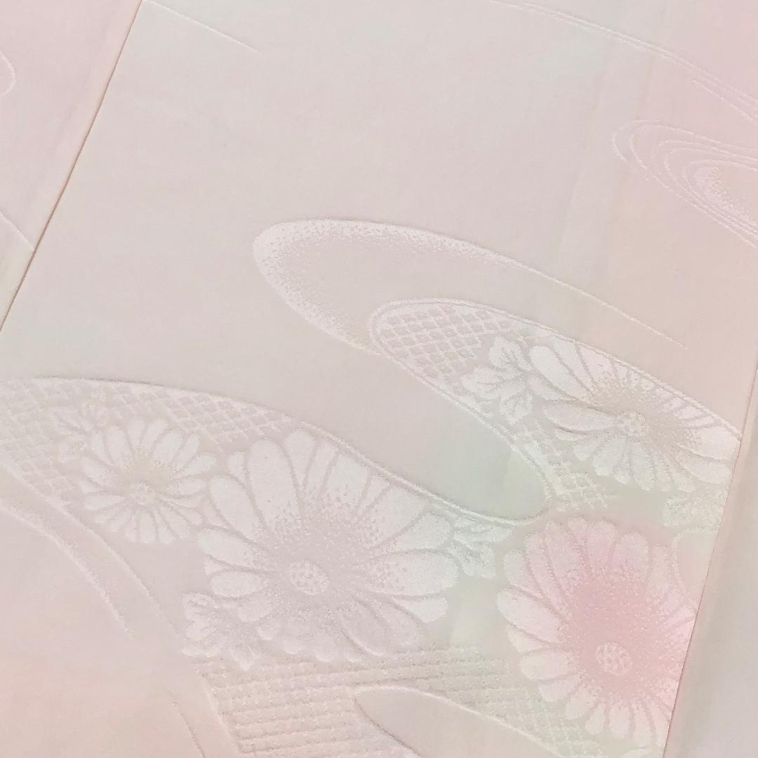 乙女色ベースのお色味に流水に花模様の柄裄がデザインされた素敵なお品でございます。