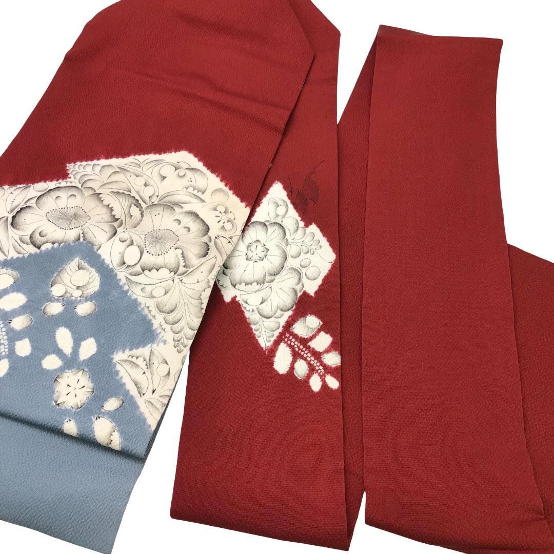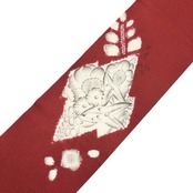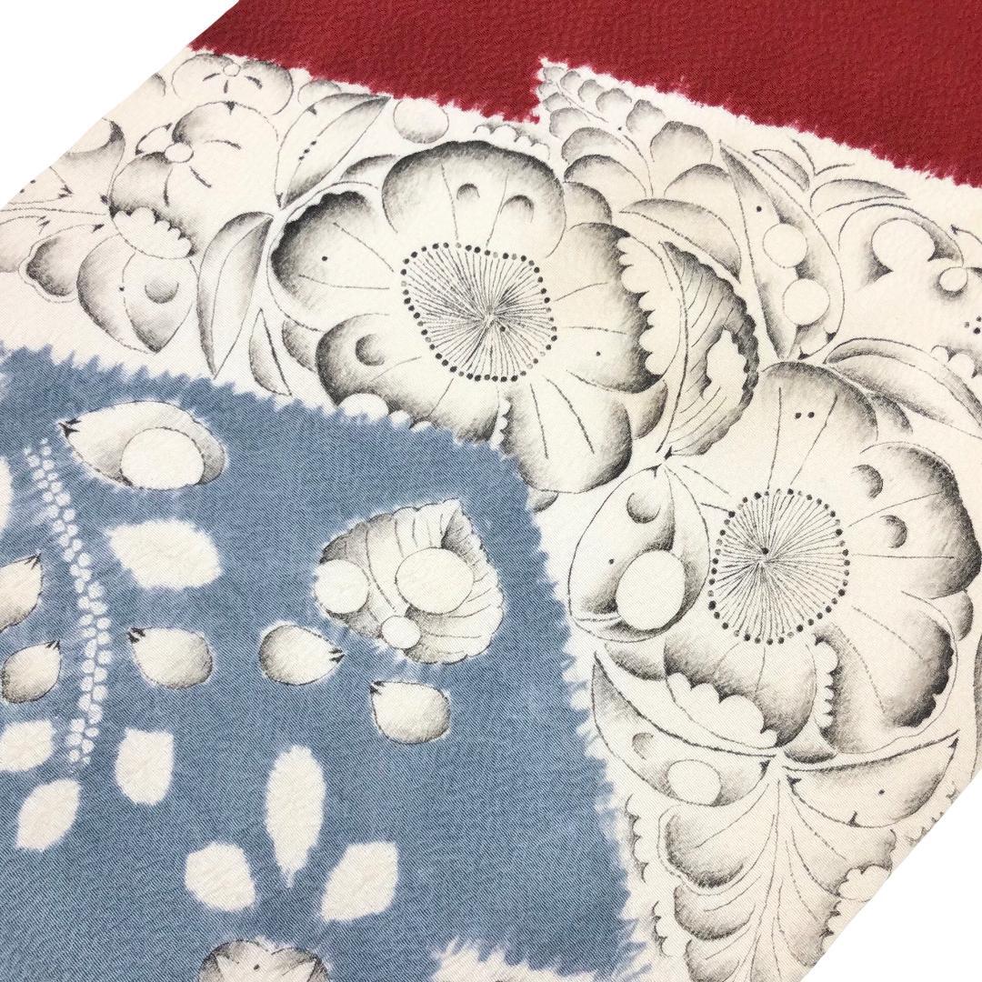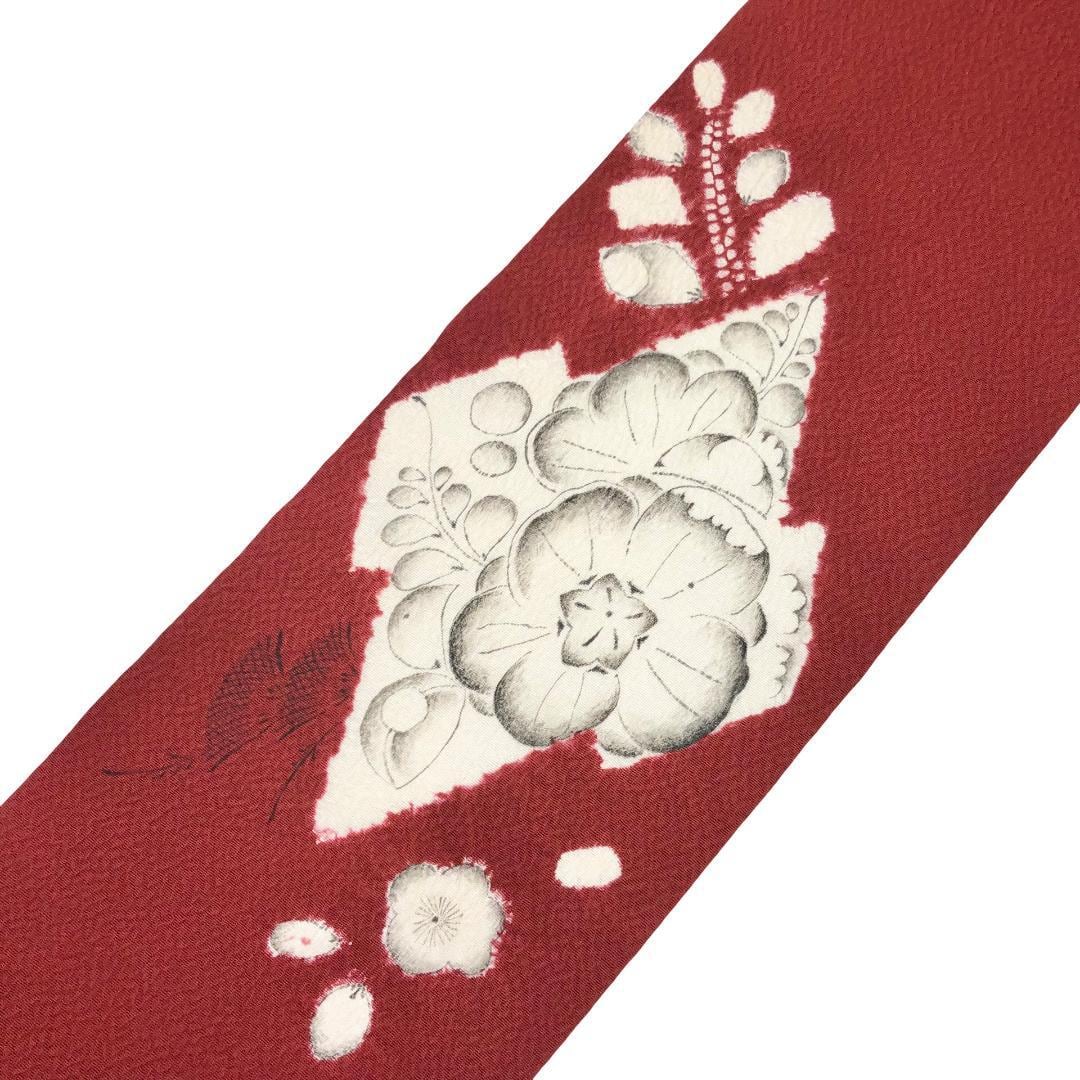 生臙脂色ベースのお色味の縮緬地に雰囲気の良い西洞院辻が花がデザインされた素敵な柄裄のお品でございます。