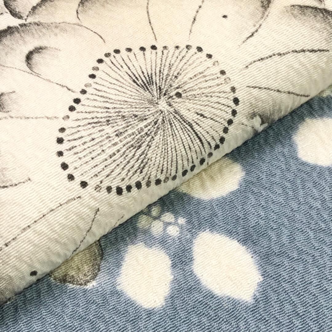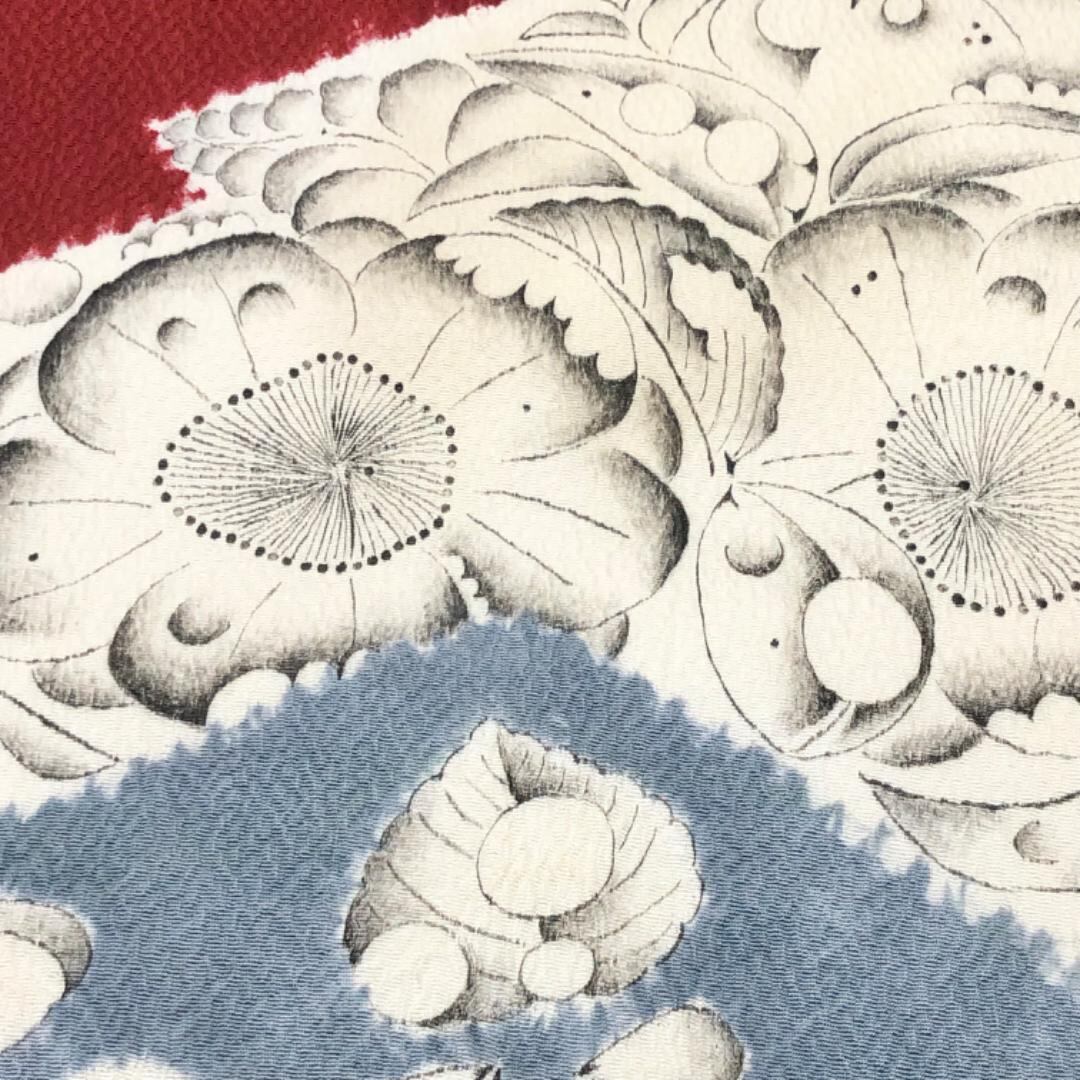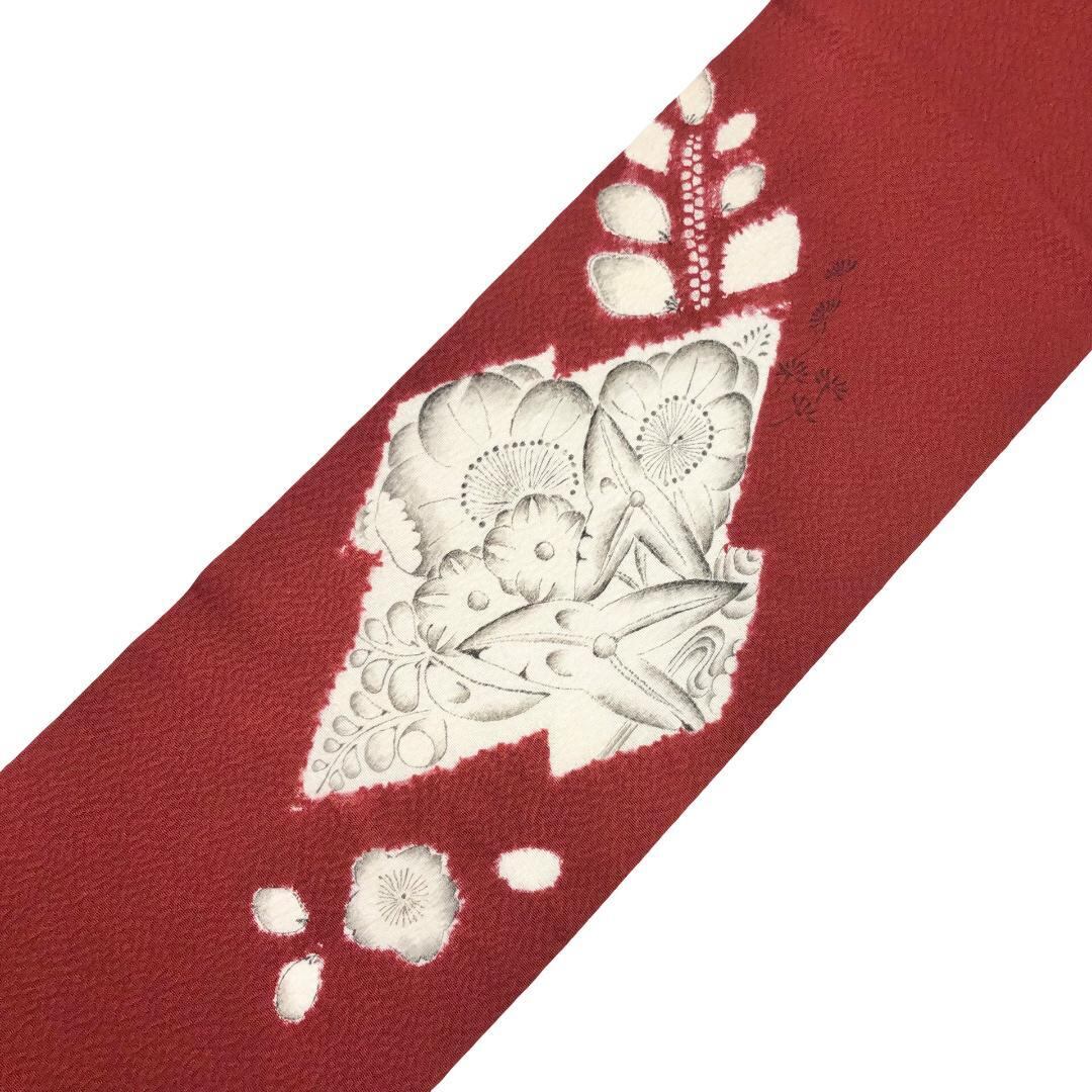 生臙脂色ベースのお色味の縮緬地に雰囲気の良い西洞院辻が花がデザインされた素敵な柄裄のお品でございます。