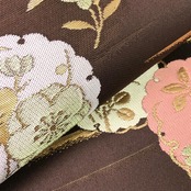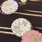 焦色の落ち着いたお色味に雪輪に花模様の柄裄がデザインされた素敵なお品でございます。