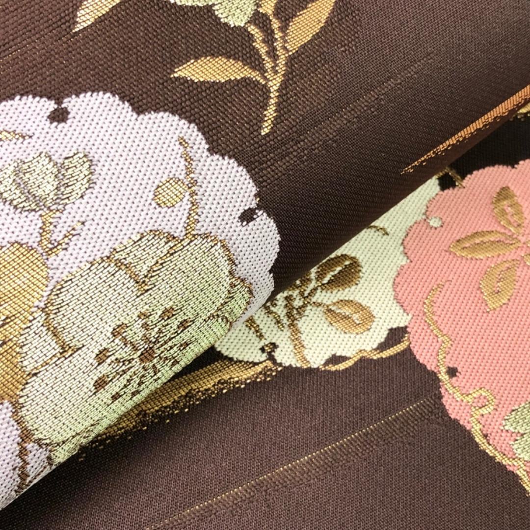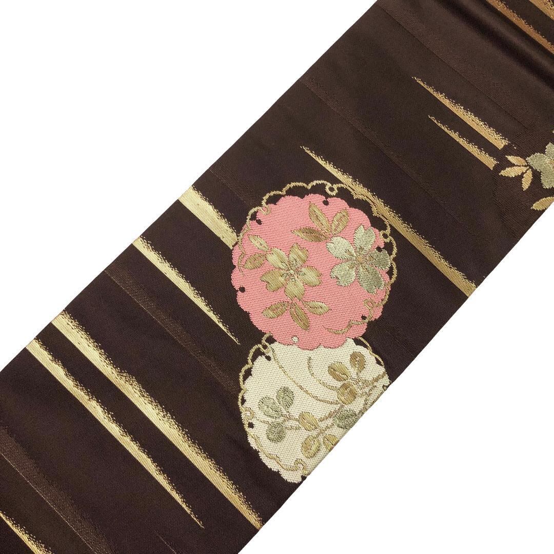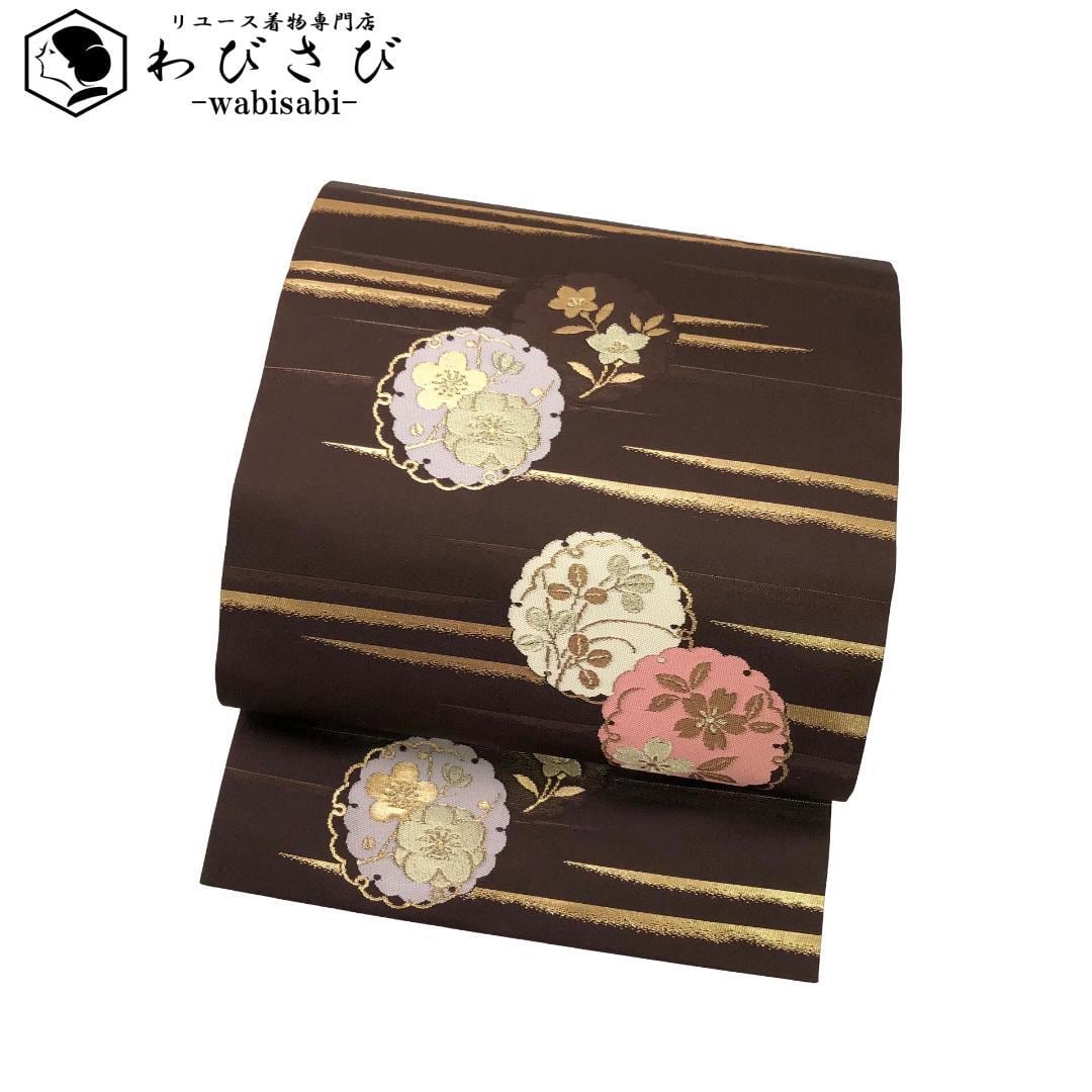 名古屋帯 雪輪に花模様 萩 金糸 焦色 O-5813 着物 きもの kimono 和服 和装 中古 リサイクル着物 【送料無料】