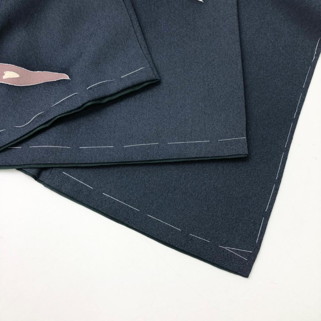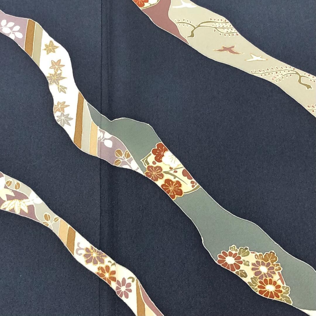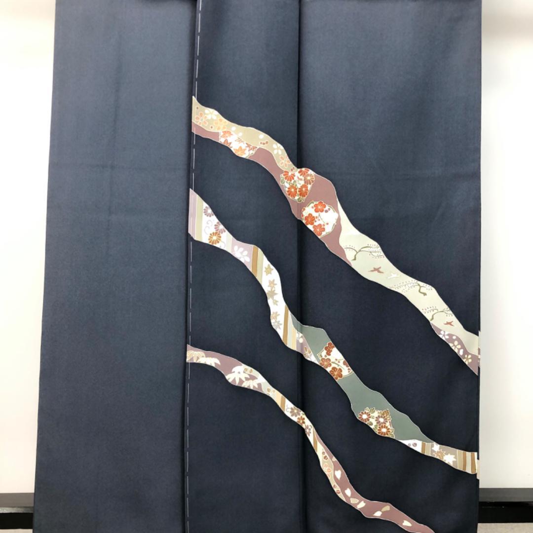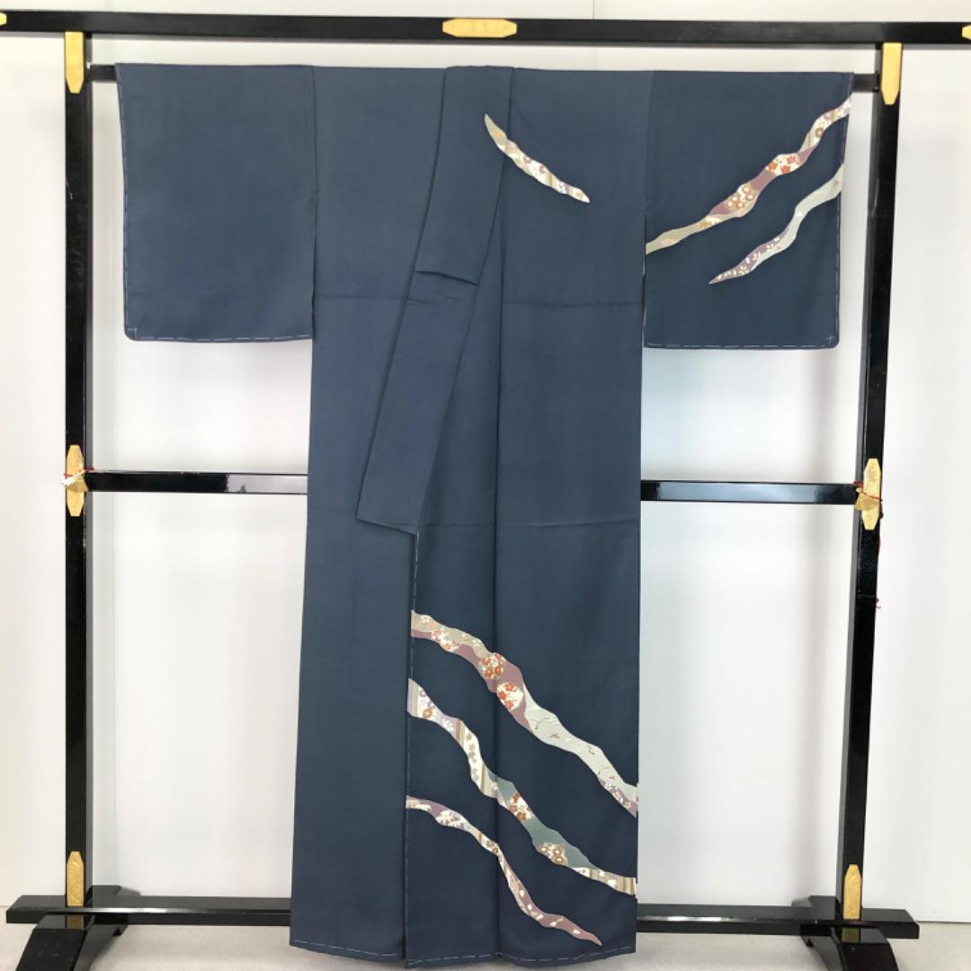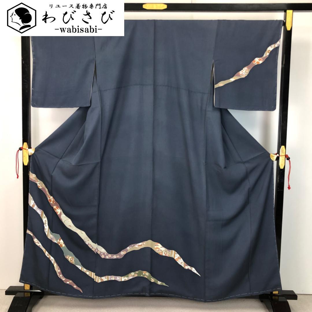 訪問着 道長取に花模様 鋼色 しつけ糸 ふくよかサイズ K-5578 着物 きもの kimono 和服 和装 中古 リサイクル着物 【送料無料】